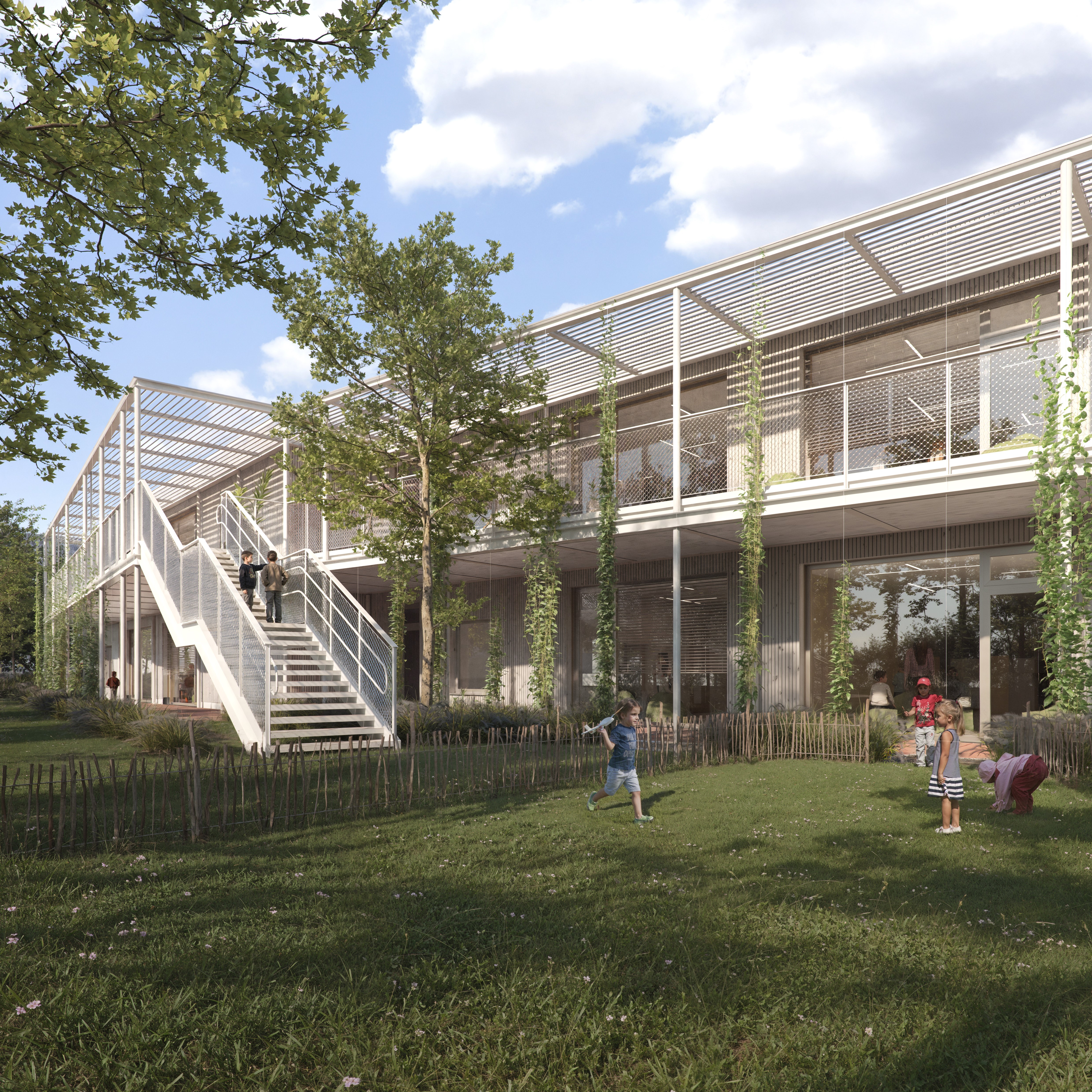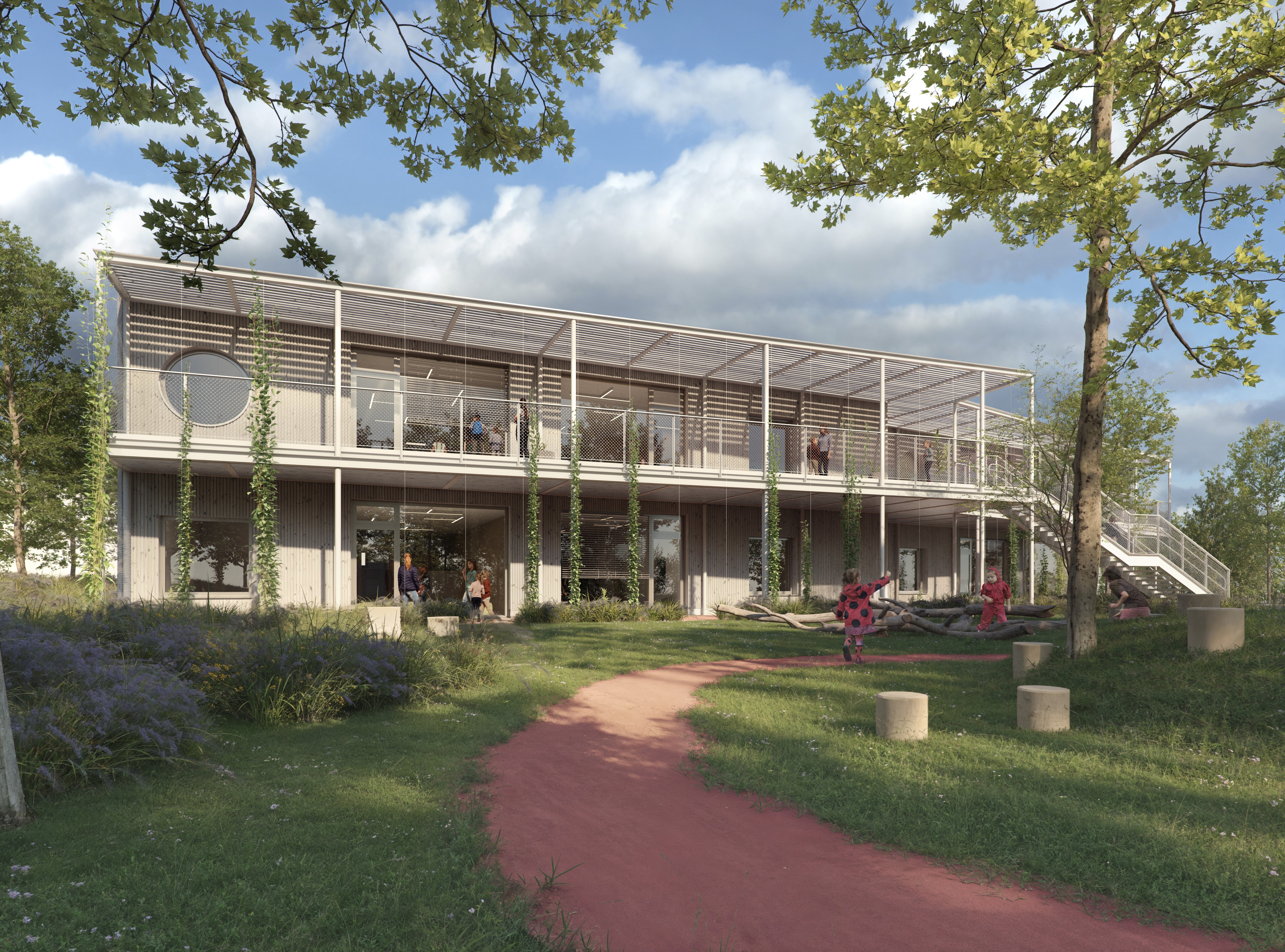 Das neue Gebäude wird am nördlichen Rand des Grundstücks situiert und öffnet sich nach Süden hin zur umgebenden Landschaft. Am Ende der Sackgasse sorgt ein Gebäuderücksprung für einen großzügigen, geschützten Vorplatz, der durch Baumpflanzung und Bankelemente von der Parkfläche getrennt wird. Es wird eine vielfältige unverwechselbare Welt für Kinder geschaffen. Ein Kindergarten der das Potential des Ortes mit den Anforderungen moderner Pädagogik verbindet. Es entsteht ein Ort mit wohnlichem Charakter in dem Gemeinschaft gelebt wird. Die einfache, klare Organisation erleichtert die Orientierung und schafft Übersicht und Offenheit.