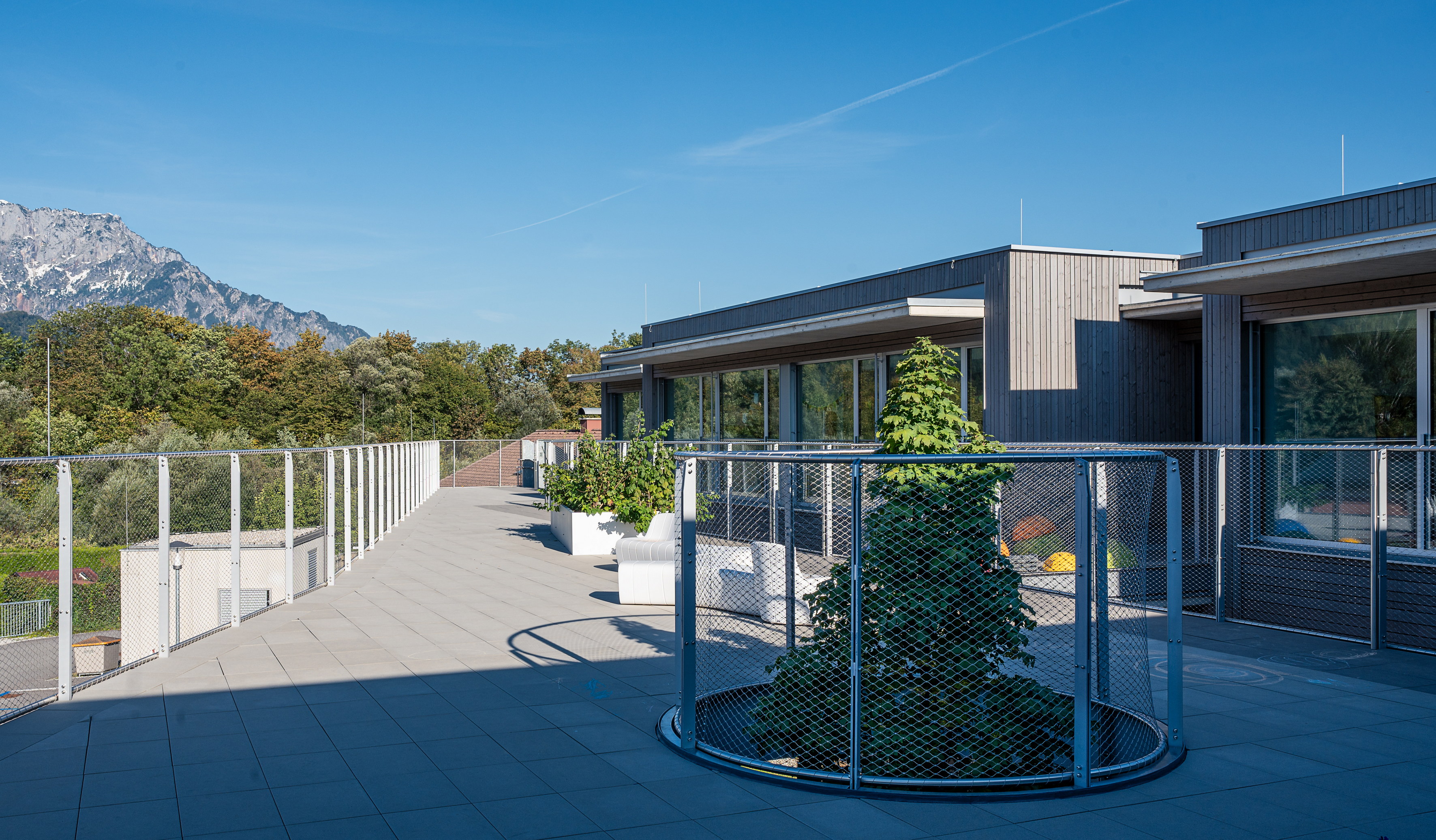 Unterschiedliche Freiraumqualitäten (Spieldeck, Terrasse, witterungsgeschützte Bereiche, Hofsituation, usw.) ermöglichen eine ganzjährige Nutzung des Außenraumes.