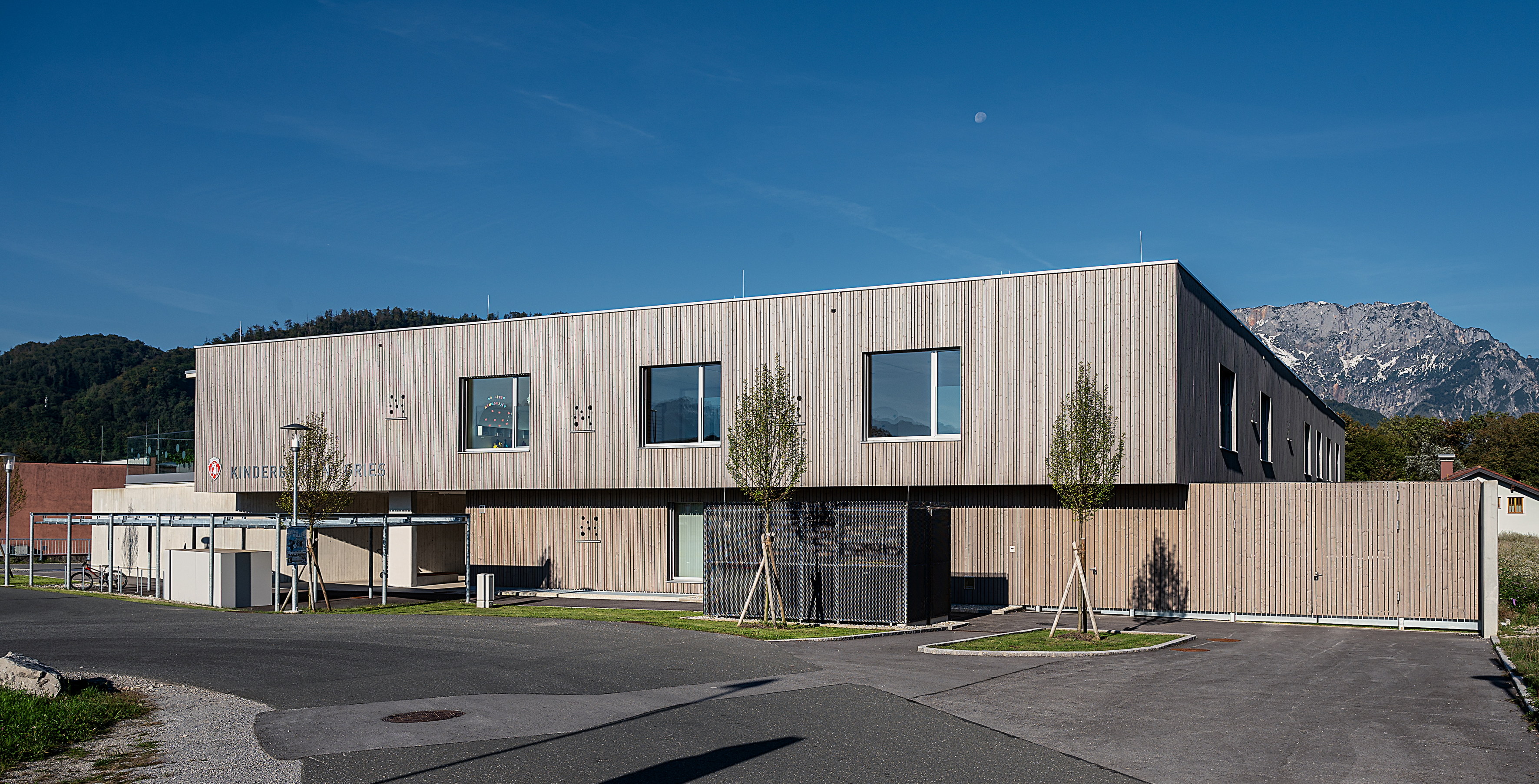 Der Kindergarten bietet Platz für 4 Krabbelgruppen im Erdgeschoß und 6 Kindergartengruppen im Obergeschoß. Alle Gruppenräume sind Richtung Süden, vom Lärm abgewandt hin zum geschützten Freibereich orientiert.