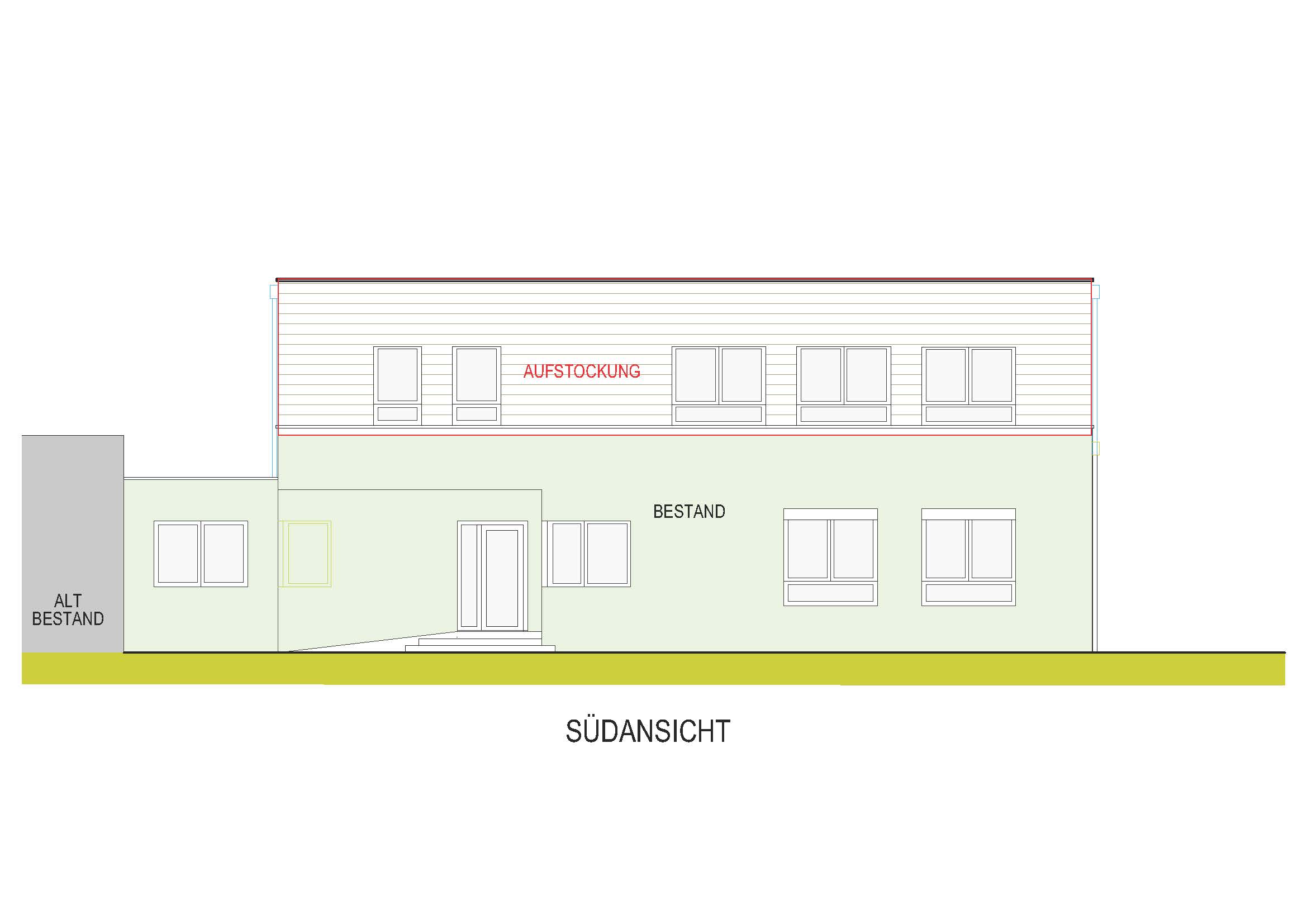 Der ursprünglich 2-gruppige Kindergarten war 2009 um eine Gruppe samt Bewegungsraum erweitert worden, damals wurde bereits eine mögliche Aufstockung berücksichtigt. Der 1. Stock mit Gruppe 4 und 5 wird in Holzriegelbauweise in 15 Wochen errichtet.