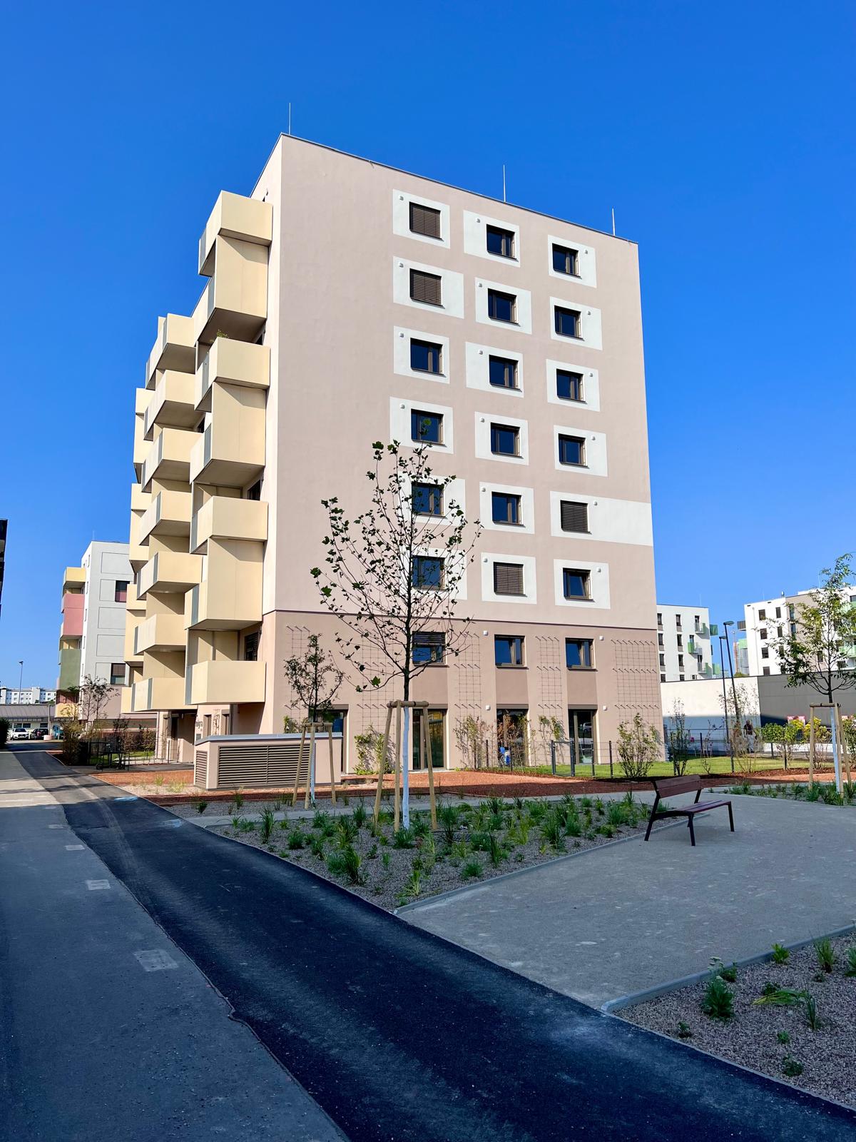 Hier auf den Bauplätzen C1 und C2 entstanden insgesamt 84 geförderte Wohnungen (davon 42 SMART Wohnungen). Jede der 2- bis 4-Zimmer-Wohnungen verfügt über großzügige private Freibereiche in Form von Balkonen, Loggien oder Eigengärten. Das Projekt profitiert von dem sehr hohen Grünanteil mit fußläufiger Durchwegung und attraktiven Freiräumen bei gleichzeitiger urbaner Lage.