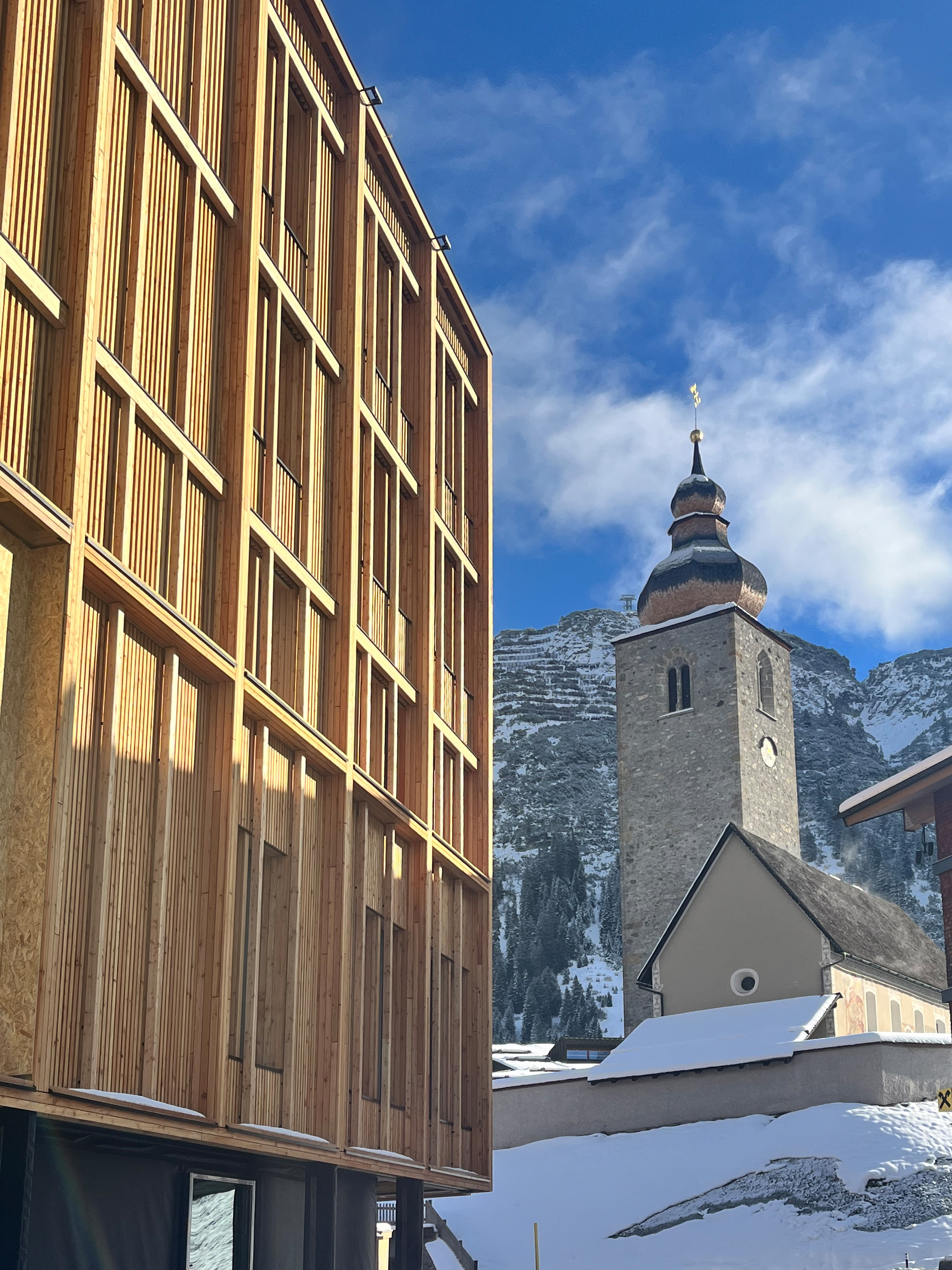 Zwei neue, gleichhohe Gebäude bilden mit der bestehenden Anhöhe der Kirche St. Nikolaus einen Dorfanger, welcher einen erlebbaren kommerziellen Knotenpunkt schafft. Sie dienen unterschiedlichste Interessensgruppen, die in starken ortsräumlichen und nutzungsübergreifenden Bezügen stehen und trotzdem selbständige Einheiten bilden.
