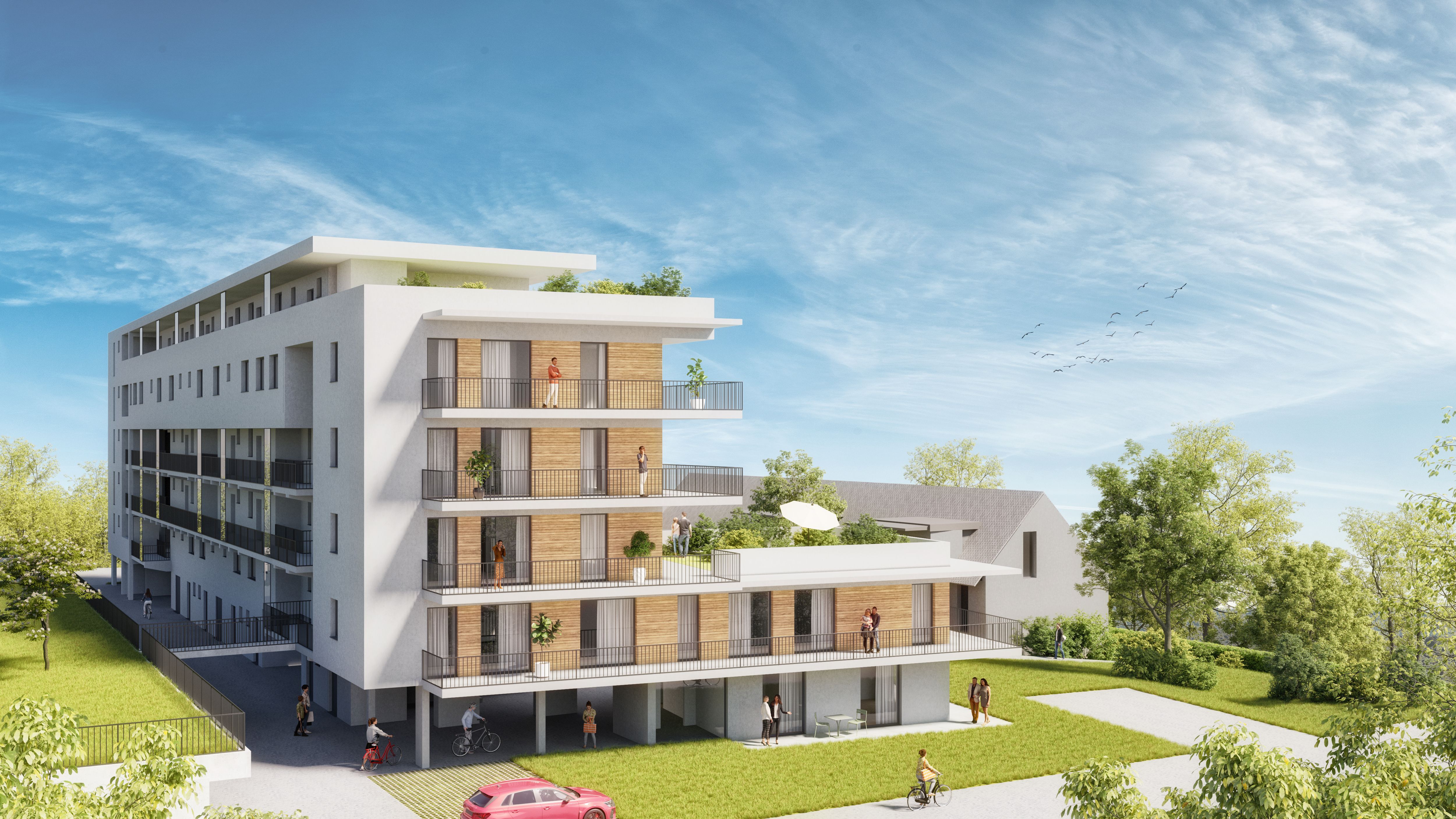 Bei dem Projekt handelt es sich um einen Geschoßwohnungsbau mit insgesamt 42 Einheiten, der eine bestehende, teilweise in der Ortbildschutzzone befindliche Siedlung ergänzt.