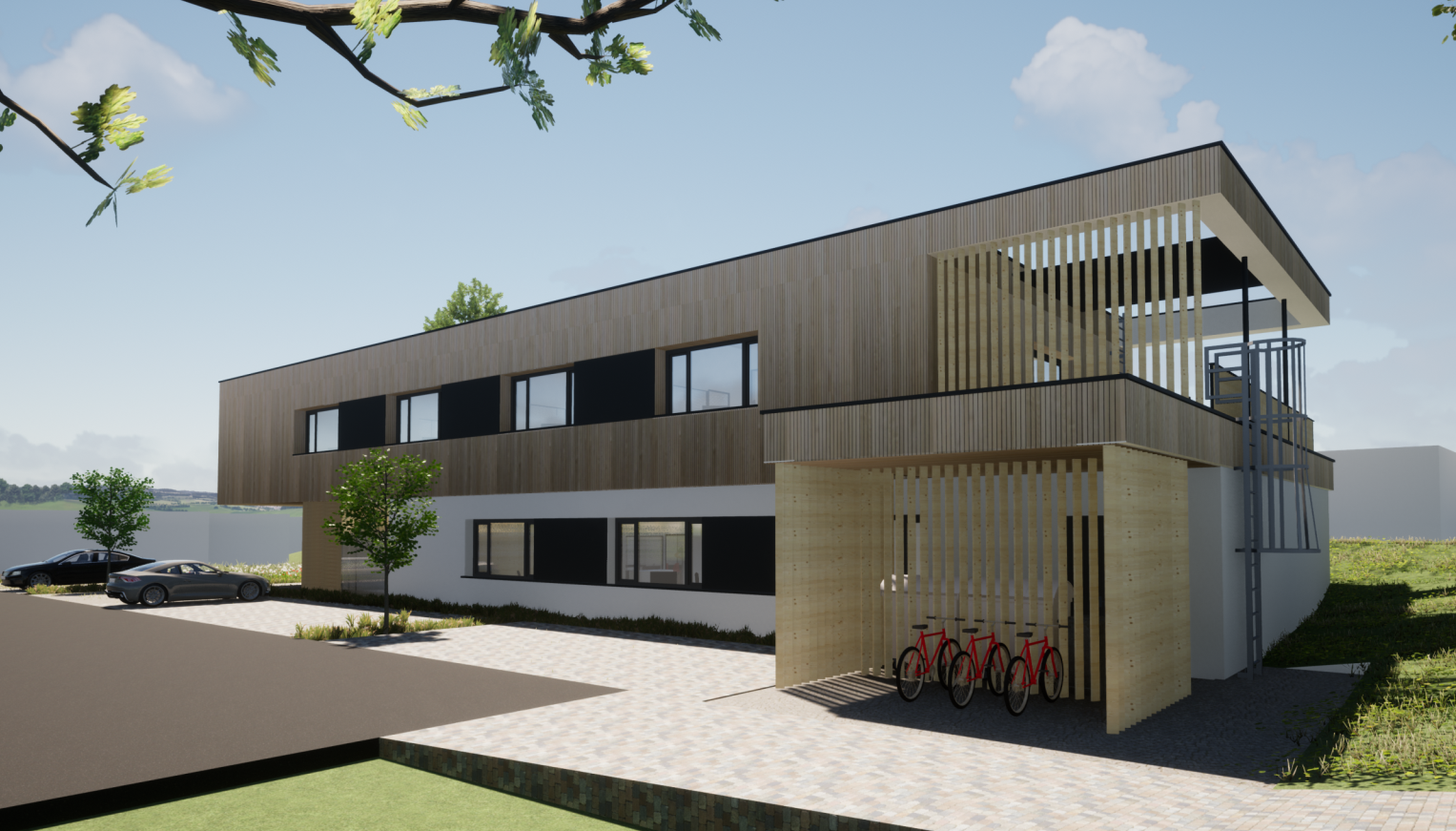 Errichtung eines zweigeschoßigen Bürogebäudes mit PKW-Stellplätzen, einem überdachten Müllplatz und Fahrradabstellplatz, einer PV-Anlage am Dach des Bürogebäudes (Leistung ca. 30kWp) und notwendige Geländeveränderungen.