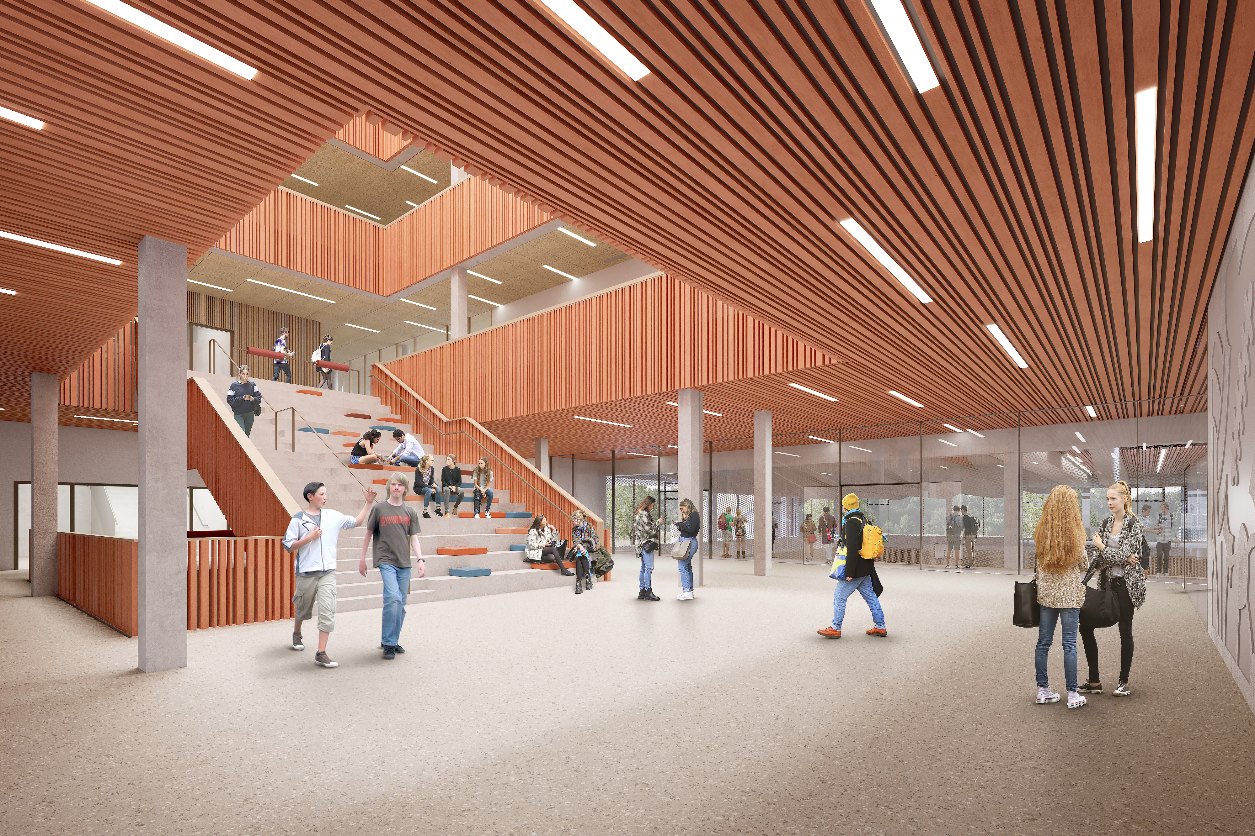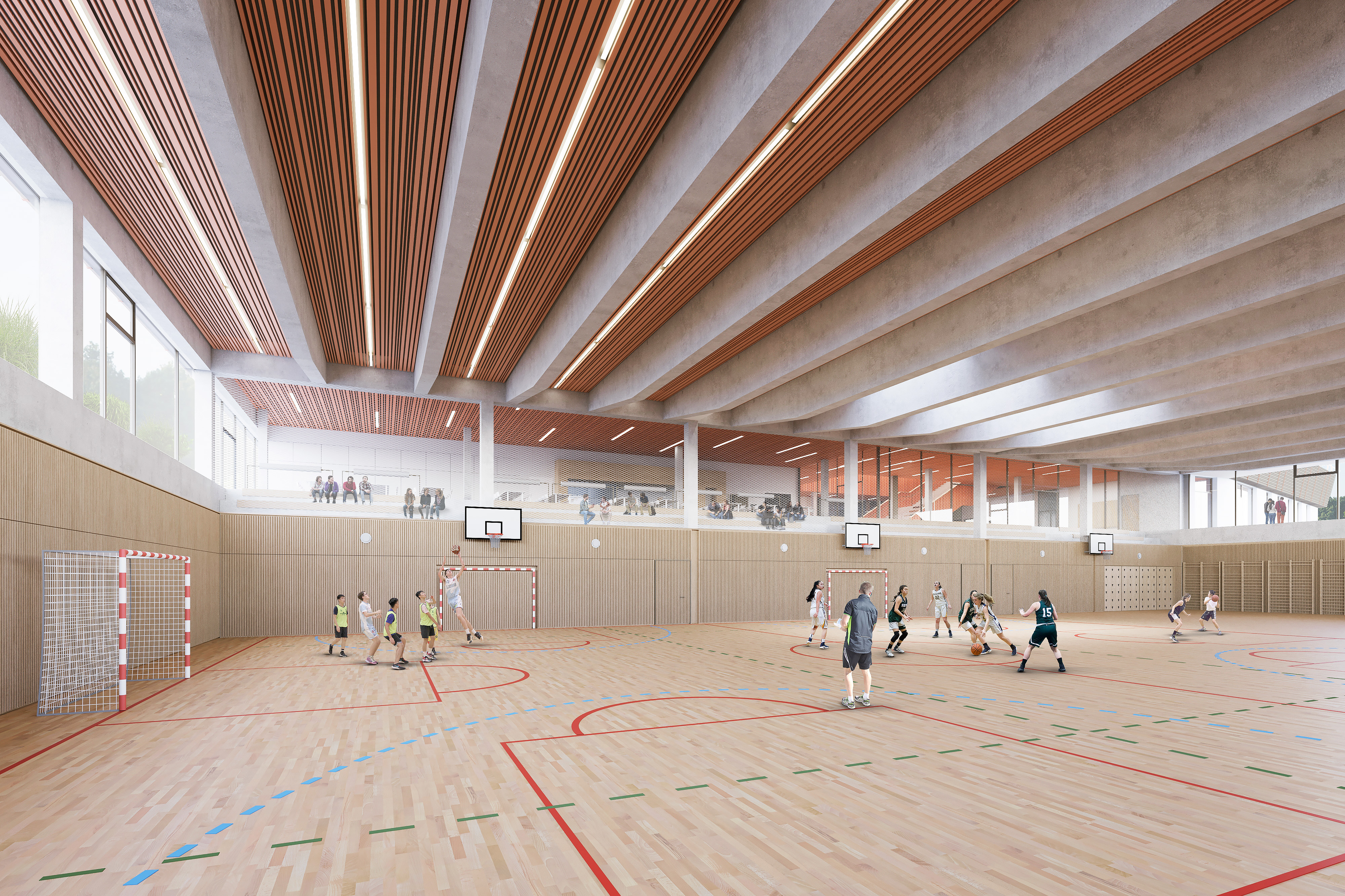 Das viergeschossigen Oberstufengymnasiums befindet sich im Stadtentwicklungsgebiet „Viola Park“. Der moderne Schulkomplex verbindet eine integrierte Dreifach-Sporthalle mit begrüntem Dach, das als grüne Oase das Mikroklima verbessert und zugleich Aufenthaltsqualität bietet. Die Fassadengestaltung mit Holz und durchgehenden Fensterbändern optimiert die natürliche Belichtung, während die Erdgeschosszone mit vertikaler Begrünung ausgeführt wird.