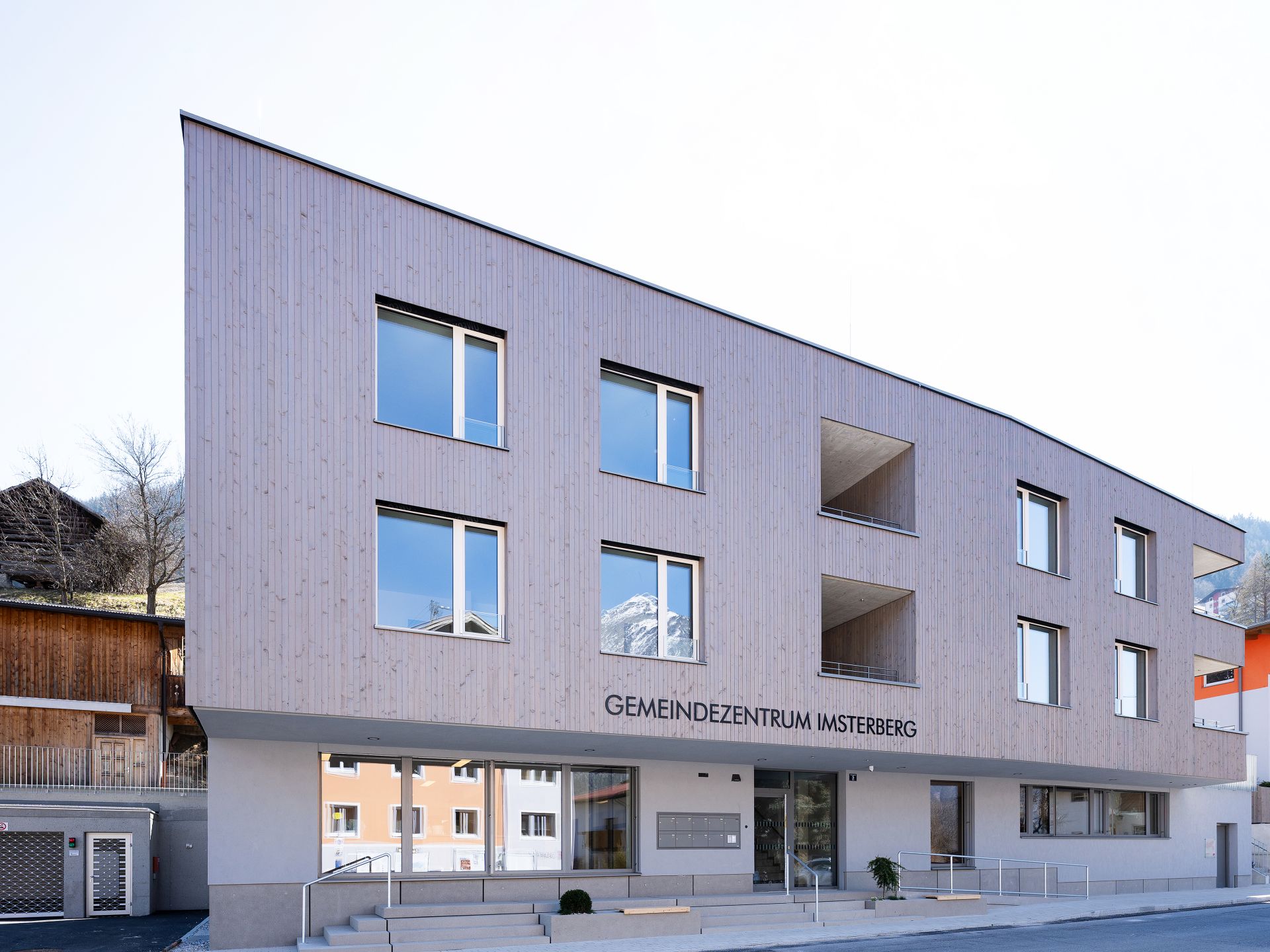 Der Baukörper über dem Untergeschoss, gliedert sich in das Gemeindehaus (im Erdgeschoss) und einen, über das Erdgeschoss nordwestlich hinausragenden Wohntrakt. Der überdachte Außenbereich, ausgebildet mit Rampen und Treppen, führt zum Haupteingang des Gebäudes, welches zum Straßenraum leicht angehoben wurde. Das Gemeindehaus kann vom zentralen Treppenhaus aus betreten werden. Im Erdgeschoss befinden sich auch die separat erschlossenen Nebenräume, wie Fahrrad- Müll und Technikraum. In den 2 Obergeschoßen wurden insgesamt 4 2-Zimmer-Wohnungen und 4 3-Zimmer-Wohnungen mit Loggien errichtet. Das Gebäude ist mit einem Flachdach gedeckelt, jedoch wurde die Attika schräg/mit unterschiedlicher Höhe ausgebildet.