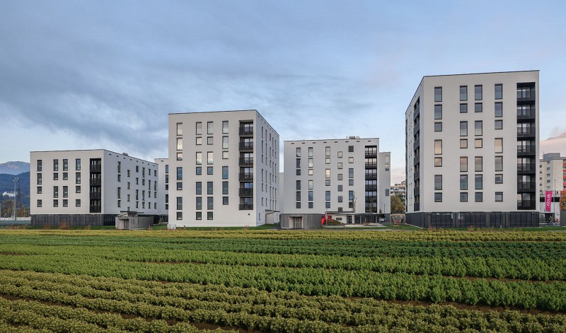 Österreichs größtes Passivhaus PLUS-Wohnquartier mit zukunftsweisender, höchst energieeffizienter Bauweise und maximaler Einbindung erneuerbarer Energien an den Gebäuden samt umweltfreundlichen Batteriespeichern konnte in Rum bei Innsbruck errichtet werden. Fünf rechteckige Baukörper mit in Summe 134 Wohnungen wurden gleichmäßig über das Grundstück verteilt und in der Höhe, von Norden nach Süden gestaffelt.