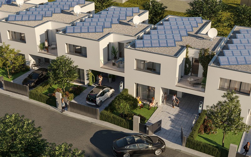 Die Reihenhausbebauung unterteilt sich in zwei Abschnitte.