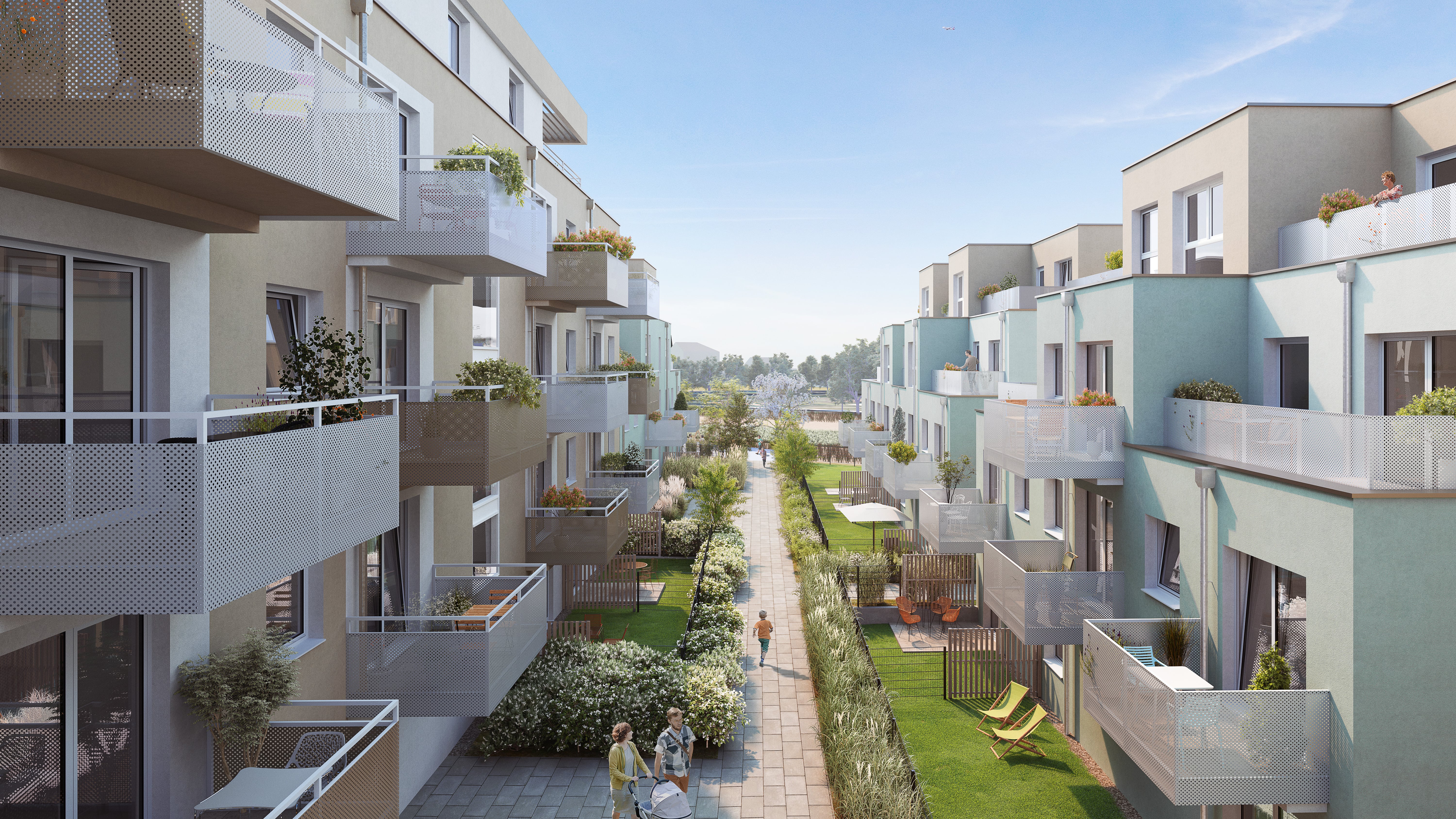 Auf dem Bauplatz befindet sich eine Wohnanlage mit acht Gebäuden, 318 Wohnungen und einem Mehrzwecklokal. Das Areal ist im Inneren autofrei gestaltet, mit mehreren fußläufigen Durchwegungen zum Rosa-Jochmann-Ring und Leberweg. Sämtliche Hauptwege sind barrierefrei. Die topografische Höhenentwicklung des Geländes wird über die Freiraumplanung zoniert.