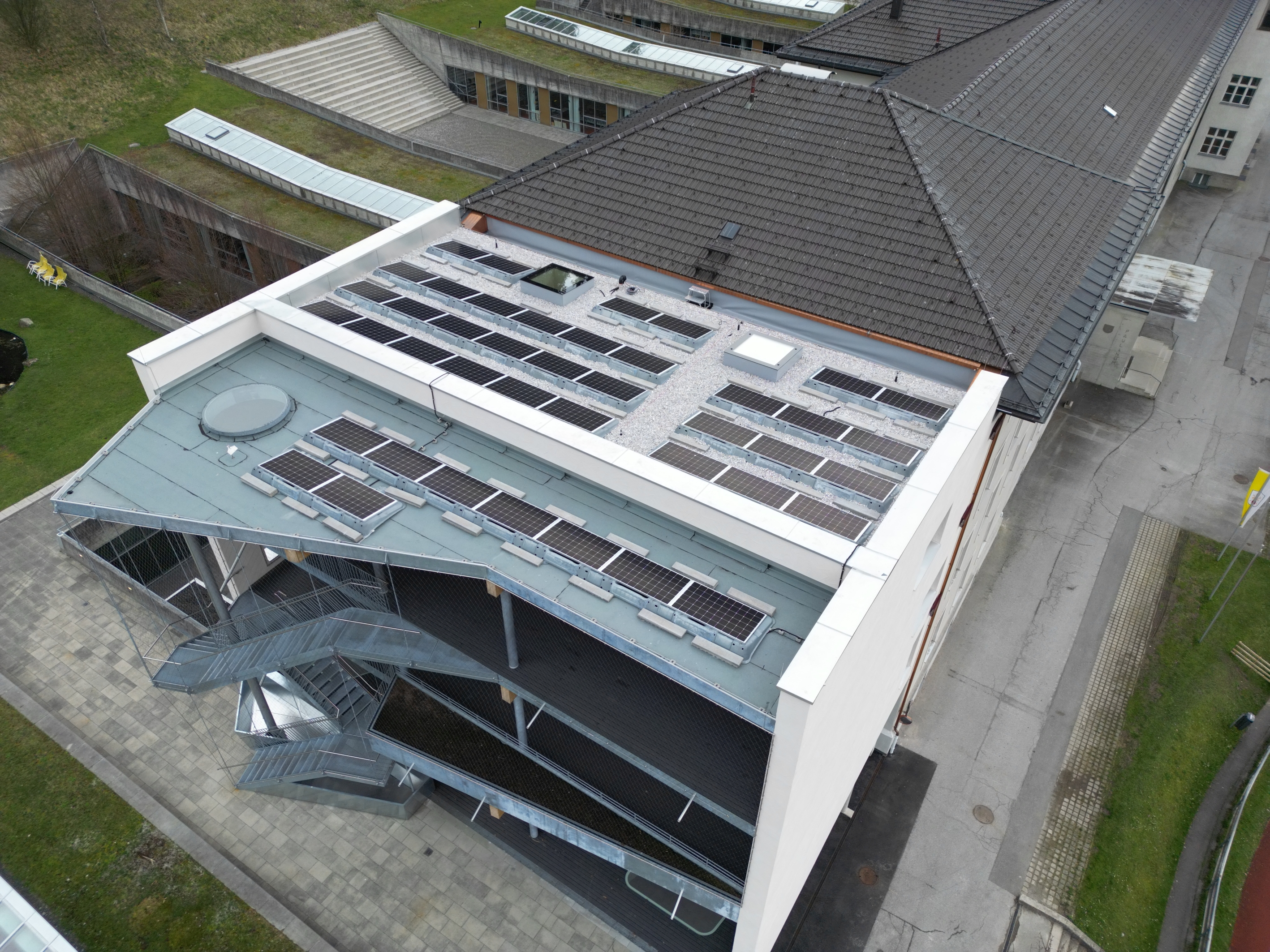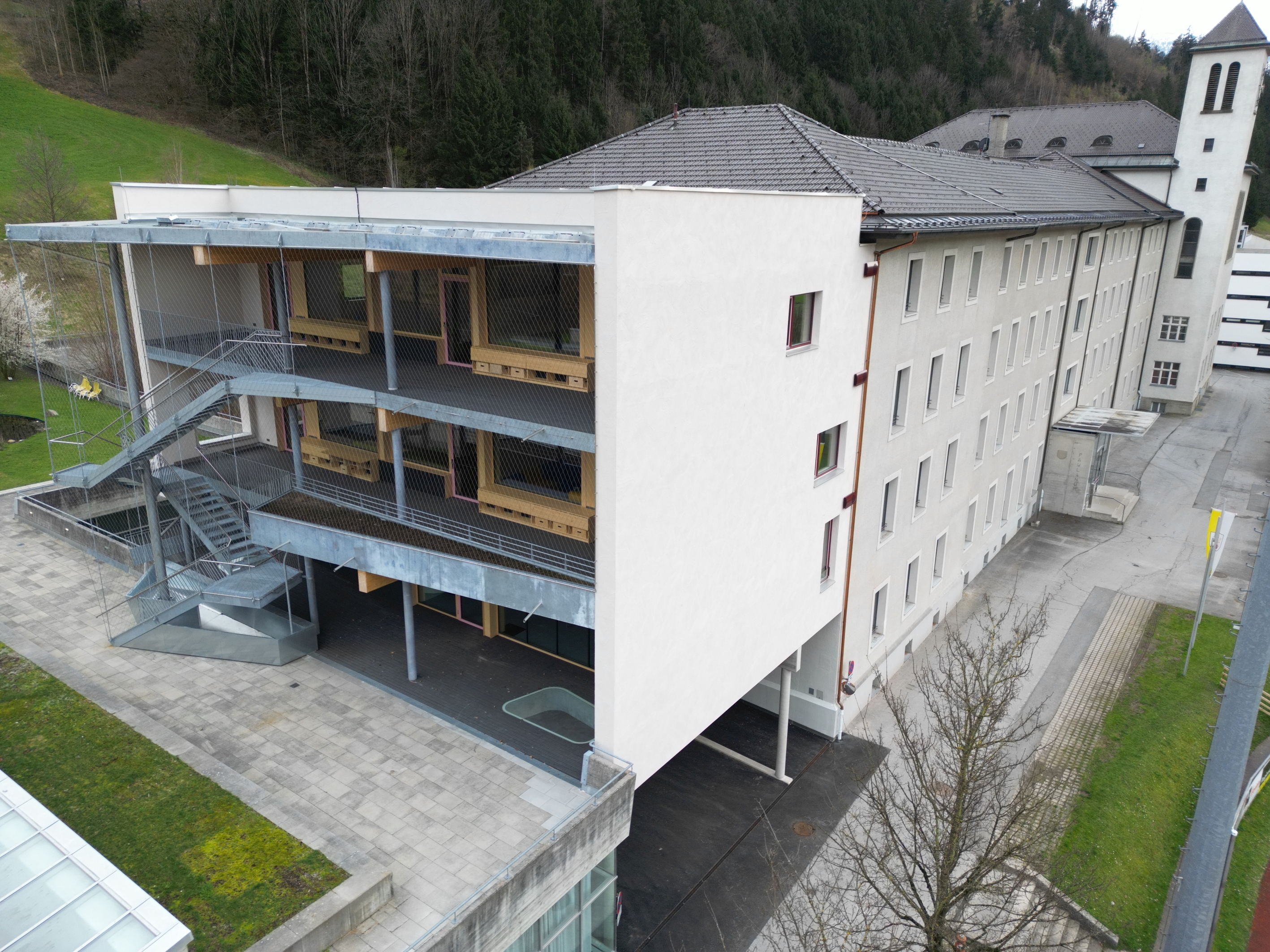 Beim Zubau Paulinum handelt es sich um einen dreigeschossigen Zubau in Massivholzbauweise, welcher auf Stelzen auf einer Betondecke sitzt. Darunter befindet sich die erforderliche Feuerwehrzufahrt in den Innenhof des Bestandsgebäudes. Auf der nördlichen Seite des Gebäudes wurden auf jedem Geschoss großzügige Terrassen vorgelagert, die als Outdoorunterrichtsflächen dienen. Zwischen Terrassen und Homerooms (Ausweichklassen) wurde verglast, um den Blick auf die begrünte Fassade freizugeben, welche die Terrassen einfasst und als Absturzsicherung dient. Das Dach des Gebäudes wurde als Flachdach ausgebildet, auf welchem sich die PV-Anlage zur Stromgewinnung befindet. Das gesamte Projekt wurde mit einem Produkt- und Chemikalienmanagement begleitet und auf die Auswahl ökologischer Materialien und besonders ökologischer Dämmstoffe wurde großen Wert gelegt. Diese Bemühungen wurden mit Bestwerten beim Raumlufttest belohnt.