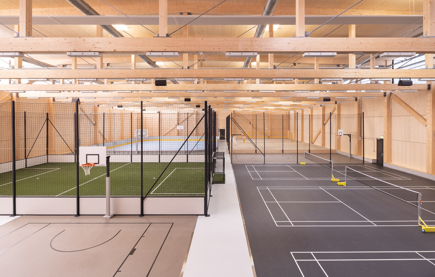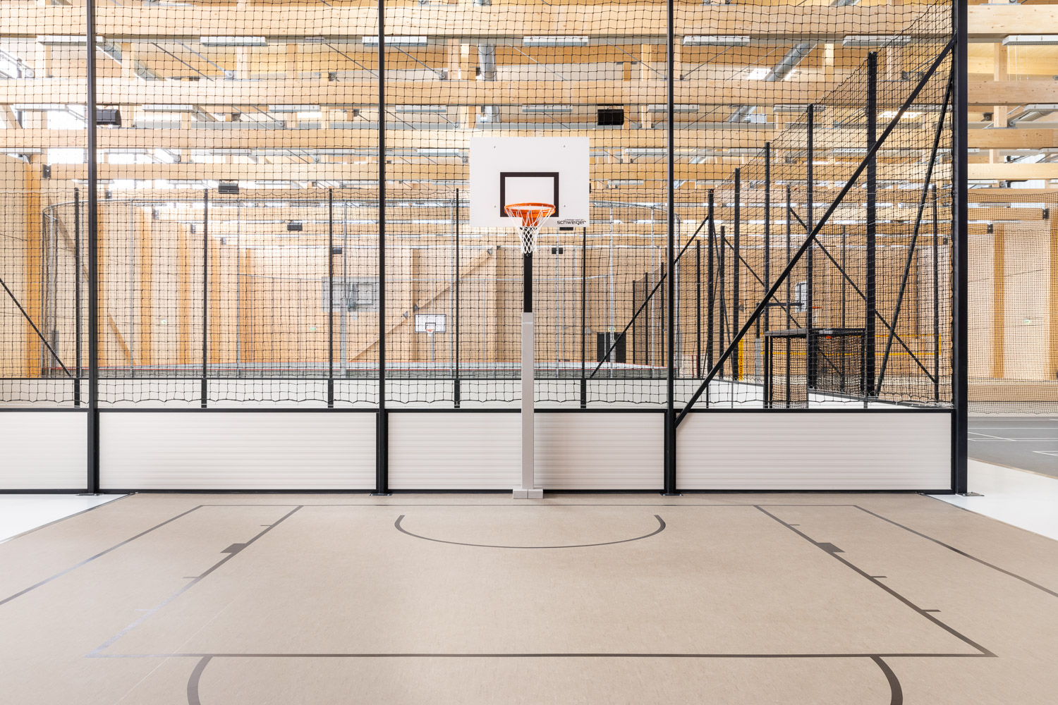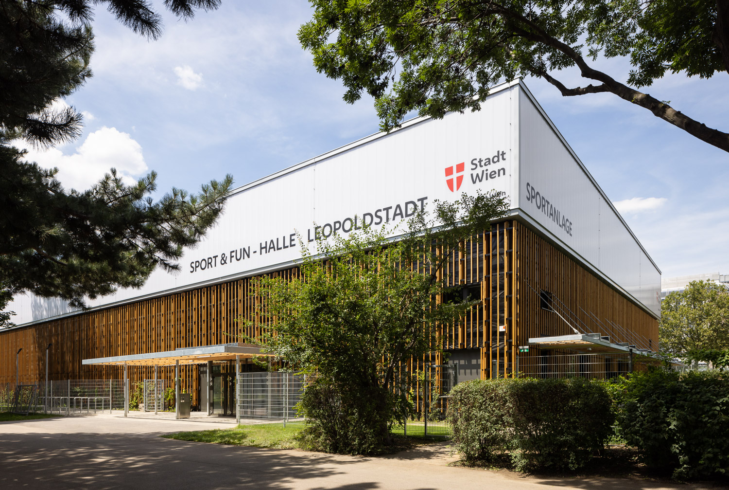 Das Sportangebot im Projektgebiet wird durch die Herstellung einer modernen und energetisch hochwertigen neuen Sport & Fun Halle ausgebaut. In der Fun und Sporthalle Engerthstraße werden die Sportfunktionen der Bestandsjugendanlage und der alten Sport & Fun Halle, welche aufgrund des neuen Fernbusterminals abgerissen wurde, kombiniert und erweitert. Das ca.13m hohe Gebäude der Sport & Fun Halle ist als höchst ökologischer Bau konzipiert. Eingebettet in ein grünes Umfeld mit wertvollem Baumbestand, fügt sich die Halle mit der ca. 7m hohen, flächig bewachsenen Grünfassade selbstverständlich in die Umgebung ein. Es handelt sich um einen Holzbau im Sporthallenbereich, die Nebenräume sind als mineralischer Bau in Stahlbeton ausgeführt.