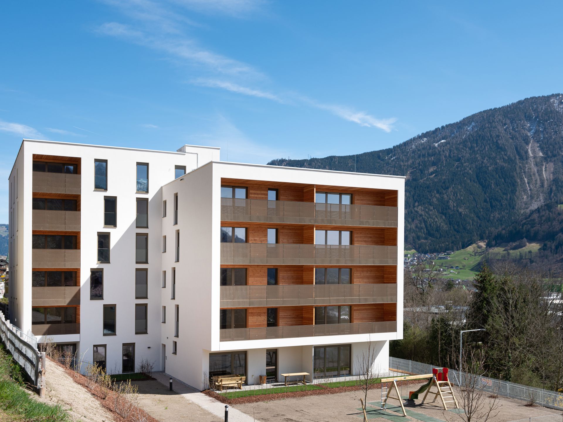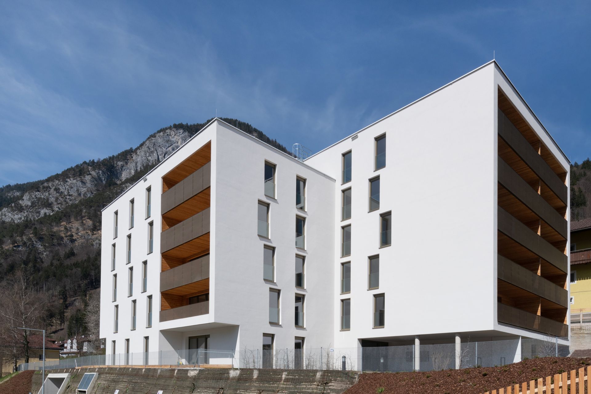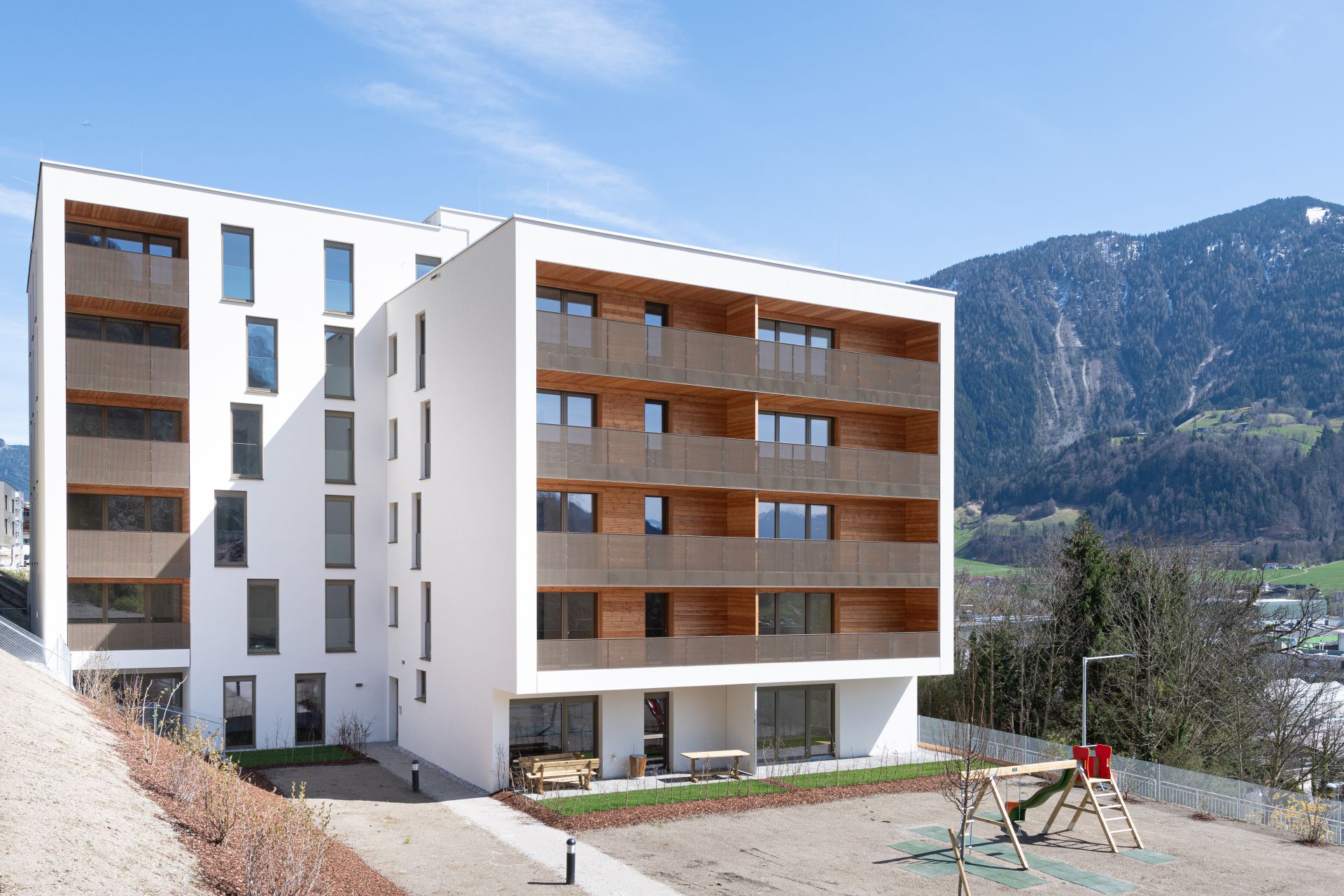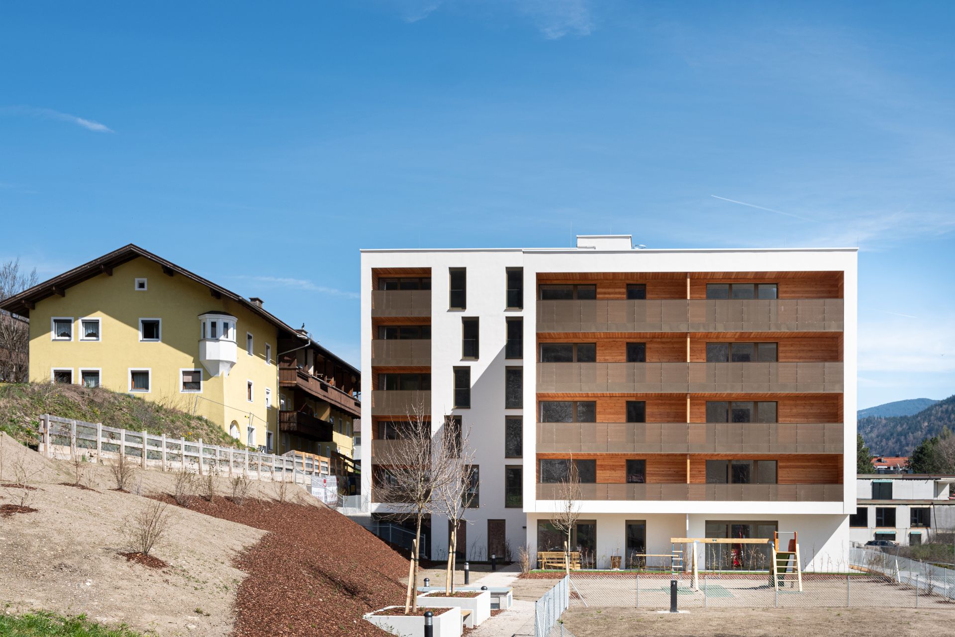 Das Gebäude ist Teil der städtebaulichen Initiative „Tratzbergsiedlung“, welche sich westlich des Ortszentrums von Jenbach befindet. Es sind in dieser Baustufe 32 Wohnungen entstanden. Bei diesem Wohnbau handelt es sich um zwei ineinander geschobene Quader welche in der Höhe gestaffelt sind. Die sich dabei ergebende Schnittmenge bildet den gemeinsamen Erschließungskern. Im UG befinden sich die Tiefgarage sowie Technik- und Nebenräume (Kellerabteile, Müllraum, Elo-/Batterieraum, Hausmeisterraum, Kinderwagenabstellraum).