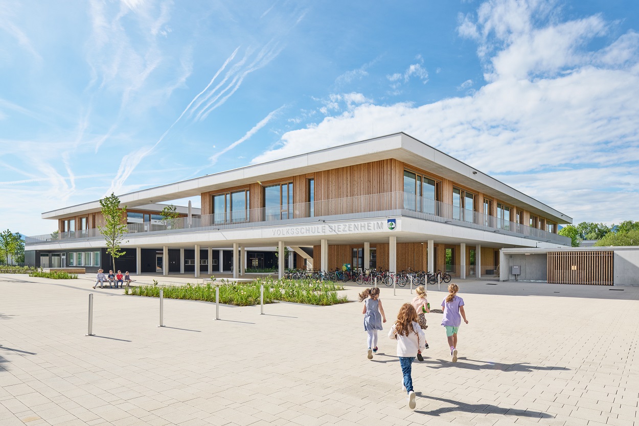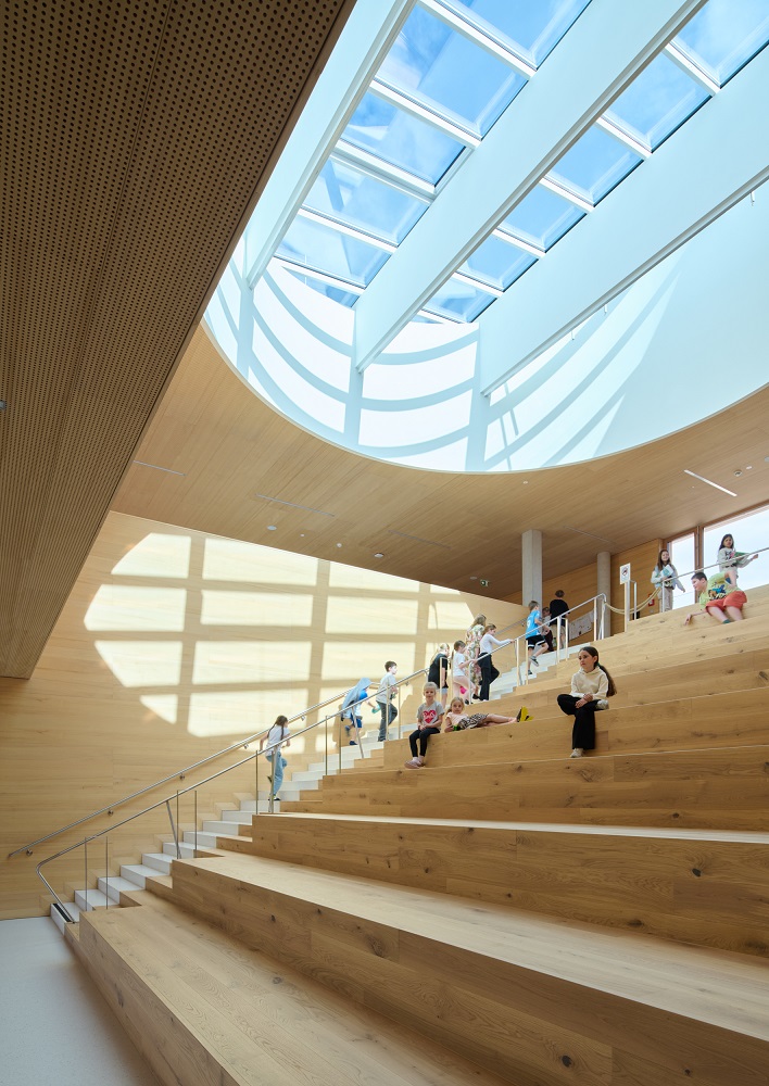 Die neue Volkschule punktet mit einer großzügigen Lernlandschaft mit Lerninseln und Terrassen, fließenden Raumübergängen, die innen und außen verbinden, Freiflächen für Schulkinder mit Obstbäumen und einem Naschgarten sowie einem ausreichenden Platzangebot für die Nachmittagsbetreuung. Eine hochwertige und nachhaltige Ausstattung mit viel Holz (Böden, Fenster, Fassade, Wandverkleidungen) und Akustikdecken sorgen für ein angenehmes Lernklima.