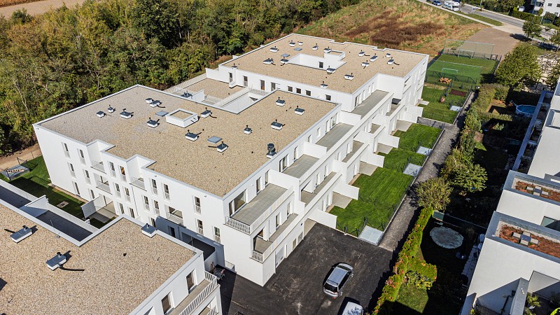 Die Wohnhausanlage besteht aus einem kompakten Baukörper mit zwei Atrien mit insgesamt 59 allseitig ausgerichteten Wohnungen. Die Erschließung erfolgt über zwei Stiegenhäuser mit je einem Lift, welche alle Geschosse umfassen. Im Kellergeschoss ist eine Tiefgarage situiert. Weiters befinden sich Technik- und Einlagerungsräume sowie Fahrradabstellplätze (im Einlagerungsraum) im Kellergeschoss. Kinderwagenabstellraum sowie der Müllraum befinden sich im Erdgeschoss. Die Wohnungen befinden sich in den Geschossen Erdgeschoss, 1. Obergeschoss und Dachgeschoss (teilweise mit Eigengarten, Terrassen und Loggien). Das Projekt wird im klimaaktiv Qualitätsstandard Bronze ausgeführt. Die Raumheizung und Warmwasserversorgung wird durch hocheffiziente Fernwärmeversorgung betrieben.