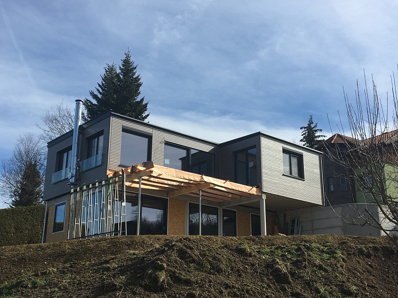Bei dem Projekt handelt es sich um ein zweigeschoßiges Einfamilienhaus, das in Modulbauweise errichtet wurde. Das Gebäude besteht im Untergeschoss aus Stahlbetonwänden, Stützen und Unterzügen, ausgefacht mit Holzleichtbauweise und wurde im Erdgeschoß durch ein microHOME der Firma Genböck Haus (Modulbau in Holzleichtbauweise) erweitert.