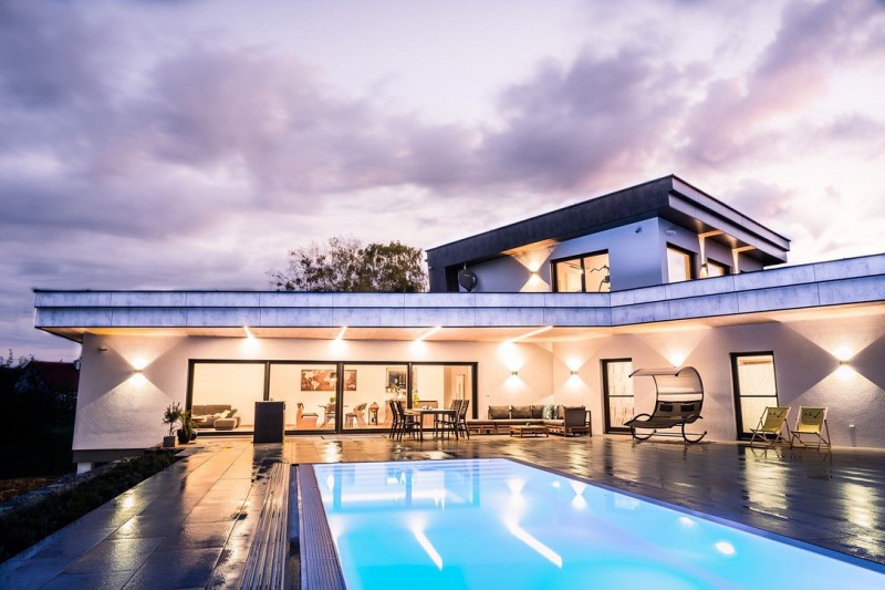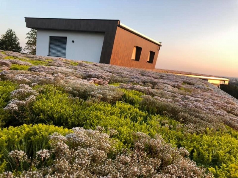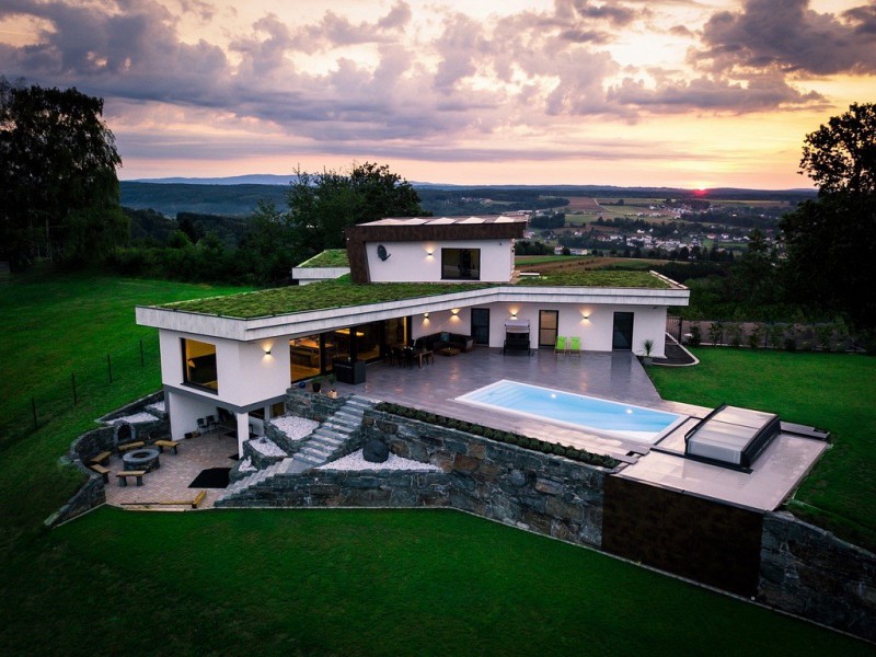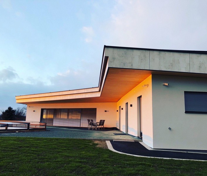 Einfamilienhaus in Stegersbach. Ausgeführt in Holzriegelbauweise mit Gründach und Massivholzsichtdecke.