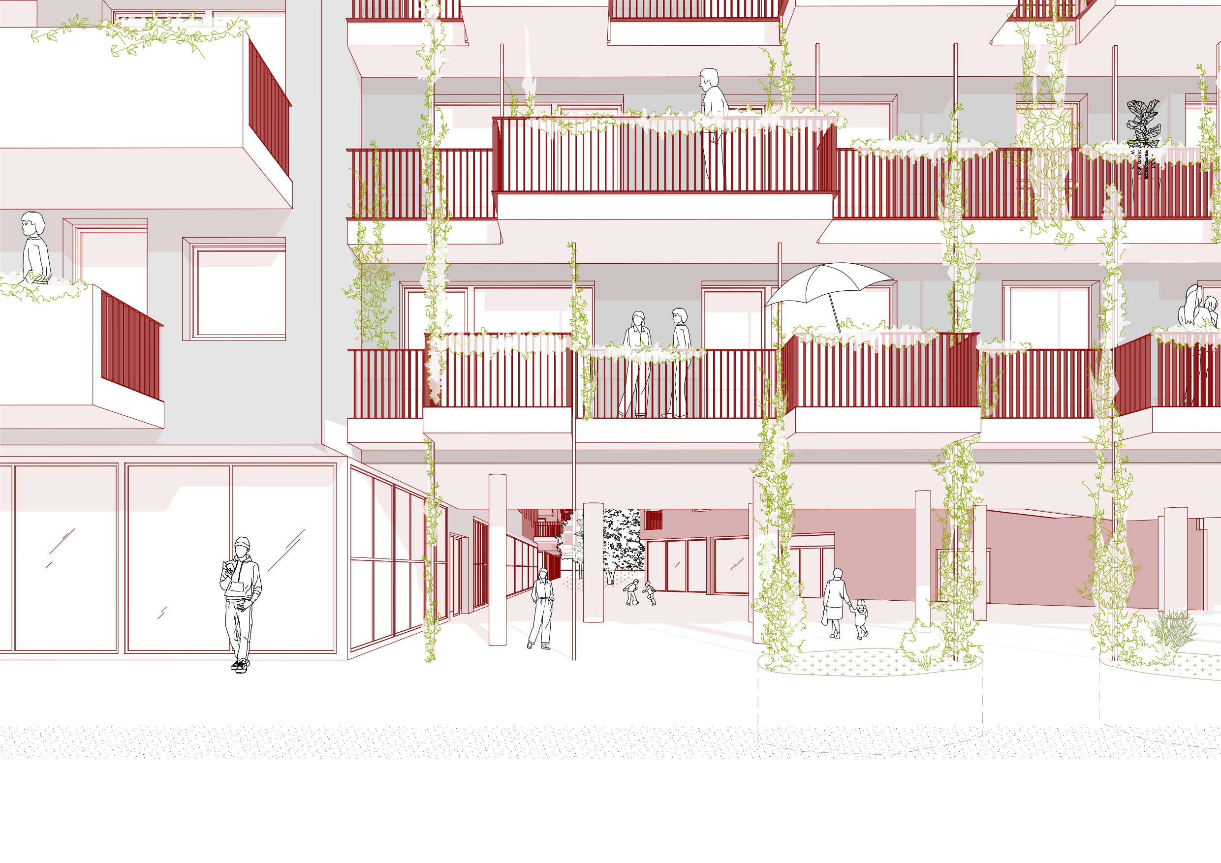 Auf dem Grundstück an der Eipeldauerstraße entsteht eine moderne Wohnanlage, die aus mehreren Baukörpern besteht und barrierefrei zugängliche Wohneinheiten mit gemeinschaftlich nutzbaren Räumen kombiniert. Das Gebäude wird über ein sicheres Stiegenhaus erschlossen, das sowohl vom öffentlichen Straßenraum als auch vom neu geschaffenen Innenhof erreichbar ist. Neben Wohnräumen umfasst das Projekt Allgemeinräume, Fahrrad- und Einlagerungsräume, Müllräume, ein Hausbetreuungszentrum sowie eine Gewerbeeinheit. Zur nachhaltigen Energieversorgung werden Brunnen für Heizung, Kühlung und Warmwasserbereitung eingesetzt, unterstützt durch Wärmepumpen und eine PV-Anlage.