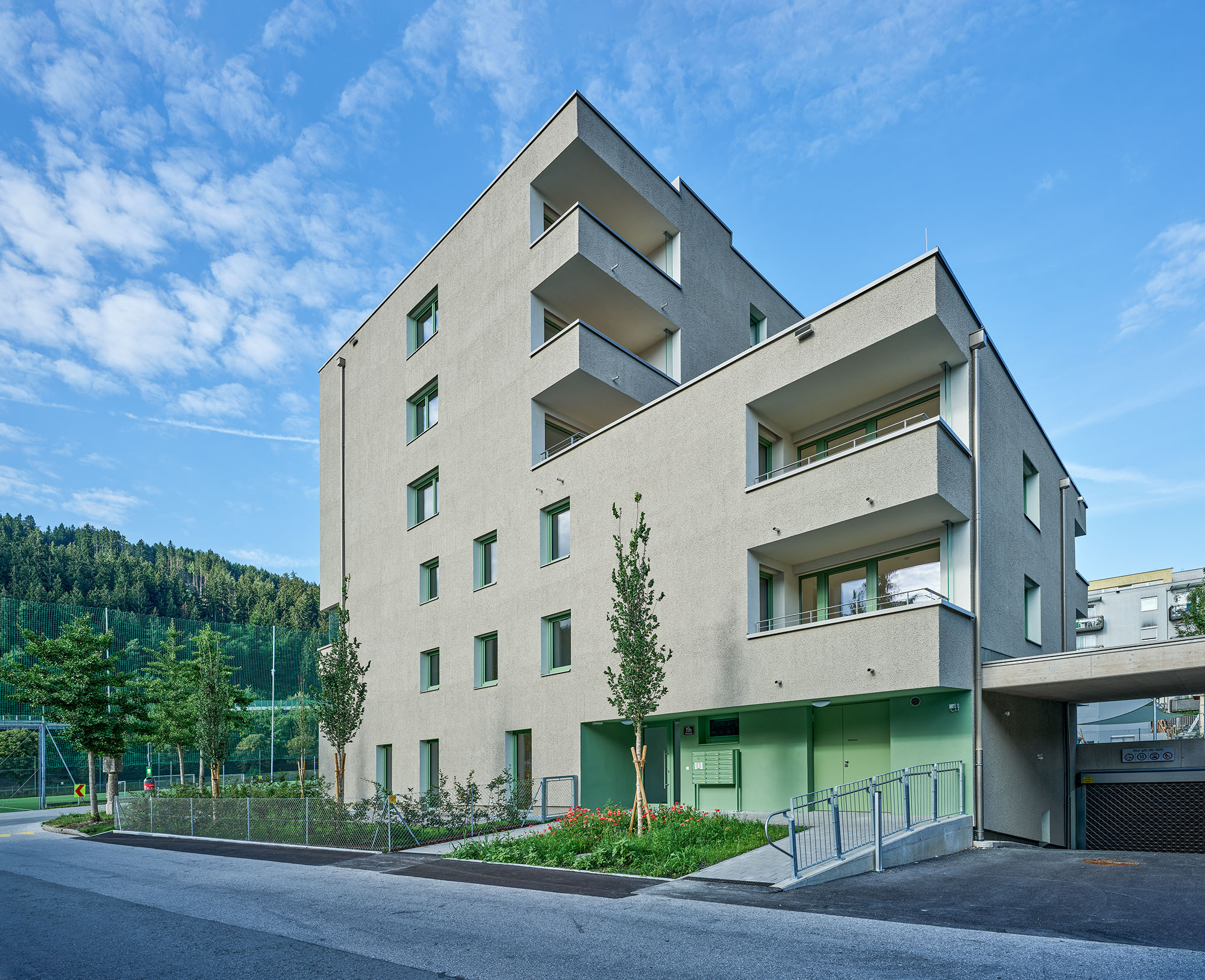Das Wohngebäude Wiesengasse 19b ist trapezförmig ausgebildet und orientiert sich an der westlichen Gebäudeflucht sowie der südlichen Straßenflucht; ein Rücksprung im Osten schafft Freiraum für einen dort befindlichen Bildstock. Des Objekt umfasst einen dreigeschossigen Sockel und eine südseitige turmartige Aufstockung auf sechs Geschosse. Die Erschließung erfolgt über ein zentrales Stiegenhaus mit Durchgang zum großzügigen Grünraum im Westen. Es wurden 17 geförderte Mietwohnungen, 16 Tiefgaragenplätze sowie ein Kinderspielplatz realisiert. Alle Wohnungen verfügen über eine Terrasse oder Loggia.