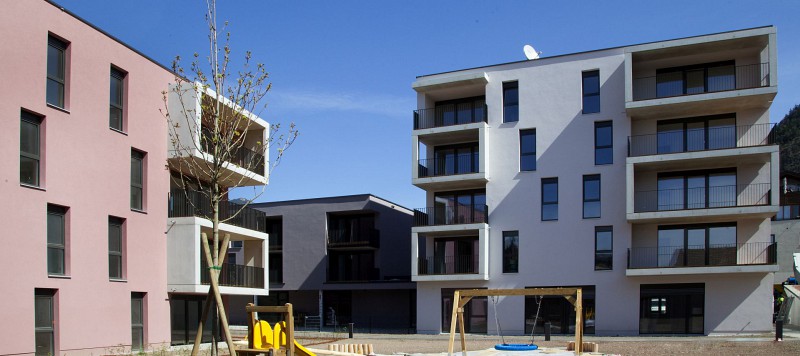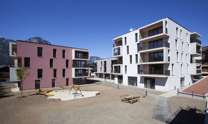 Der Neubau gliedert sich in drei kubische Volumen, welche als Solitärbaukörper in der natürlich gestalteten Außenanlage platziert sind. Die Baukörper sind über ein gemeinsames Untergeschoss verbunden und entwickeln sich oberirdisch mit 2,3 und 4 Obergeschossen zu einem abgestuften Ensemble. Haus A+B sind zusätzlich erdgeschossig zusammengeschlossen. Die Tiefgarage bietet Platz für 62 PKW Stellplätze, wobei 39 für die Wohnungen und 8 für den Sozialsprengel zugeordnet sind und 15 Stellplätze werden fremdvermietet. Zusätzlich zur Tiefgarage werden im Untergeschoss Lager- und Technikräume angesiedelt. Das Untergeschoss ist direkt an die eigenständigen Erschließungsbereiche der drei oberirdischen Gebäudeteile angeschlossen.