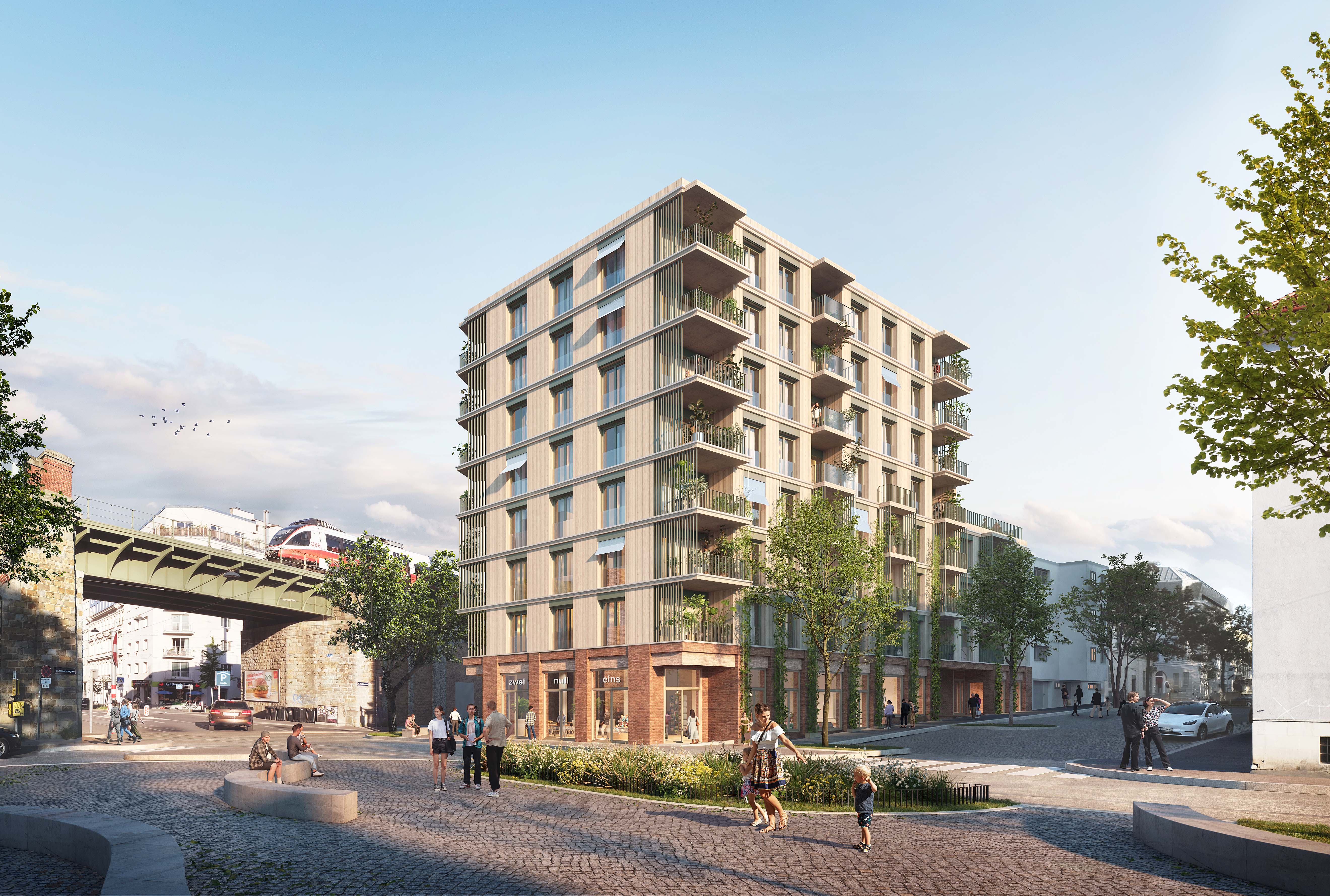 Das Projekt schafft an einem markanten Standort einen Stadtbaustein, der den Blockrand schließt, einen neuen Hochpunkt entlang der Vorortelinie setzt und einen ruhigen, zeitgenössischen Identifikationspunkt im Stadtraum bildet. Durch die Höhenstaffelung reagiert das Gebäude vermittelnd auf die heterogene Umgebung. Auf die gewerblich genutzte Sockelzone folgen 7 Wohngeschoße in Holzbauweise, wobei sich die nachhaltige Materialwahl konsequent innen und außen ablesen lässt und durch intensive und extensive Dach- sowie Fassadenbegrünung stimmig ergänzt wird. Erneuerbare Energiequellen wie Photovoltaik und Luftwärmepumpen sind Hauptbestandteil des nachhaltigen Haustechnikkonzepts. Neben der ausgezeichneten Anbindung an den öffentlichen Verkehr wird zusätzlich auf Fahrrad und E-Mobilität gesetzt