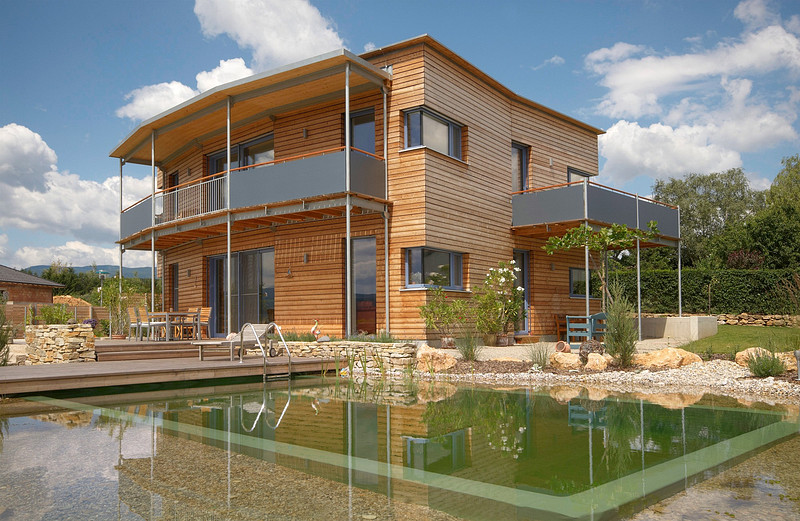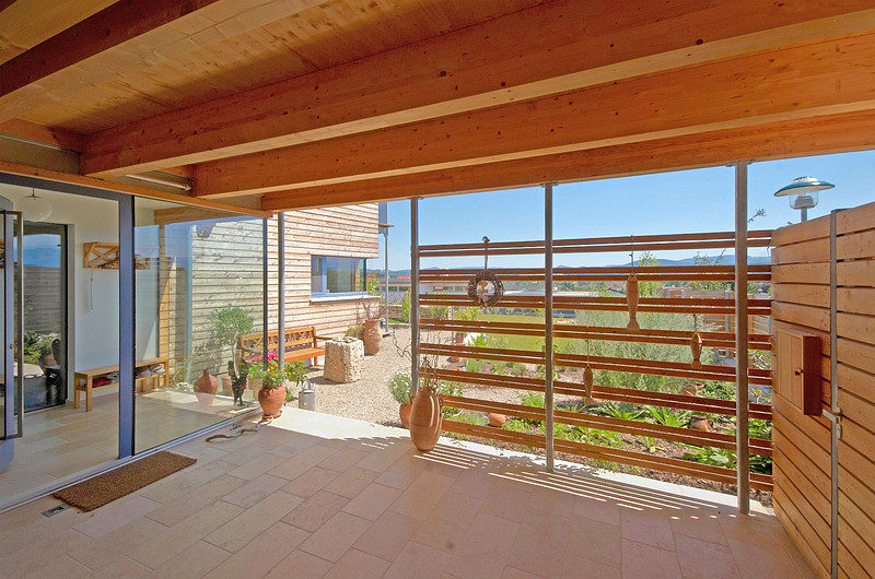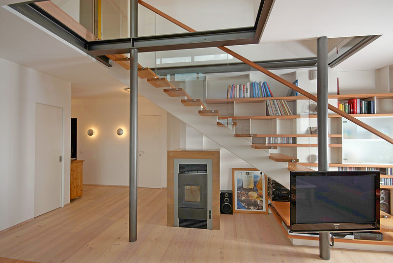 Qualitäts-zertifiziertes Öko-Passivhaus in Holzriegelbauweise unterkellert. Die Kellerdecke ist als Holzfertigteildecke ausgeführt. Der Kellerabgang befindet sich im unbeheizten Windfang. Der Innenausbau erfolgte mit Kalkputz und Dispersionsfarbe.