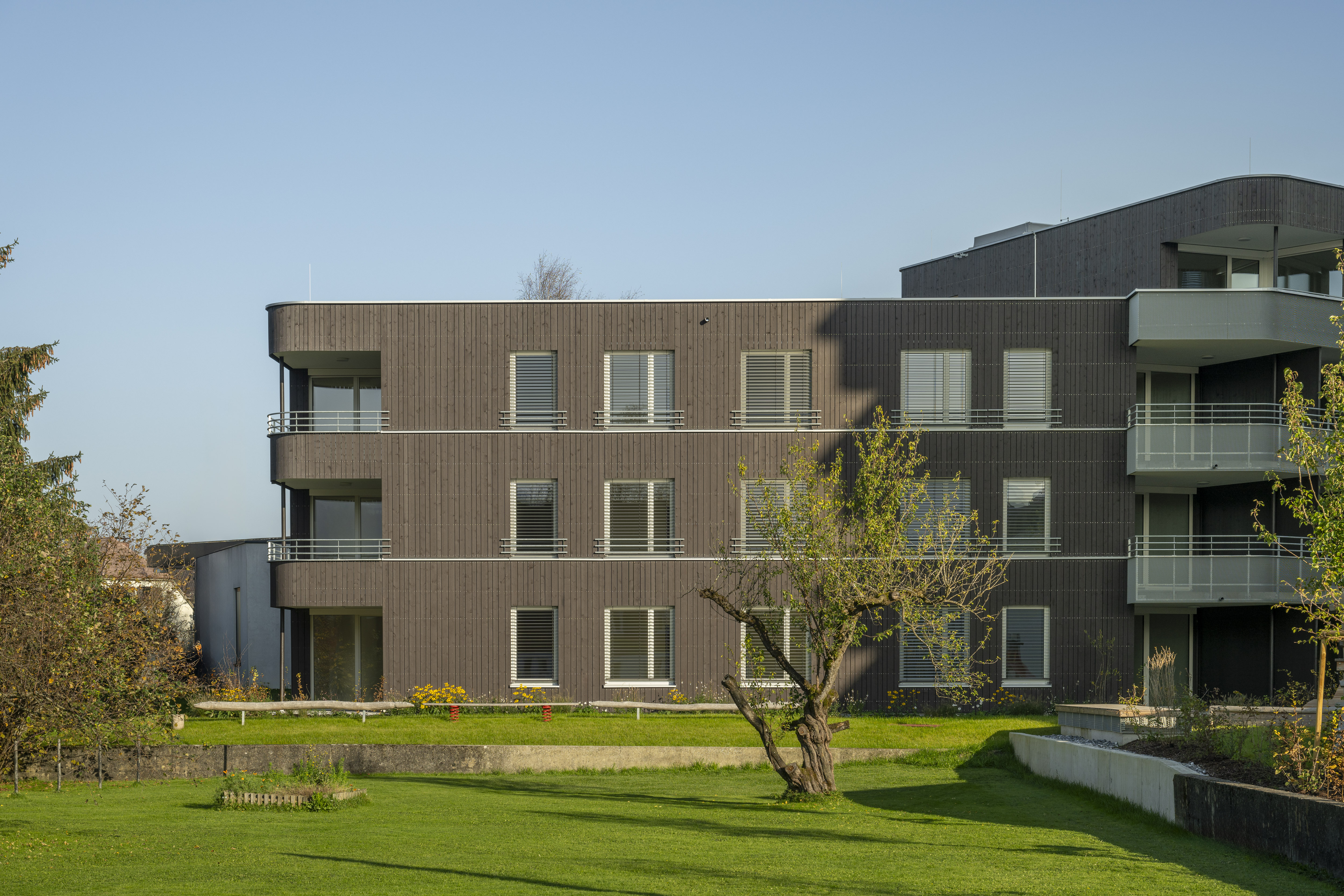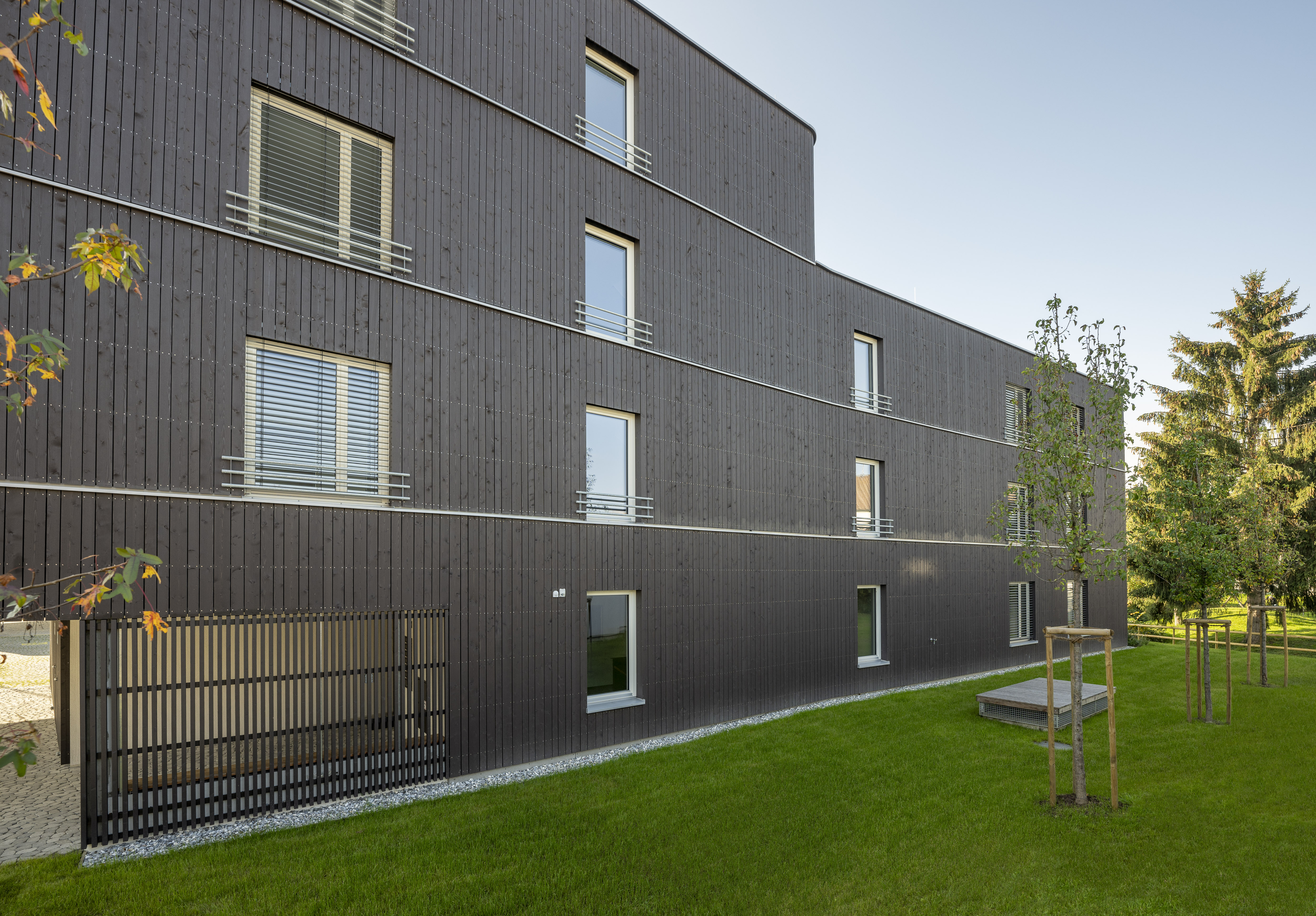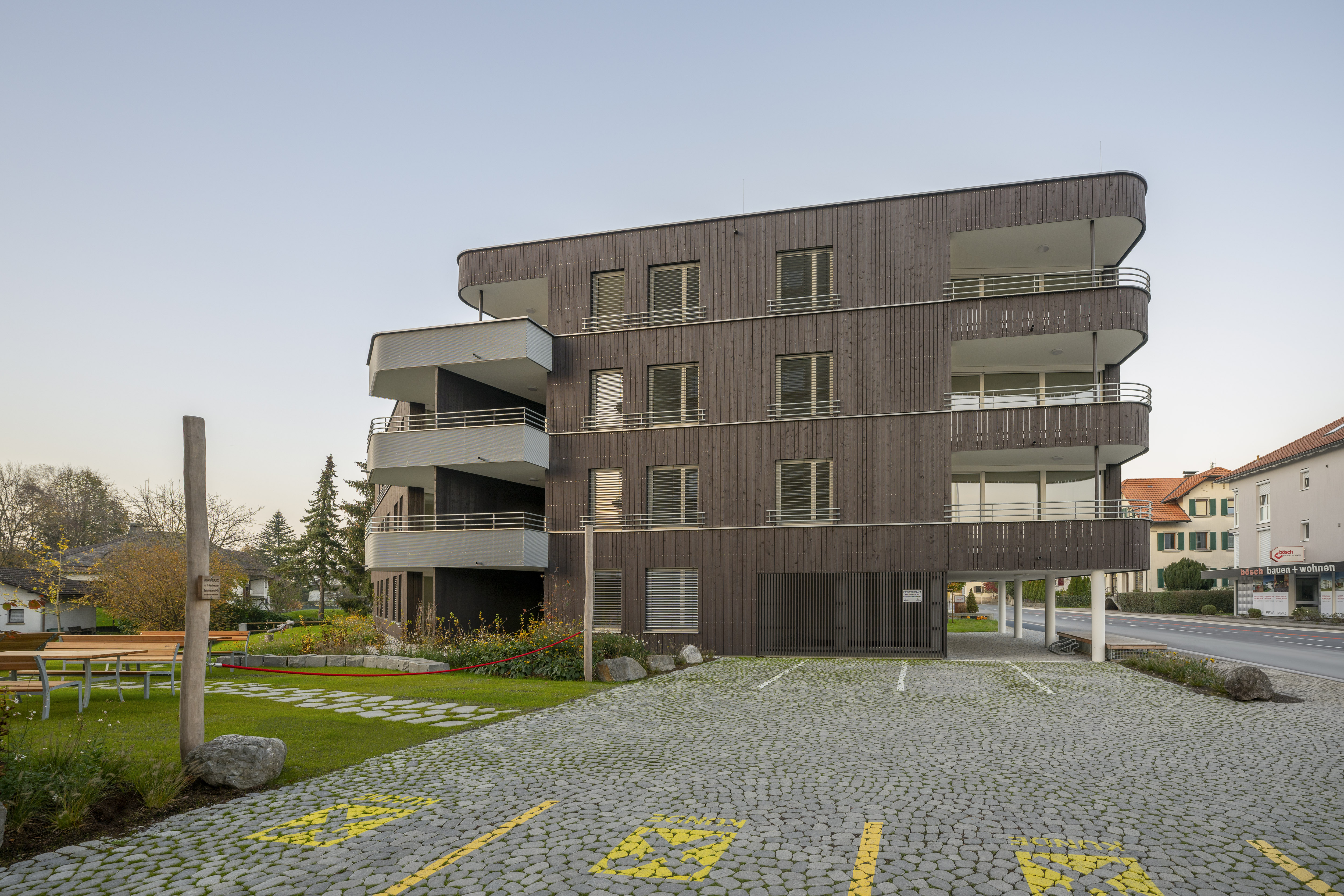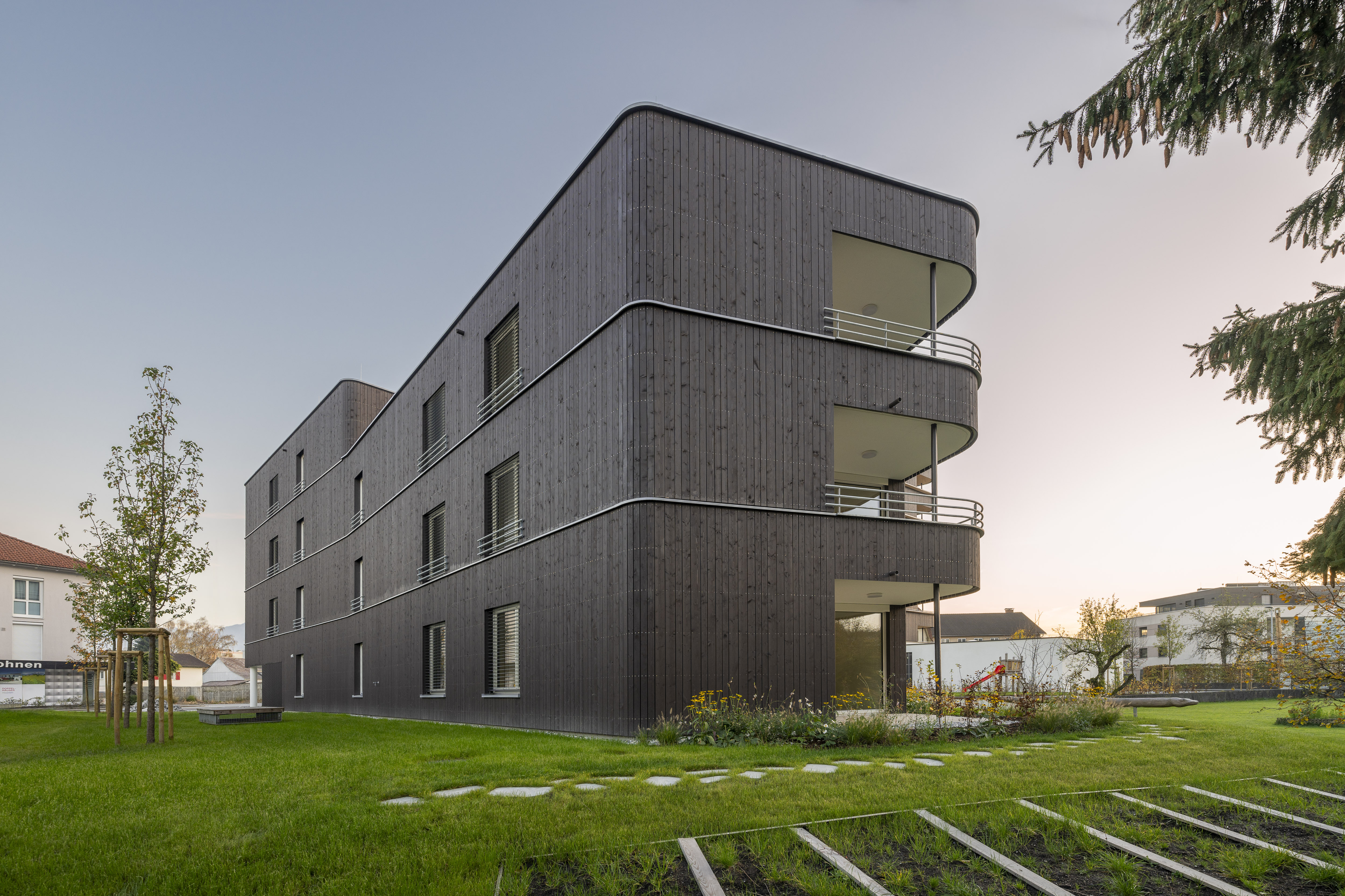 Die Wohnanlage verfügt über ein Erdgeschoss und drei Obergeschosse. Die Ausführung des Baukörpers erfolgt als Stahlbetonskelettbau mit Stahlbetonstützen und Holzaußenwänden. Das Flachdach wird bekiest, die Fassaden werden als hinterlüftete Holzfassaden ausgeführt.