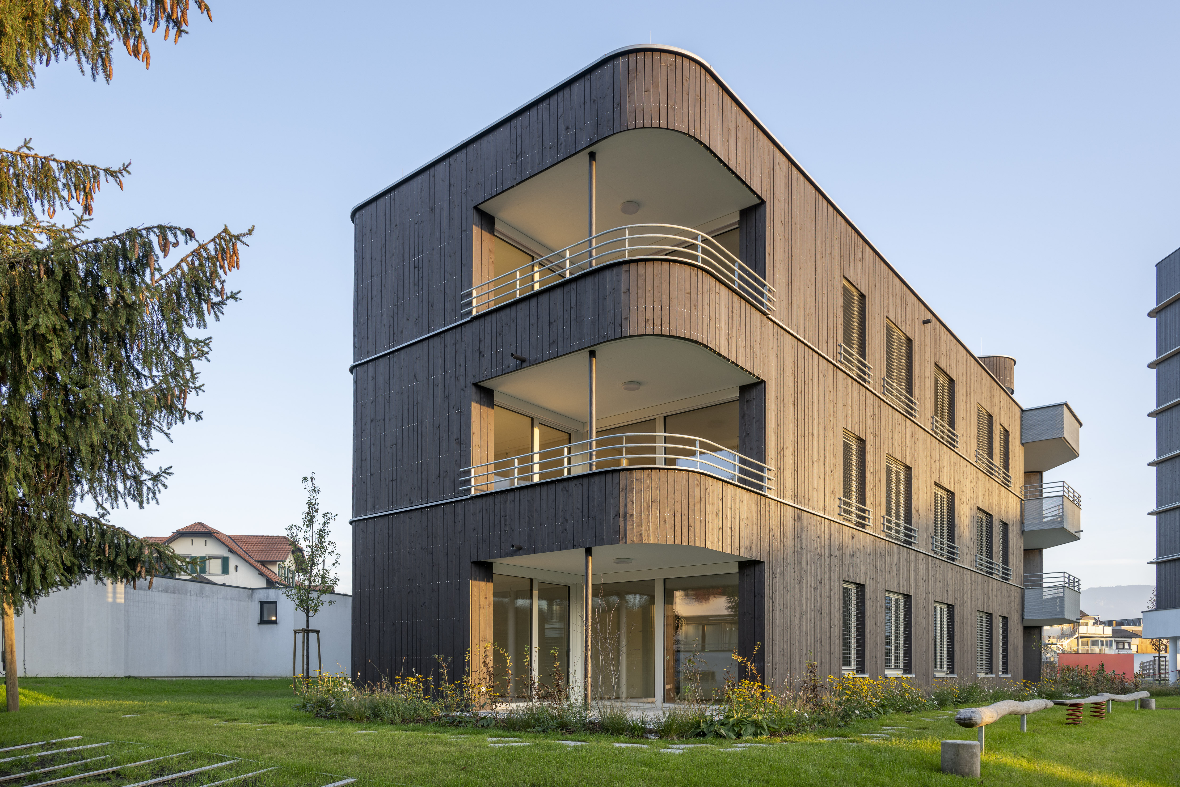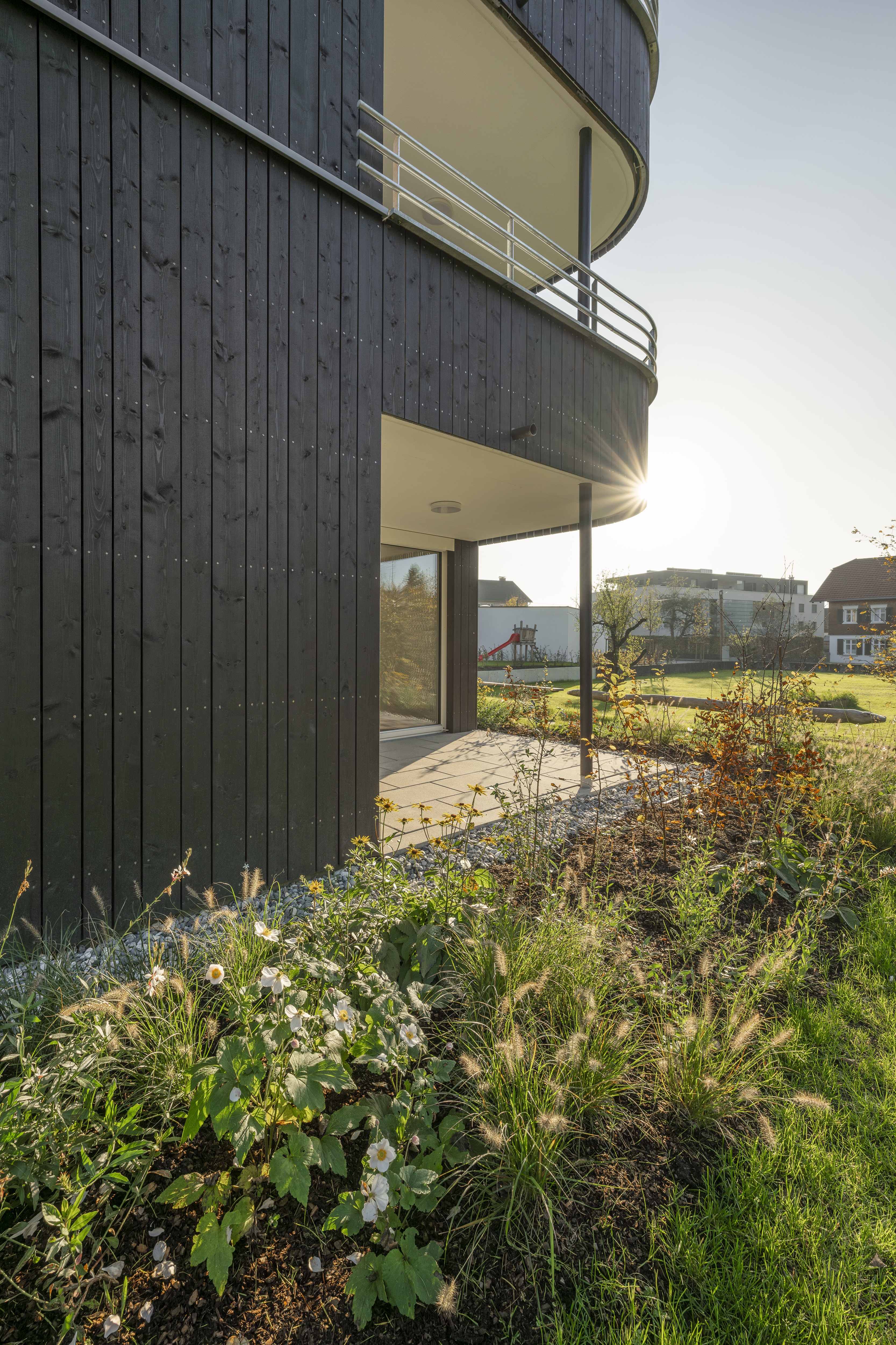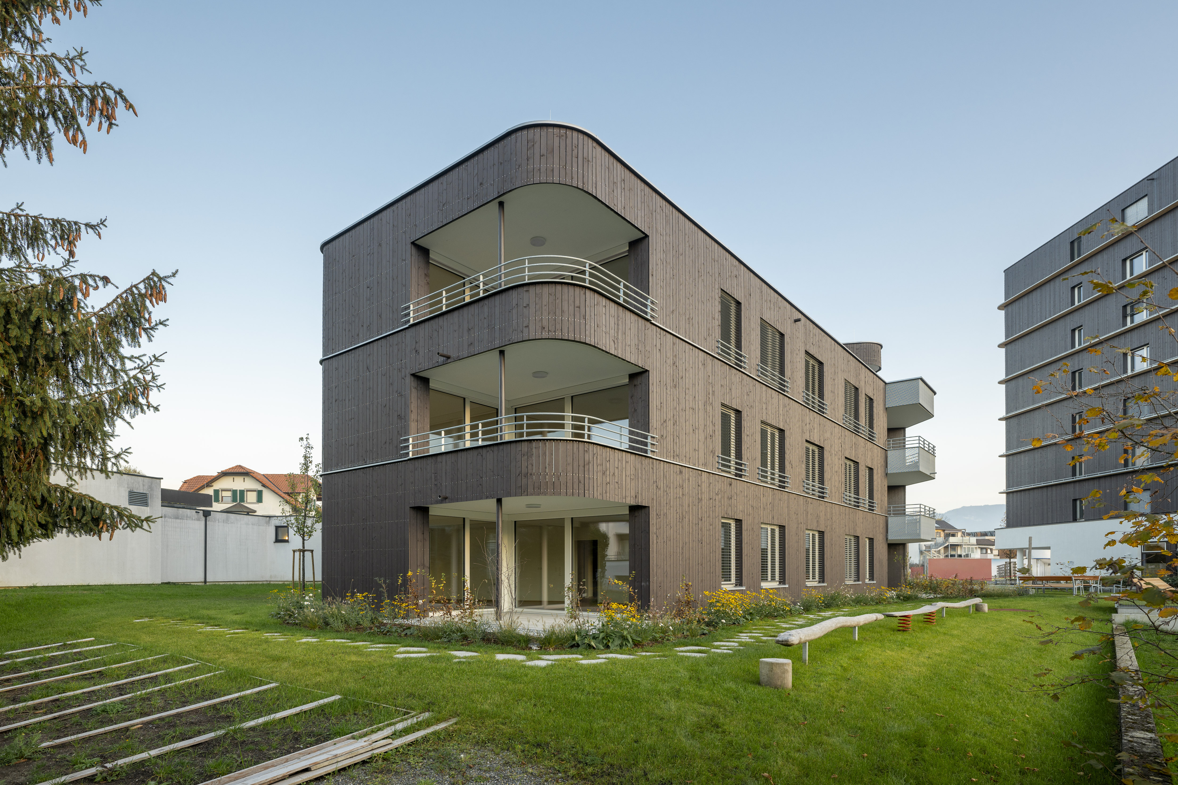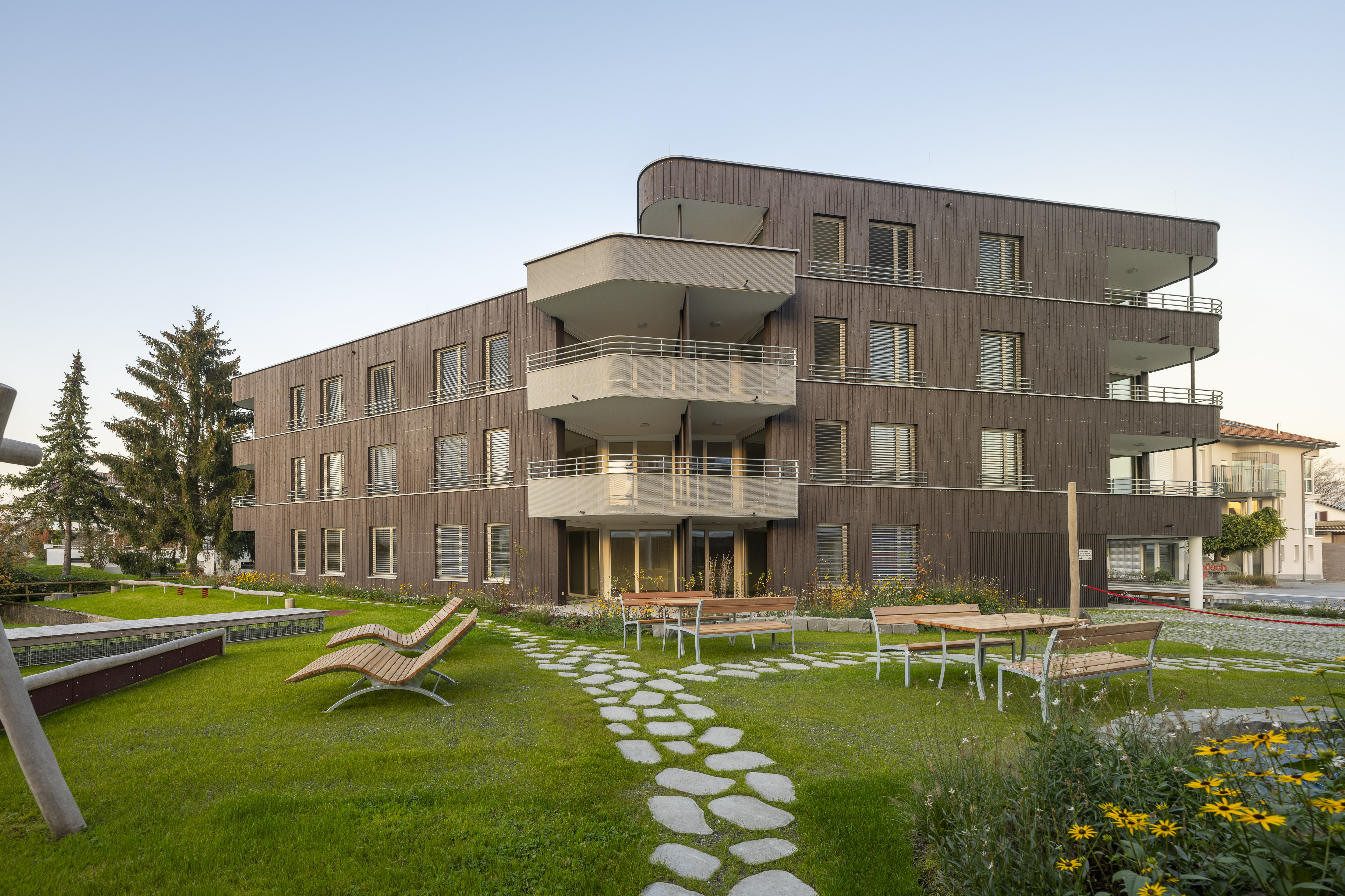 Die Wohnanlage verfügt über ein Erdgeschoss und drei Obergeschosse. Die Ausführung des Baukörpers erfolgt als Stahlbetonskelettbau mit Stahlbetonstützen und Holzaußenwänden. Das Flachdach wird bekiest, die Fassaden werden als hinterlüftete Holzfassaden ausgeführt.