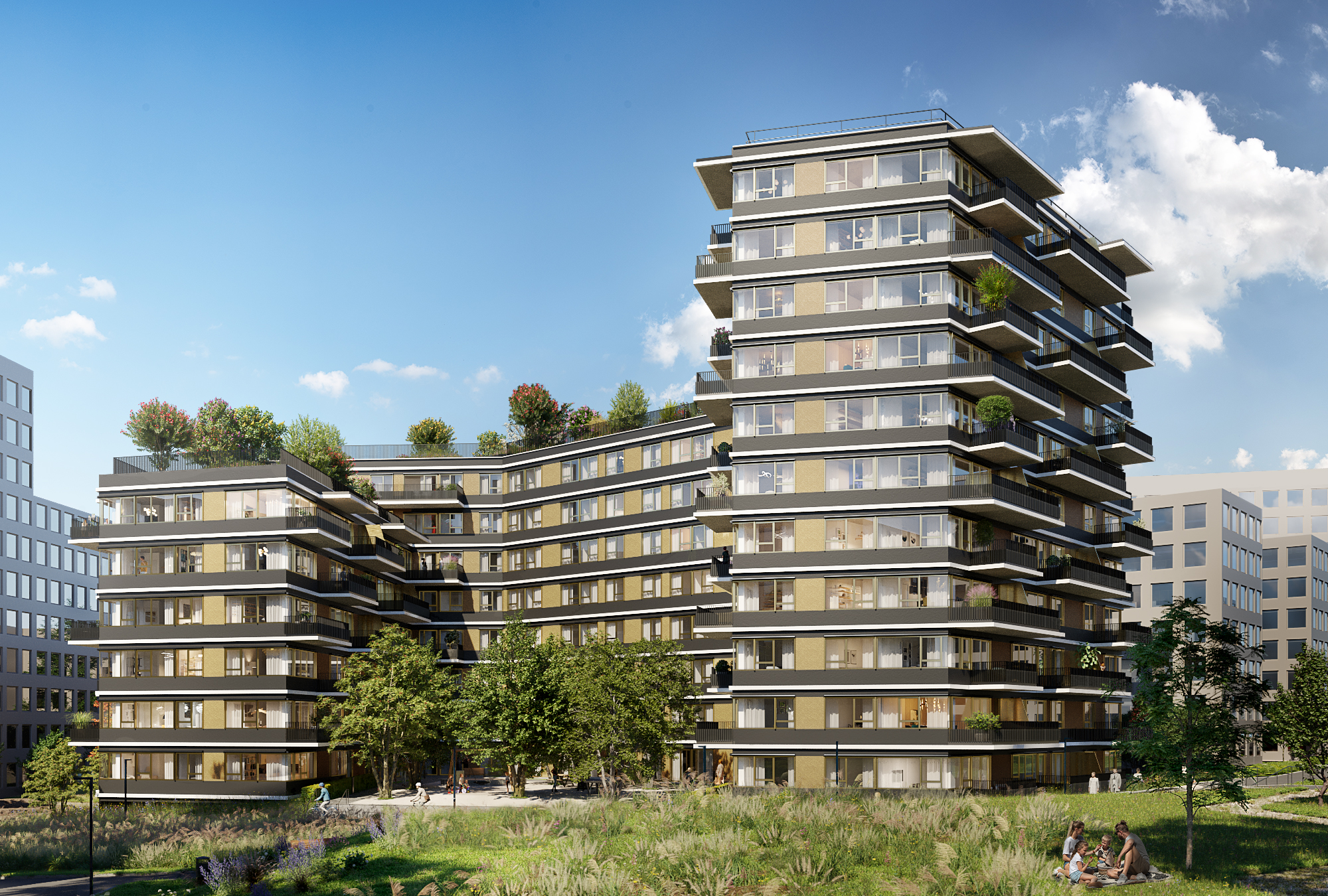 Das Quartier „Village im Dritten“ umfasst rund 1.900 Wohnungen, Gewerbeflächen, Nahversorgungs- und Kinderbetreuungseinrichtungen sowie einen zentralen Park. Das U-förmige Gebäude auf Baufeld 02 öffnet sich zum Park und ist gestaffelt mit sieben bis elf Geschoßen. Die Nachhaltigkeit zeigt sich in Gemeinschaftsbereichen zum Innenhof, süd- oder parkorientierten Wohnungen für optimale Lichtnutzung, großzügiger Verglasung und privaten Freiflächen, wie Balkonen und Dachterrassen. Fahrrad- und Einlagerungsräume fördern den Radverkehr und ein Co-Working-Space im Erdgeschoß bietet flexible Arbeitsmöglichkeiten. Zwei Dachterrassen und ein Fitnessbereich fördern die soziale Interaktion.