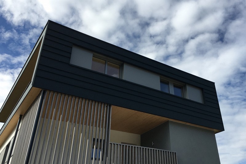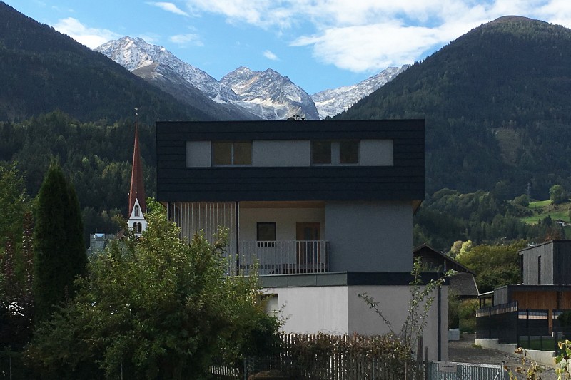 Das in den 80er Jahren errichtete Einfamilienhaus wurde durch eine Aufstockung und Neuorganisation des Bestandes zu einem Zweifamilienhaus erweitert. Dabei wurden die Grundrissstrukturen im Bestand (Eg + Og) bewusst soweit wie möglich erhalten. Im Erdgeschoß wurden Bad, Küche und Schlafzimmer neu gestaltet. Die Eingangssituation wurde durch eine großzügige Garderobe erweitert. Das Obergeschoß und das neu errichtete Dachgeschoß bilden die zweite Wohneinheit. Die Erschließung dieser Wohneinheit erfolgt durch eine überdachte Außentreppe. Im Obergeschoß befinden sich die Schlafräume und das neu errichtete Bad, im Dachgeschoß die Wohnräume (kochen, essen, wohnen, Wc) und eine großzügige Terrasse. Die Aufstockung wurde in Massivholzbauweise mit Sichtoberflächen in Fichte ausgeführt. Die Fassaden im Obergeschoß wurden als hinterlüftete Fassade mit Mineralwolldämmung ausgeführt. Die exponierten Bereiche als Metallfassade (Winkelstehfalz), die witterungsgeschützten Bereiche in Lärche Natur. Der bestand wurde mit einem Wärmedämmverbundsystem (eps-f plus) und Holz-Alu-Fenstern saniert. In beiden Wohneinheiten wurde eine Komfortlüftung installiert. Die Wärme- und Warmwasserversorgung erfolgt über die Bestandsheizung (Ölkessel), welche in der Leistung angepasst wurde. Die Sanierungsmaßnahmen wurden durch eine umfassende Wirtschaftlichkeitsberechnung (Sanierungsvarianten) begleitet und förderungsoptimiert ausgeführt.