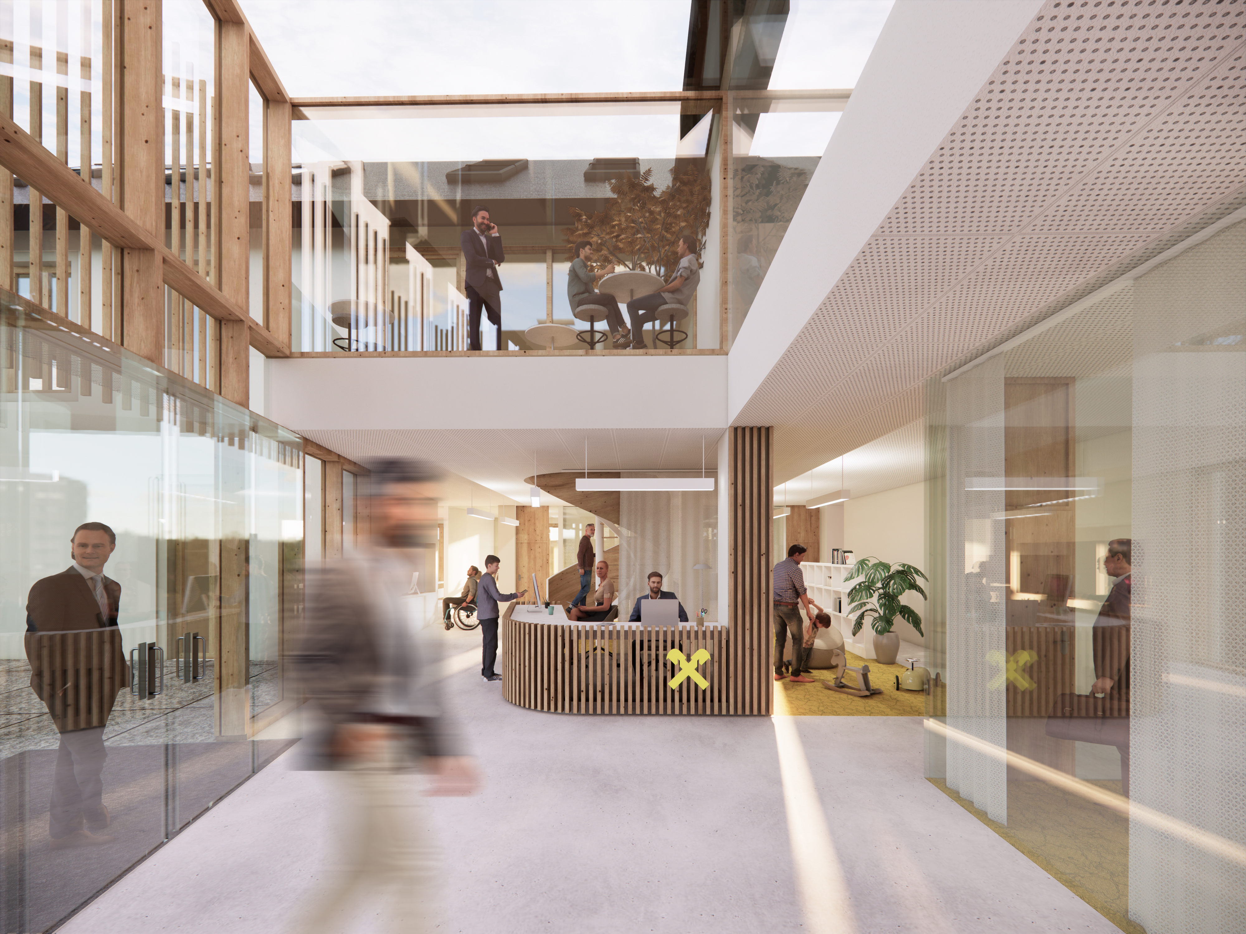 Der neue Baukörper fügt sich dank seiner Geschossigkeit sowie der zurückhaltenden Architektur aus Holz und Glas harmonisch in das Gesamtbild ein. Gemeinsam mit dem Bestandsgebäude entsteht ein Platz, der sich nach Süden und Osten öffnet und sowohl für interne Veranstaltungen der Bank als auch für die Öffentlichkeit nutzbar ist.