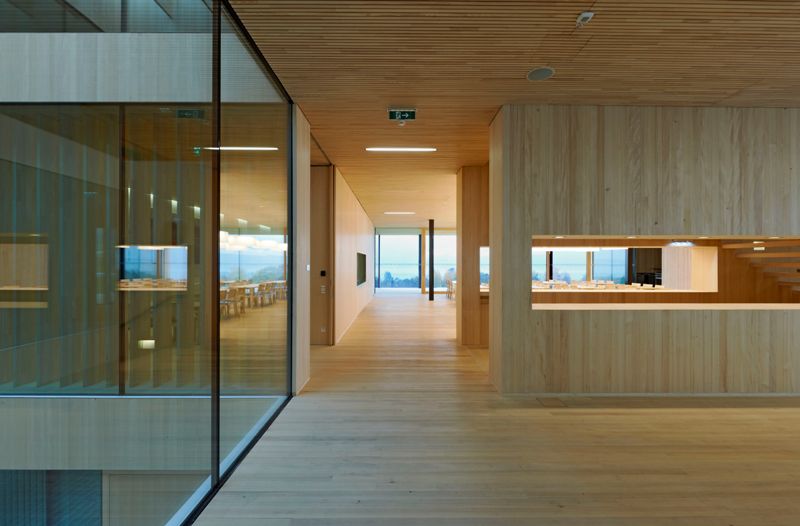 Der zentrale Innenhof mit den umliegenden, sich auf den Hof öffnenden Praxisräumen bildet das neue, aktive Zentrum der Landwirtschaftsschule. Die Aussichtslage am See wird durch den mäandrierenden Zugang betont und bietet gezielte Blickmöglichkeiten in die Landschaft.