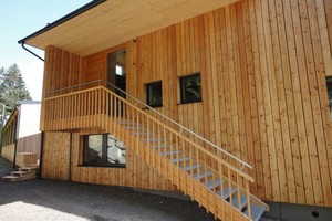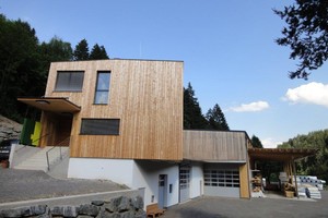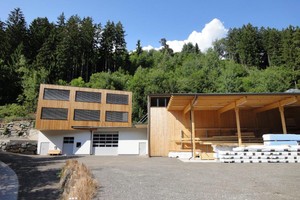 Das als Passivhaus konzipierte und ausgeführte Bürogebäude der Firma Holzbau Aktiv versteht sich aus gestalterischer Sicht als "kleine Schwester" der großen Fertigungshalle daneben. Es sitzt thermisch komplett entkoppelt auf einem Sockel, den Lager- und Magazinräumen der Anlage.