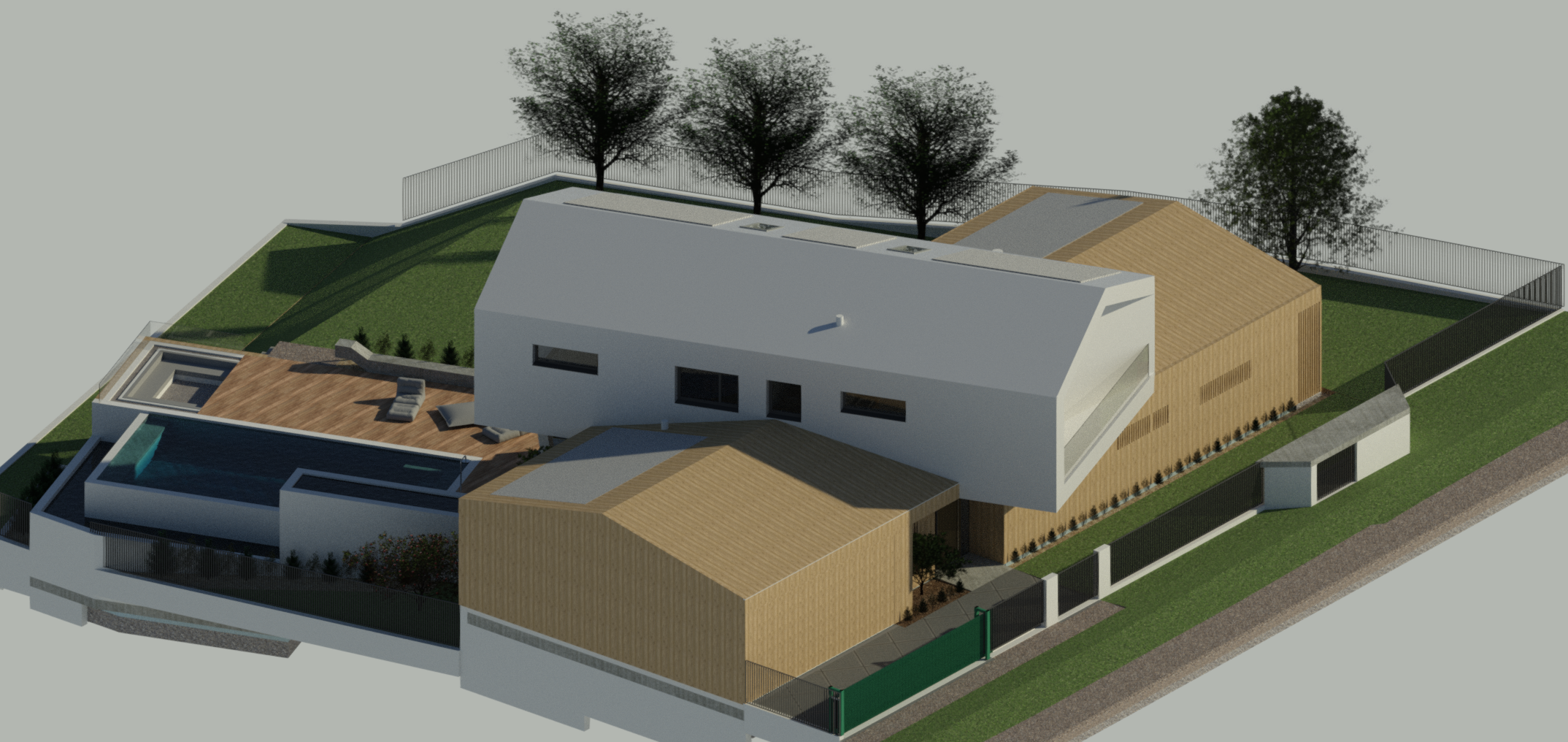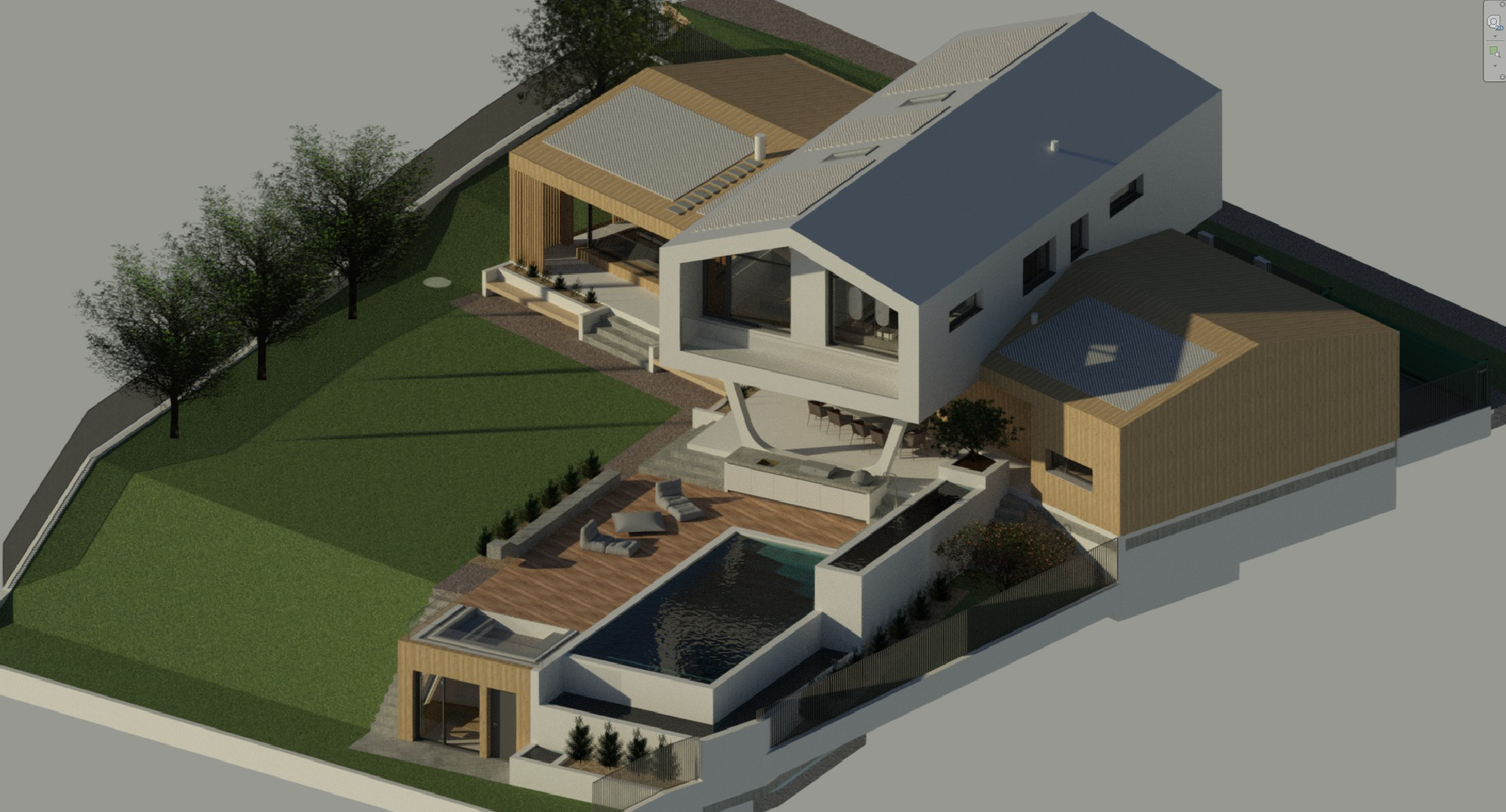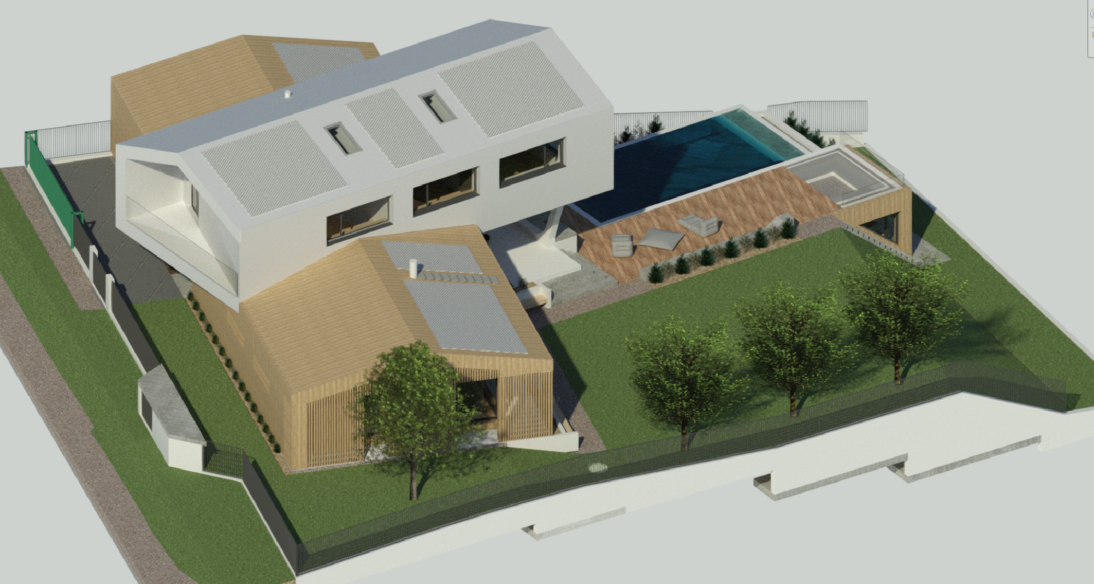 Geplant ist ein zweigeschossiges nicht unterkellertes Einfamilienhaus samt Garagenzubau für zwei KFZ an der nordöstlichen Seite. Die Garage schließt dabei mit einer Wandseite (Brandwand) direkt an der Grundgrenze zum Grundstück 722/2 an. In dem Garagenzubau befindet sich ein Abstellraum und der Technikraum. Im Erdgeschoss ist eine vorgehängte Holzfassade vorgesehen und das Obergeschoss soll durch eine vorgehängte Metallfassade (Falzblechfassade) bekleidet werden. Das Dach wird mit einem Falzblechdach ausgeführt. Zusätzlich ist am Dach eine PV-Anlage für bis zu 20kWp geplant.