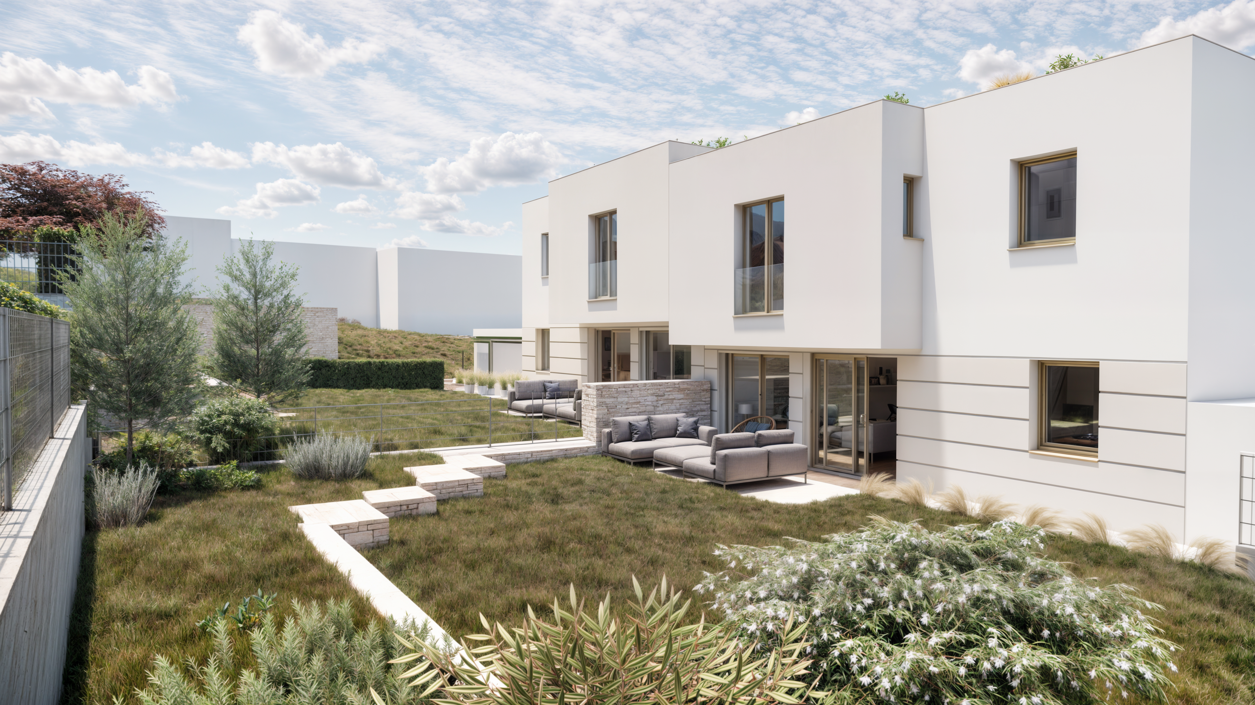 Am Hartlsteig – Hoher Nußbaumweg in 7000 Eisenstadt entsteht eine moderne Wohnanlage bestehend aus zwei Doppelhäusern mit insgesamt vier hochwertig ausgeführten Wohneinheiten. Die Gebäude überzeugen durch klare Architektur, funktionale Grundrisse sowie großzügige private Außenbereiche. Jede Einheit verfügt über zwei Stellplätze, teilweise mit Carports, und wird über einen überdachten Zugang erschlossen. Die Wohnbereiche öffnen sich zu einer Terrasse mit anschließend terrassierten Mietergärten, die aufgrund der Hanglage mittels Naturstein- und Stützmauern strukturiert werden. Die Objekte werden in energieeffizienter Massivbauweise errichtet und mit einer Wärmepumpe, Photovoltaikanlage und mechanischer Entlüftung ausgestattet.