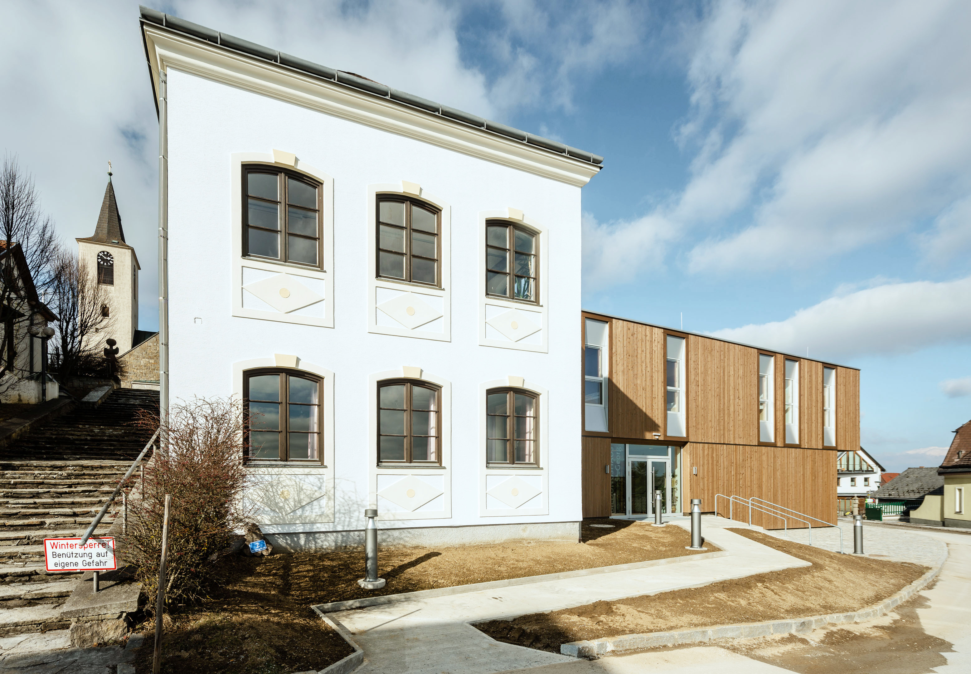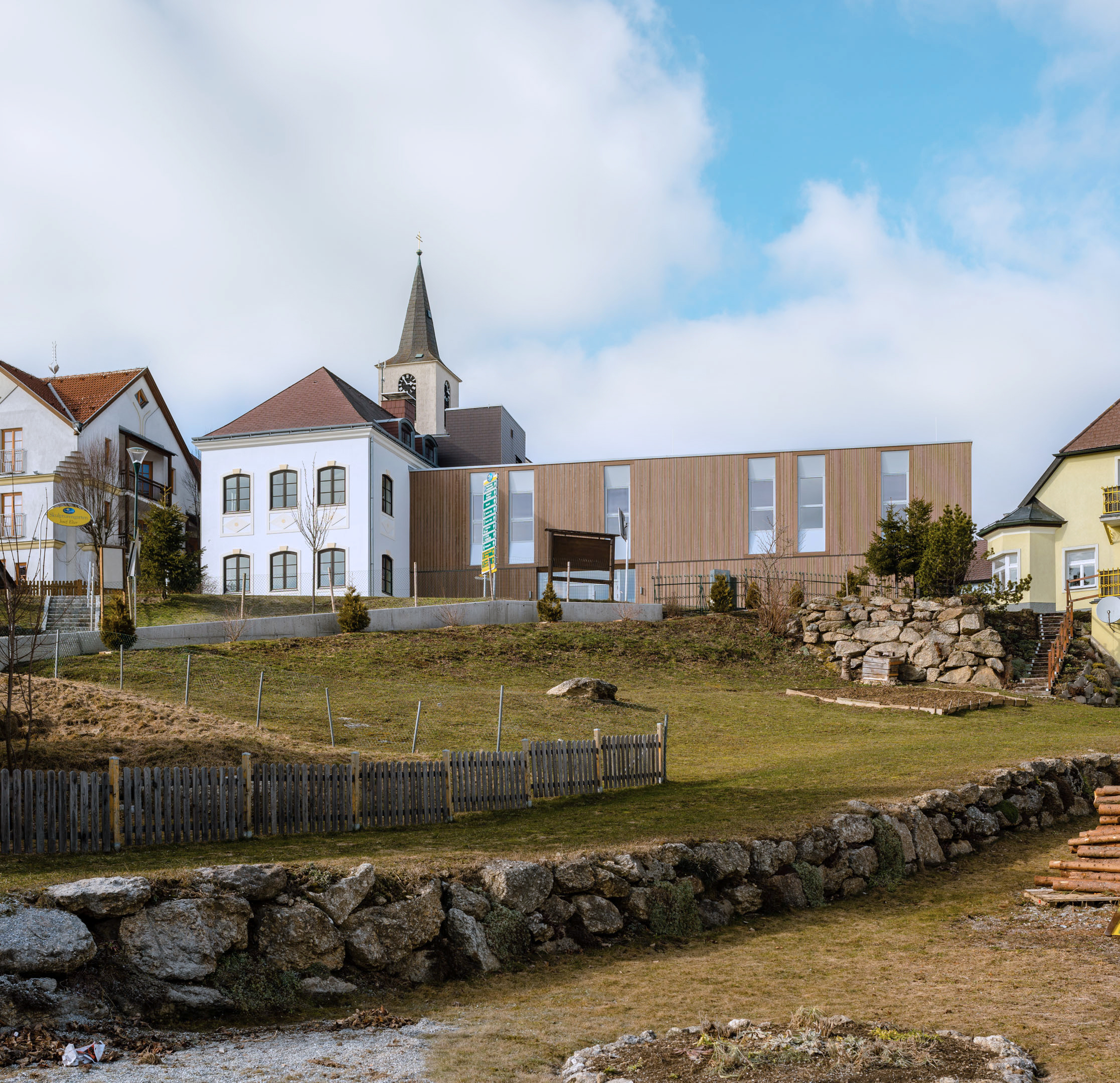 St. Georgshaus war in der Vergangenheit mehrfach erweitert worden, und sollte in seiner neuen Form neben einem jahrhundertealten Pfarrhof bestehen. Trotz des geforderten Volumens musste das St. Georgshaus zart in der Erscheinung bleiben, da es an einer Straßenengstelle zum Hauptplatz an dem wichtigsten Platz des Ortes steht. Die Engstelle wurde nicht entfernt sondern das Gebäude kragt aus, um ein „Auslaufen“ des Platzes zu verhindern. Anstatt daran anzubauen wird durch eine Fuge vom mittelalterlichen Pfarrhof abgerückt. Der neue Baukörper wirkt zurückhaltend und unspektakulär trotz seiner Größe und der prominenten Position am Hauptplatz, neben dem Pfarrhof. Tageslicht dringt durch bodentiefe Fenster in Gänge, Gästezimmer, Saal und Foyer. Überraschende Aus- und Durchblicke schaffen Leichtigkeit und dazu eine freundliche, helle Atmosphäre, die durch das Material Holz als sehr warm empfunden wird.