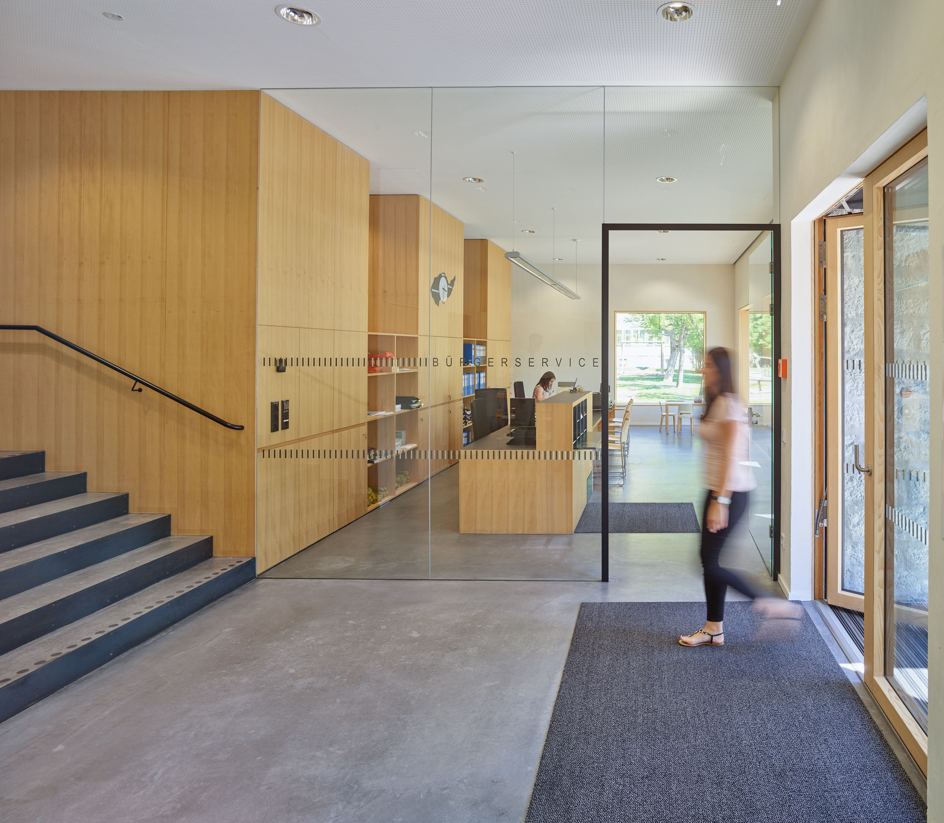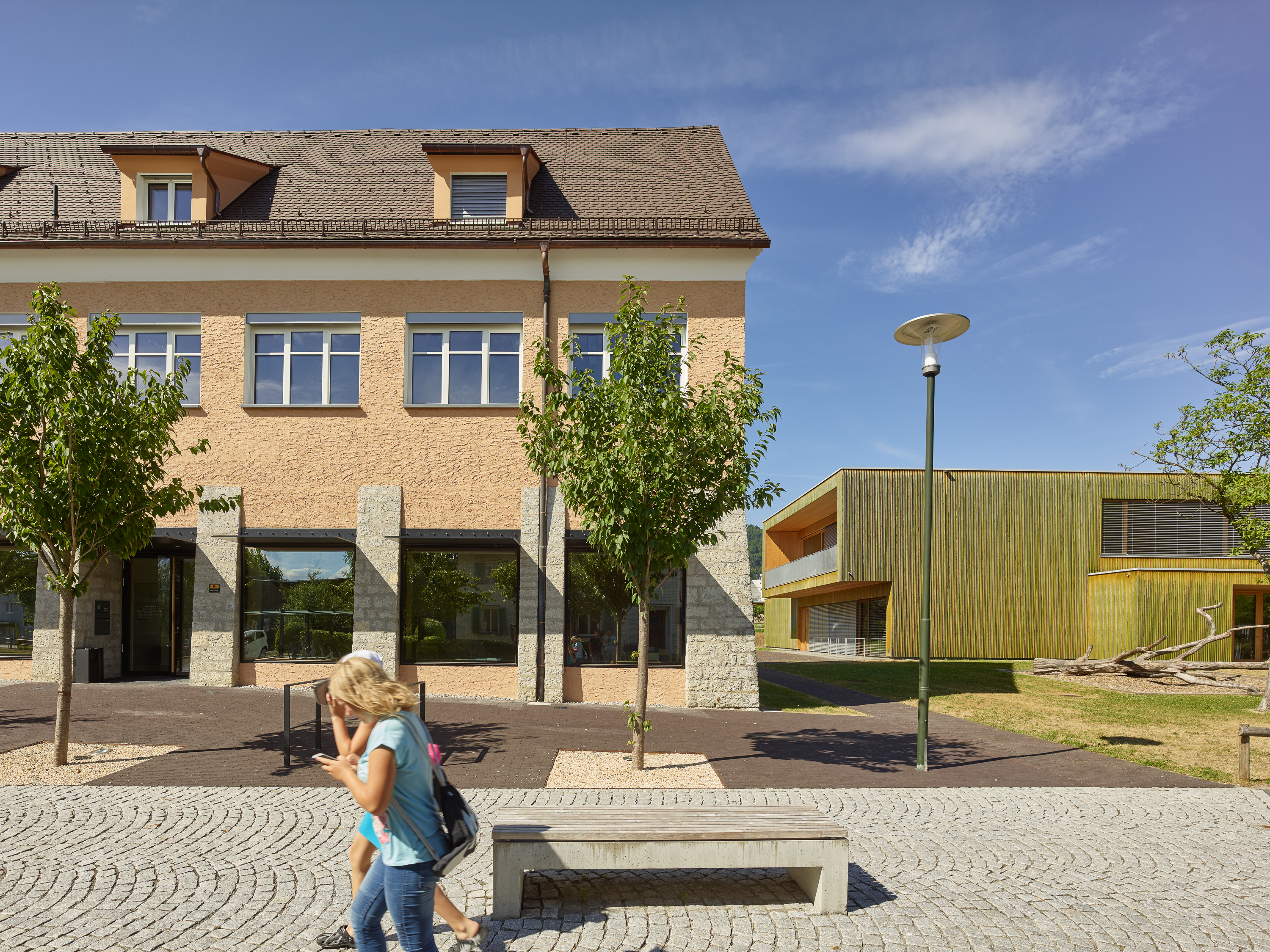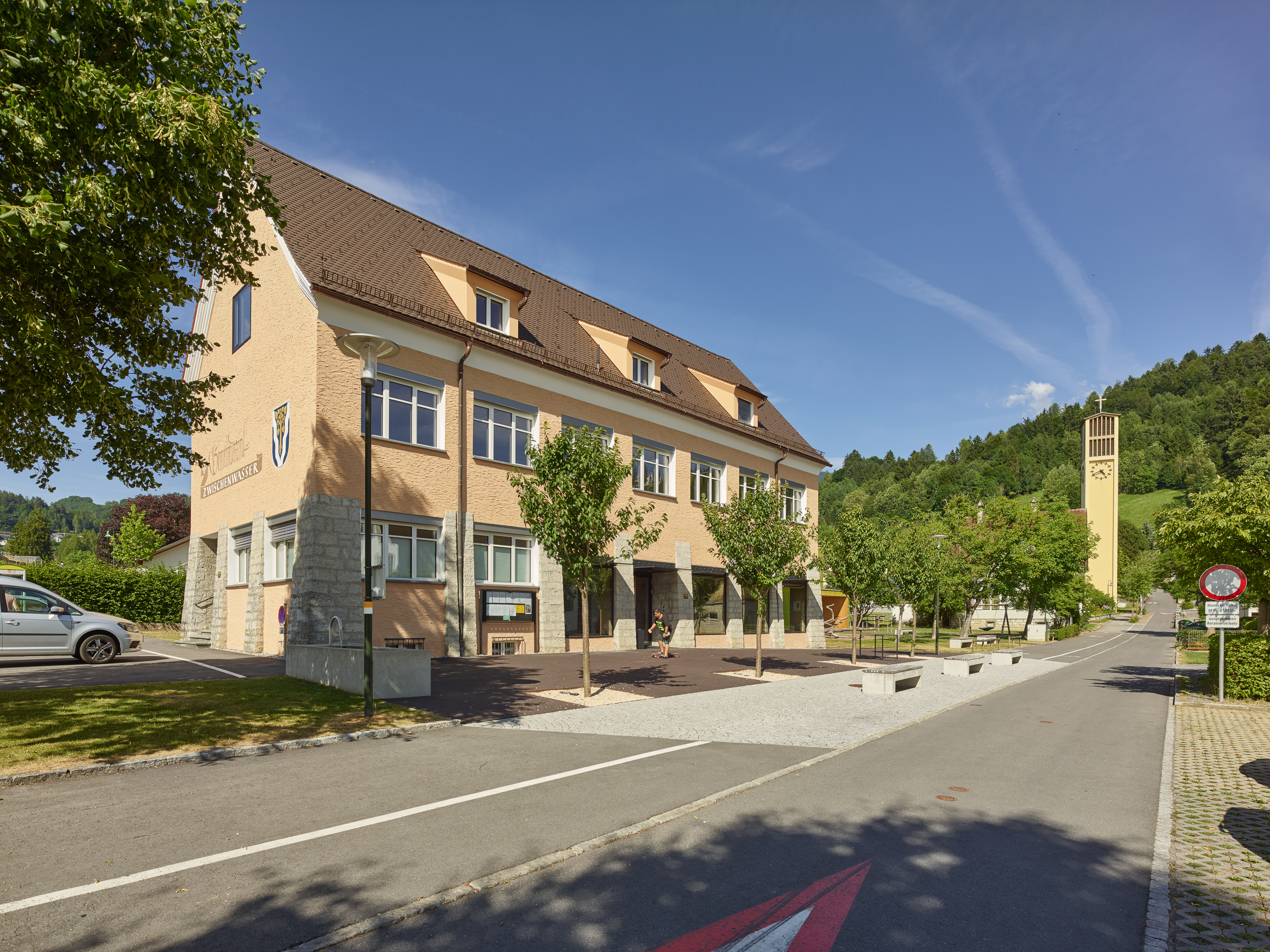 Ein Gemeindeamt aus den 1930er Jahren wurde behutsam modernisiert, die Fassade des Hauses blieb weitgehend unverändert, das Bürgerbüro auf Straßenniveau abgesenkt und mit großen Verglasungen barrierefrei zum neu gestalteten Vorplatz geöffnet. Trotz kleinteiliger Struktur wirken die Raumfolgen in Holz und Glas großzügig. Ein gutes Raumklima schaffen Nachtkühlung, Komfortlüftung und Chemikalienmanagement. Erneuerbare Energie wird vom gemeindeeigenen Biomasseheizkraftwerk und der PV-Anlage geliefert. Es wurden hochwertige, überdachte Fahrradabstellplätze sowie Elektroautoabstellplätze mit Ladestationen geschaffen.