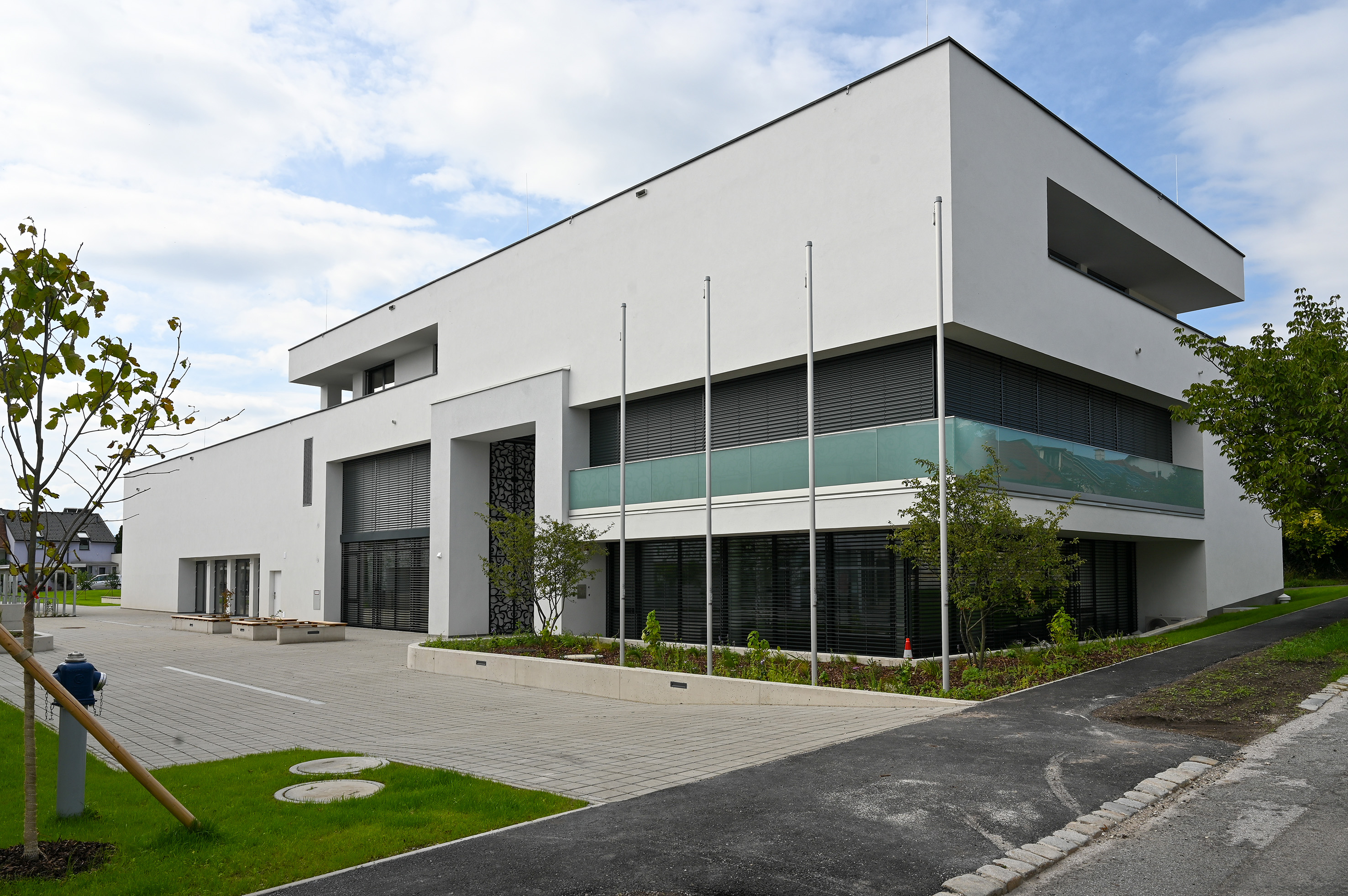 Das neue Gemeindezentrum mit Veranstaltungssaal ist Teil des Gesamtprojektes „Obstgarten“, und liegt am südlichen Rand von Gumpoldskirchen. Abgerückt von den bereits bestehenden Gebäuden entsteht eine begrünte, mit Sitz- und Verweilflächen gestaltete, autofreie Begegnungszone. Der homogene Baukörper gliedert sich in das dreigeschoßige Gemeindezentrum und einen Veranstaltungssaal mit 2 Geschoßen und wurde in massiver Stahlbeton-Bauweise ausgeführt. Von der Begegnungszone „nimmt“ das Gebäude, über einen hohen Eingang, die Besucher auf. Der 6m hohe Veranstaltungssaal kann großzügig nach 3 Richtungen geöffnet werden. Im Obergeschoß befinden sich Verwaltung, Sitzungs- und Multifunktionssaal. Die Glasfassaden sind leicht zurückgesetzt und alle Dächer sind Flachdächer, die extensiv begrünt sind.