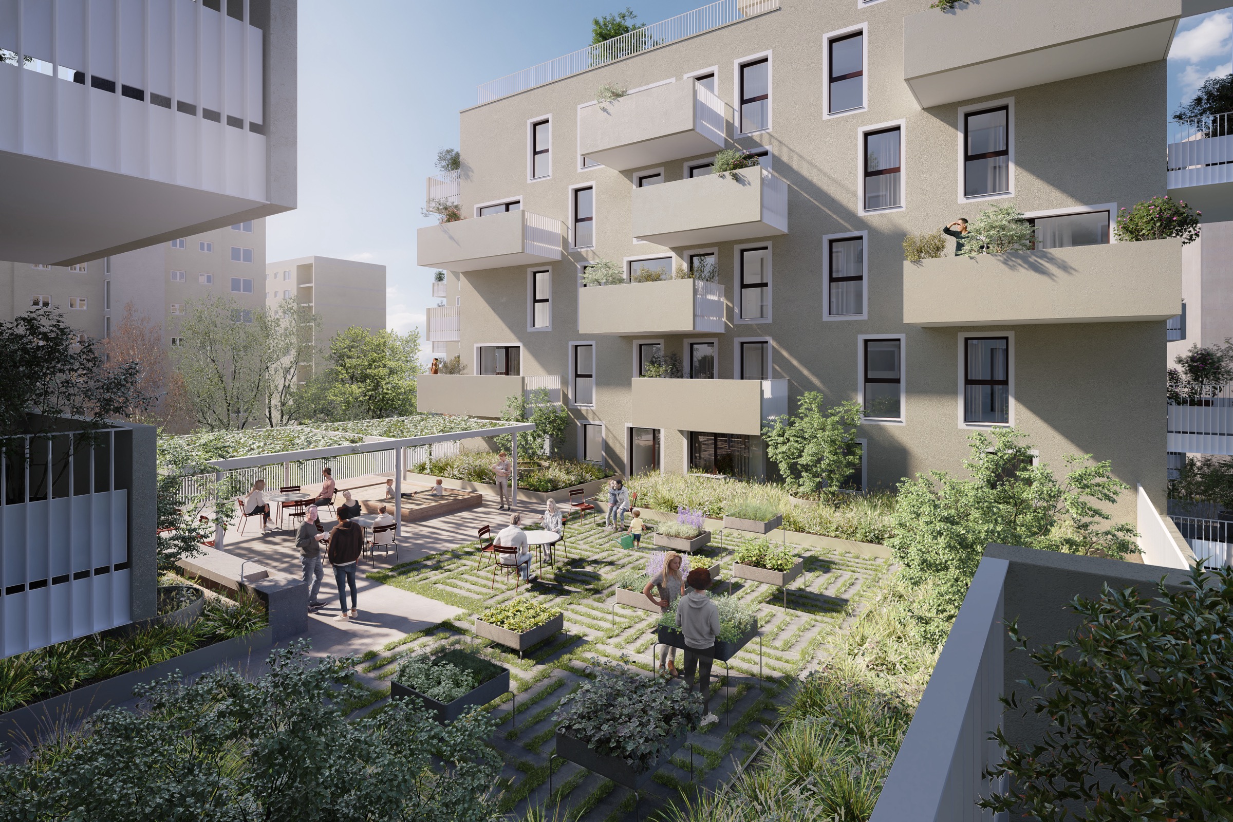 Die offene Stellung der Baukörper und der avisierte Vorplatz stellen einen Kontext zum geplanten Schrödingerplatz