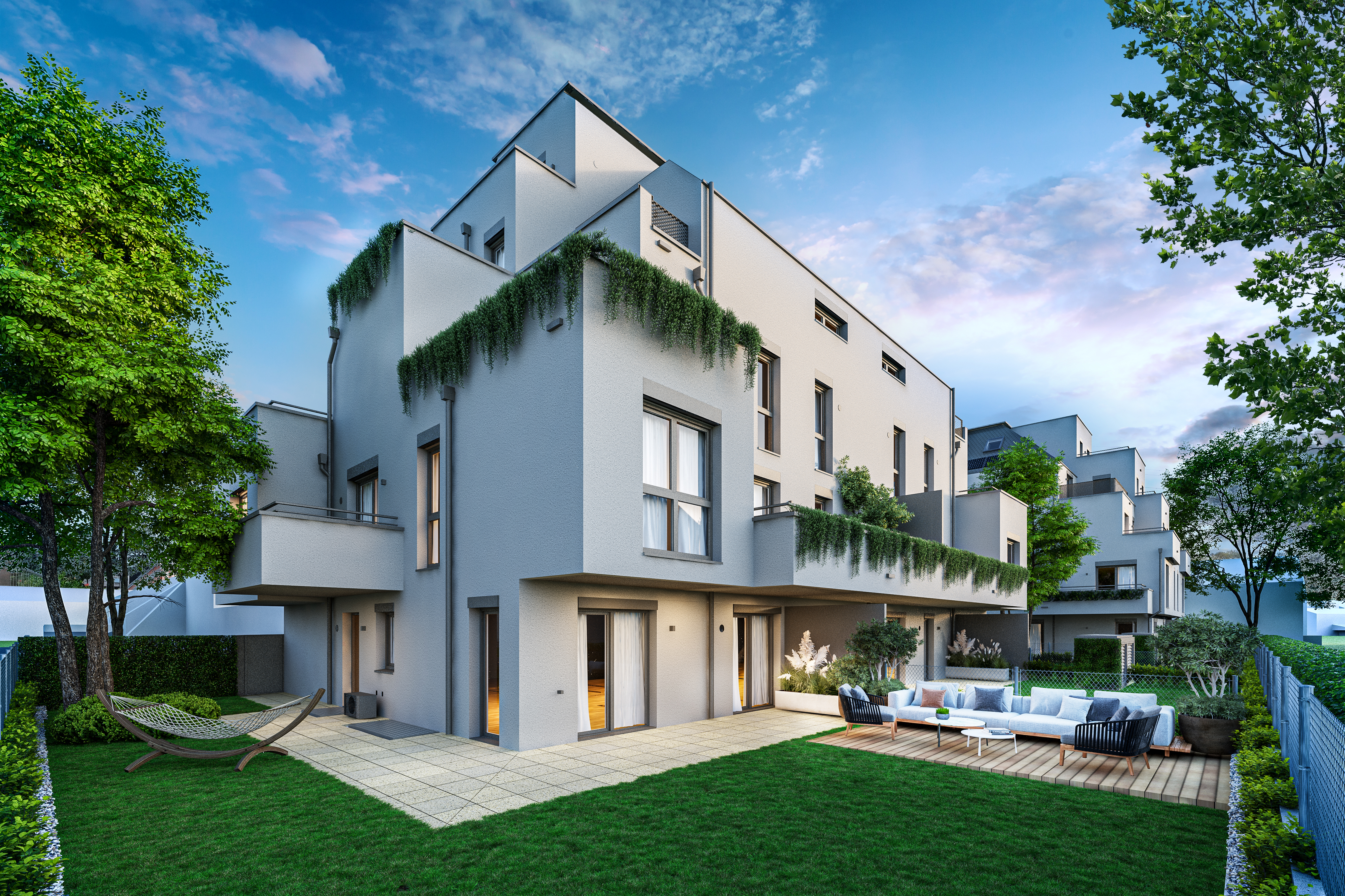 Das Projekt setzt sich aus zwei Gebäuden (Stiege 1 + Stiege 2) mit je einem Erdgeschoss, einem Obergeschoss, 3 Dachgeschossen und 1 gemeinsamen Untergeschoss mit Tiefgarage zusammen.