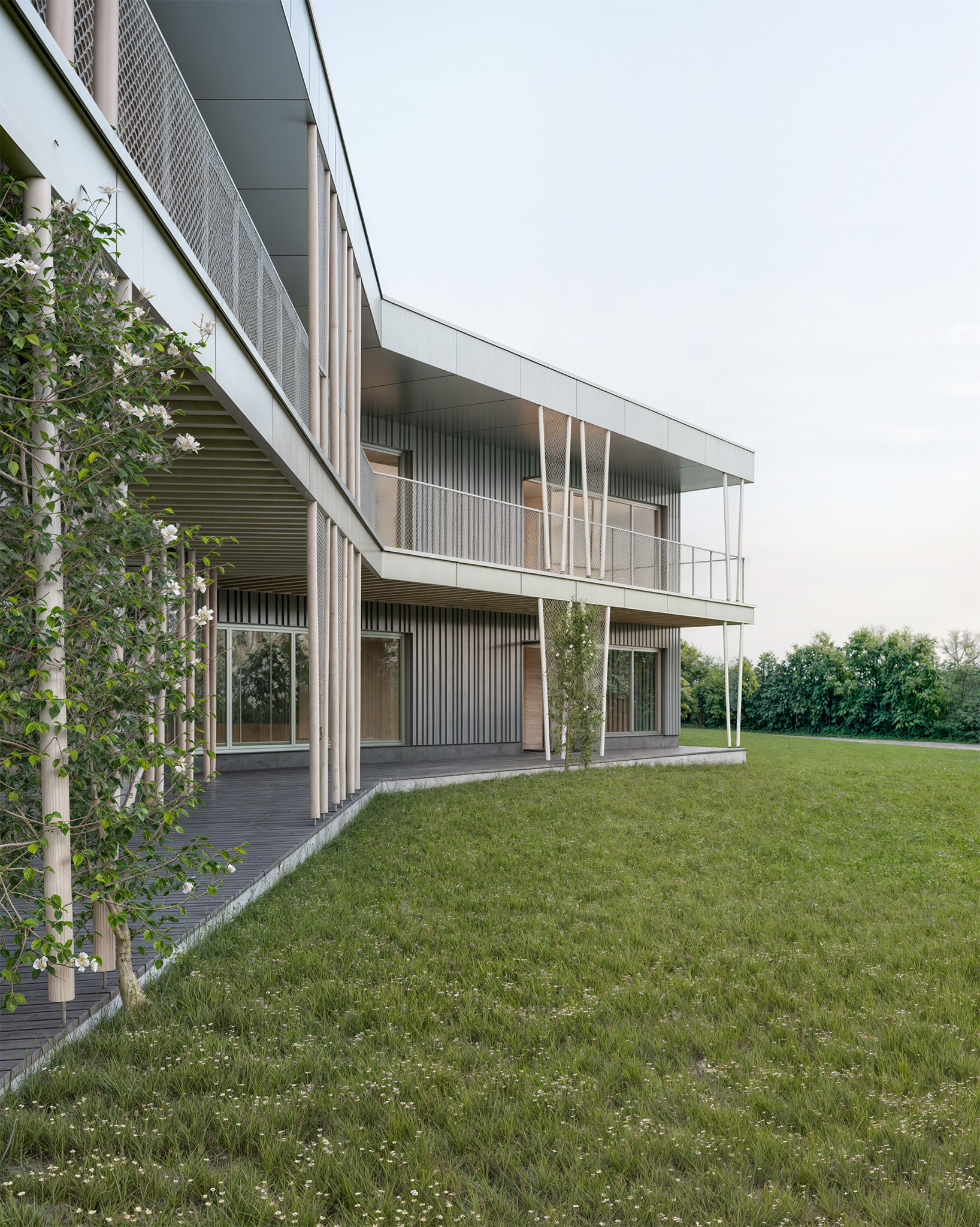 Durch großzügige Verglasungen, Terrassen und Balkone sind die Gruppenräume hell und natürlich belichtet. Das auskragende Gründach übernimmt Verschattungsfunktionen und prägt das Erscheinungsbild.