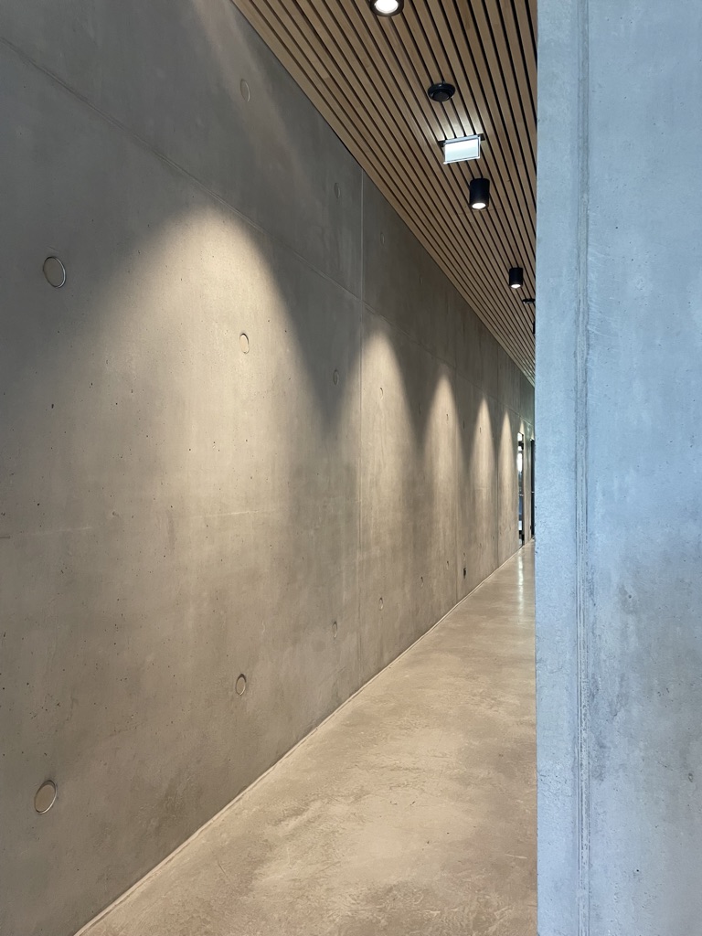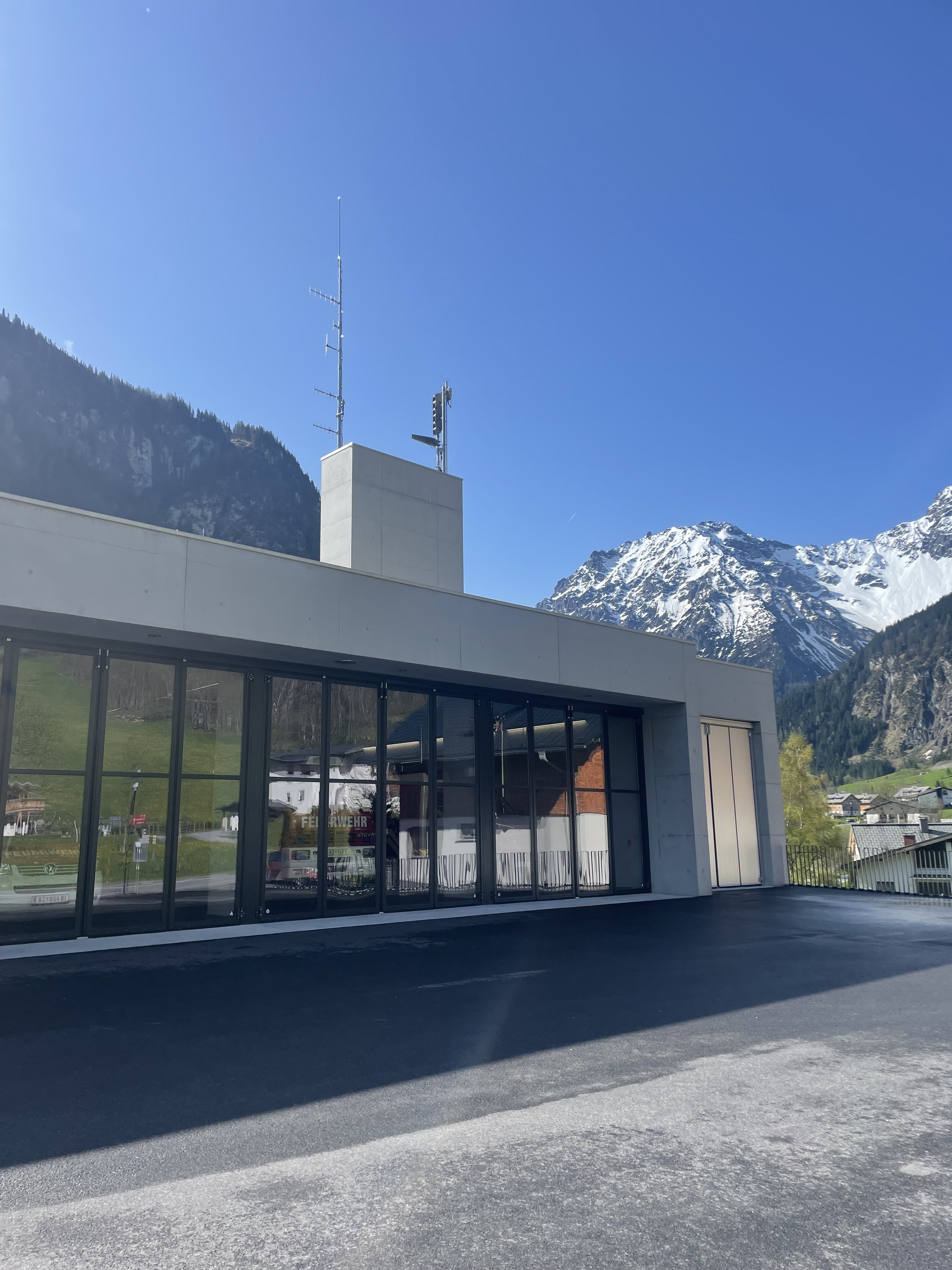 Die Bereitstellung der zur Konditionierung des Gebäudes benötigten Wärme erfolgt über eine monovalente Luft-Wasser-Wärmepumpe, die am Rand des Grundstücks aufgestellt wurde. Die Wärme wird über eine „Fernwärmeleitung“, rund einen Meter unter Grund ins Gebäude geleitet. Die Verteilung der Wärme erfolgt im Erdgeschoss und in den kleineren Räumen des Untergeschosses über die Fußbodenheizung. Im Untergeschoss werden die Garagen und die Werkstätten der Altstoffsammelstelle bei Bedarf mit Umluft-Lüfter beheizt. Die große Fläche für die Sammelstellen und die Müllentsorgung bleibt unbeheizt. Ein wichtiger Bestandteil für die Effizienz des Heizungssystems ist die klare thermische Zonierung der verschiedenen Bereiche. Durch die lokalen Gruppierungen von Räumen mit gleichen Anforderungen werden Wärmeverluste zu minderbeheizten Räumen minimiert und die thermische Hülle stark verkleinert. Zudem werden Verteilverluste reduziert, da die Wärme in denselben Bereichen benötigt wird. Die Be- und Entlüftung der Räumlichkeiten erfolgt dezentral. Dazu sind im Erdgeschoss vier Lüftungsgeräte installiert, die wie folgt zugeordnet sind: • Proberaum • Schulungsraum • Umkleiden • Feuerwehr Im Untergeschoss sowie im Garagenbereich im Erdgeschoß gibt es jeweils zwei Abluft-Ventilatoren, welche die nachgeströmte Außenluft abtransportieren. Aufgrund der dezentralen Verteilung werden nahezu keine Volumenstromregler benötigt. Die Einbringung der Zuluft bzw. die Absaugung der Abluft erfolgt angepasst an den jeweiligen Raum. Beispielsweise werden in den Aufenthaltsräumen architektonisch unauffällige Schlitzauslässe verwendet, im Gangbereich dagegen Tellerventile. Auch wird die Luft im Umkleideraum der Feuerwehr mit Quellluftauslass eingebracht und in jedem Spind einzeln abgeführt. Kaskadenlüftung kommt bedingt durch die unterschiedlichen Nutzungen nur in sehr begrenztem Maß zum Einsatz. Die Photovoltaikanlage des alten Gebäudes wurde abgebaut und auf dem Dach des neuen Mehrzweckhauses positioniert. Zusätzlich wurde die Anlage um 15 kWpeak auf eine summierte Leistung von 30 kWpeak vergrößert. Die Anlagen-Simulation hat eine erneuerbare Strom-Erzeugung von rund 35.000 kWh/a ergeben. Ein Teil des nicht im Mehrzweckhaus benötigten Stroms wird unter anderem auch im in der Nähe gelegenen Kindergarten genutzt.