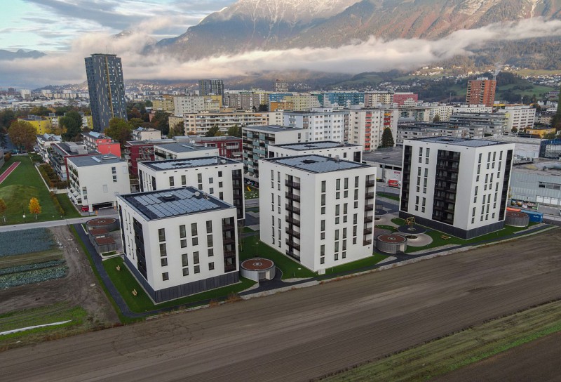 Österreichs größtes Passivhaus PLUS-Wohnquartier mit zukunftsweisender, höchst energieeffizienter Bauweise und maximaler Einbindung erneuerbarer Energien an den Gebäuden samt umweltfreundlichen Batteriespeichern konnte in Rum bei Innsbruck errichtet werden. Fünf rechteckige Baukörper mit in Summe 134 Wohnungen wurden gleichmäßig über das Grundstück verteilt und in der Höhe, von Norden nach Süden gestaffelt.