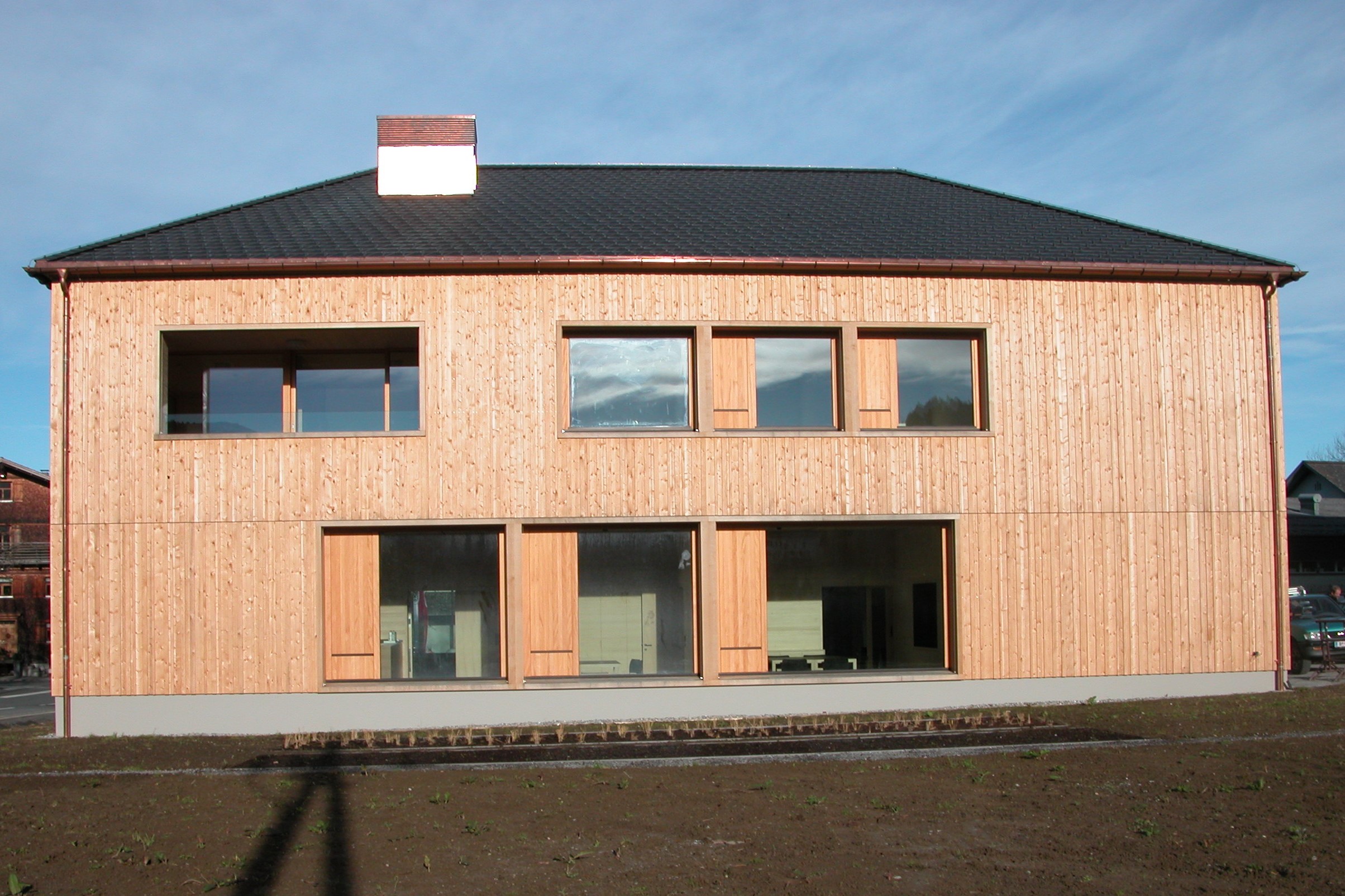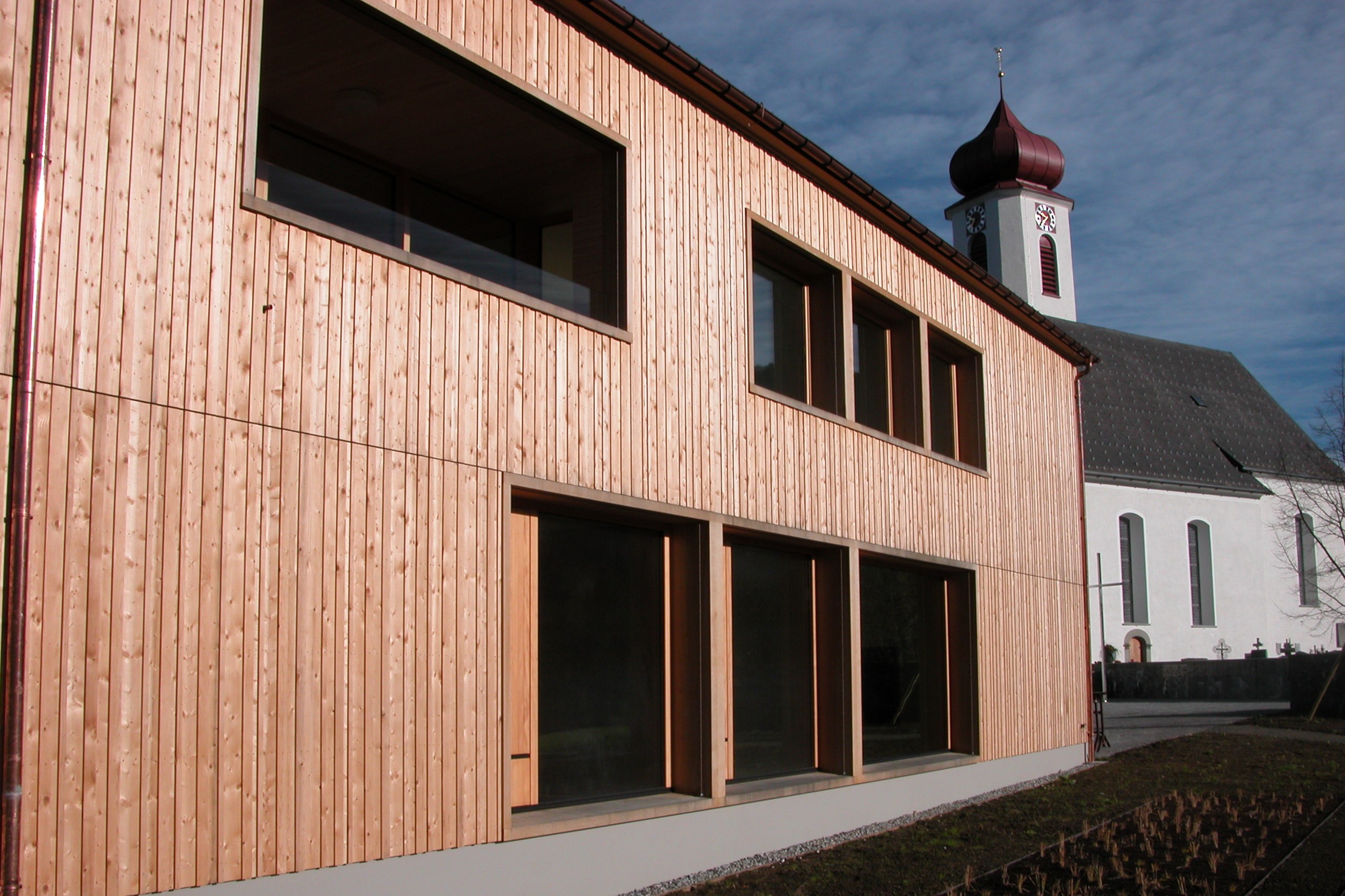 Der Neubau des Pfarrhauses Krumbach im Bregenzerwald wurde ab der Kellerdecke als reiner Holzbau ausgeführt, gebaut mit Holz aus den Gemeinde-eigenen Wäldern. Holz als lokaler und traditioneller Werkstoff kommt auch im Innenausbau weitestgehend zum Einsatz, Wand- und Deckenverkleidungen sind in heimischer Weißtanne ausgeführt, die Böden in massiven Eichendielen. Mit sehr hoher Energieeffizienz erreicht das Gebäude nahezu Passivhausstandard, der geringe Wärmebedarf wird durch die kommunale Hackschnitzelanlage gedeckt.