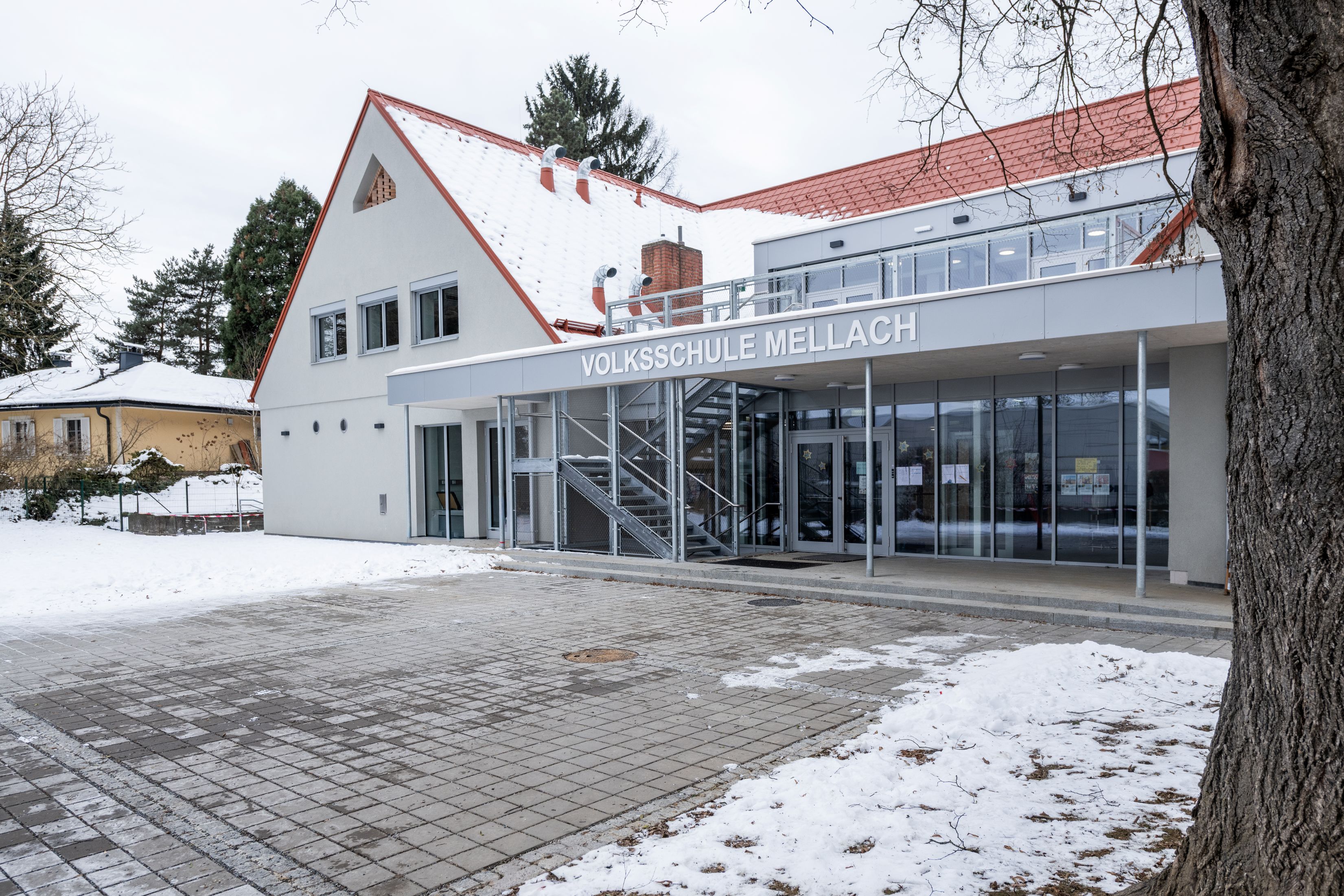 Das Gebäude der Volksschule Mellach aus dem Jahr 1982 wird generalsaniert. Beim gegenständigen Umbau bzw. Zubau und Sanierung wurde auf den bestehenden Baumbestand Rücksicht genommen. Der Zugang in die Volksschule erfolgt über eine neue Rampe aus Naturstein. Die großen schattenbildenden Bäume bleiben erhalten. Der großzügige Gartenfreiraum an der Westseite wird über direkte Zugänge aus der GTS verstärkt genutzt und mittels neuen vorgelagerten Terrassen attraktiviert. Ergänzend wird über dem Garderobenzubau im Erdgeschoss eine darüberliegende neue Freiraumklasse installiert.