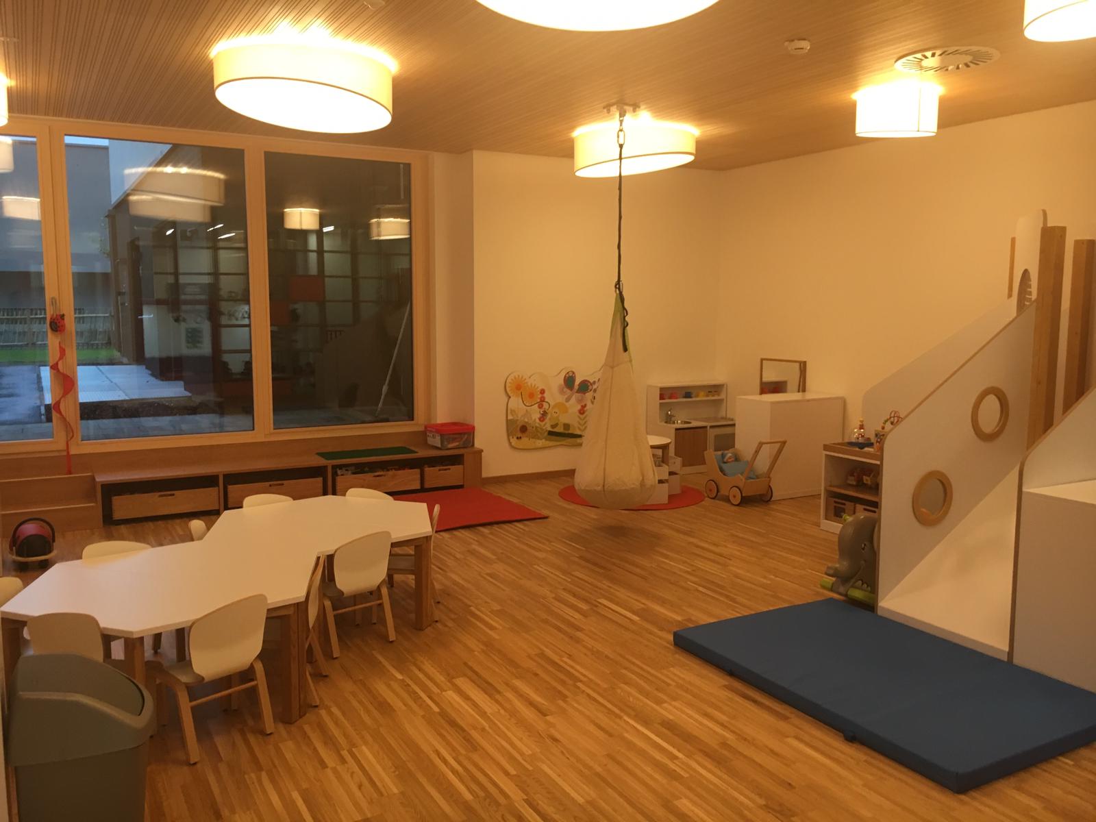 Der Kindergarten wird gemeinsam mit einem Wohngebäude mit 25 Wohneinheiten errichtet. Die Wohnungen sind über ein separates Treppenhaus vom Norden erschlossen. Der Kindergarten ist Ebenerdig von Süden erschlossen.