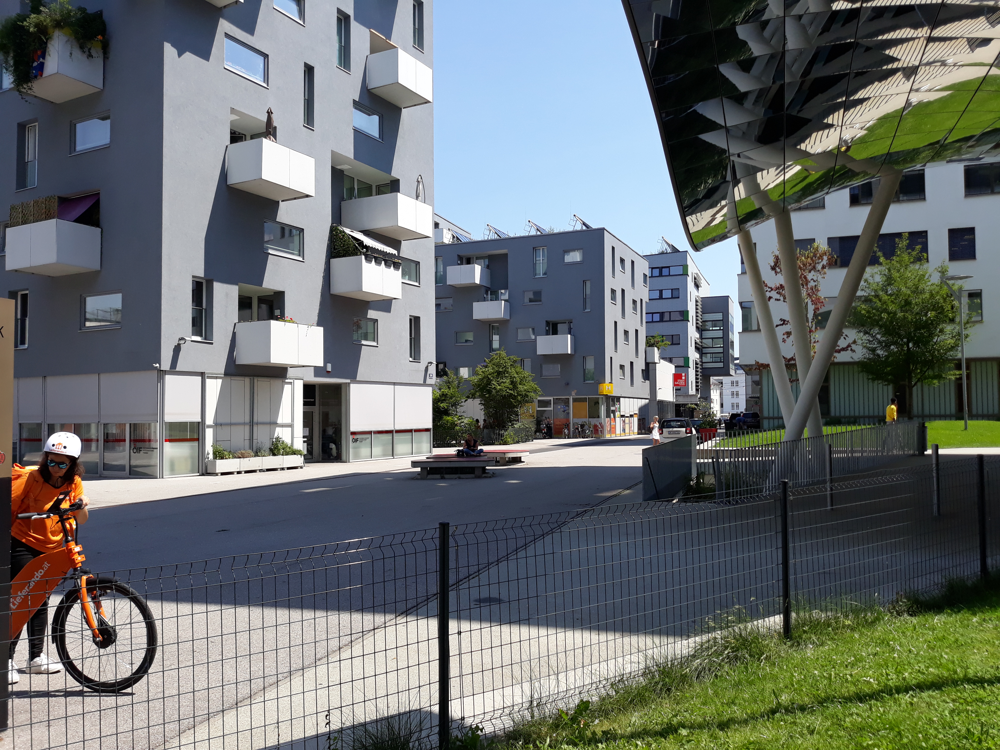 wurden im nördlichen Bereich des Projektegebietes 287 geförderte Mietwohnungen, ein Kindergarten, ein Studentenheim und im südlichen Bereich des Projektgebietes ein Nahversorger, Büros sowie Labors und andere gewerbliche Räumlichkeiten errichtet. Kernstück ist die Sockelzone entlang der öffentlichen Durchwegung, dem so genannten