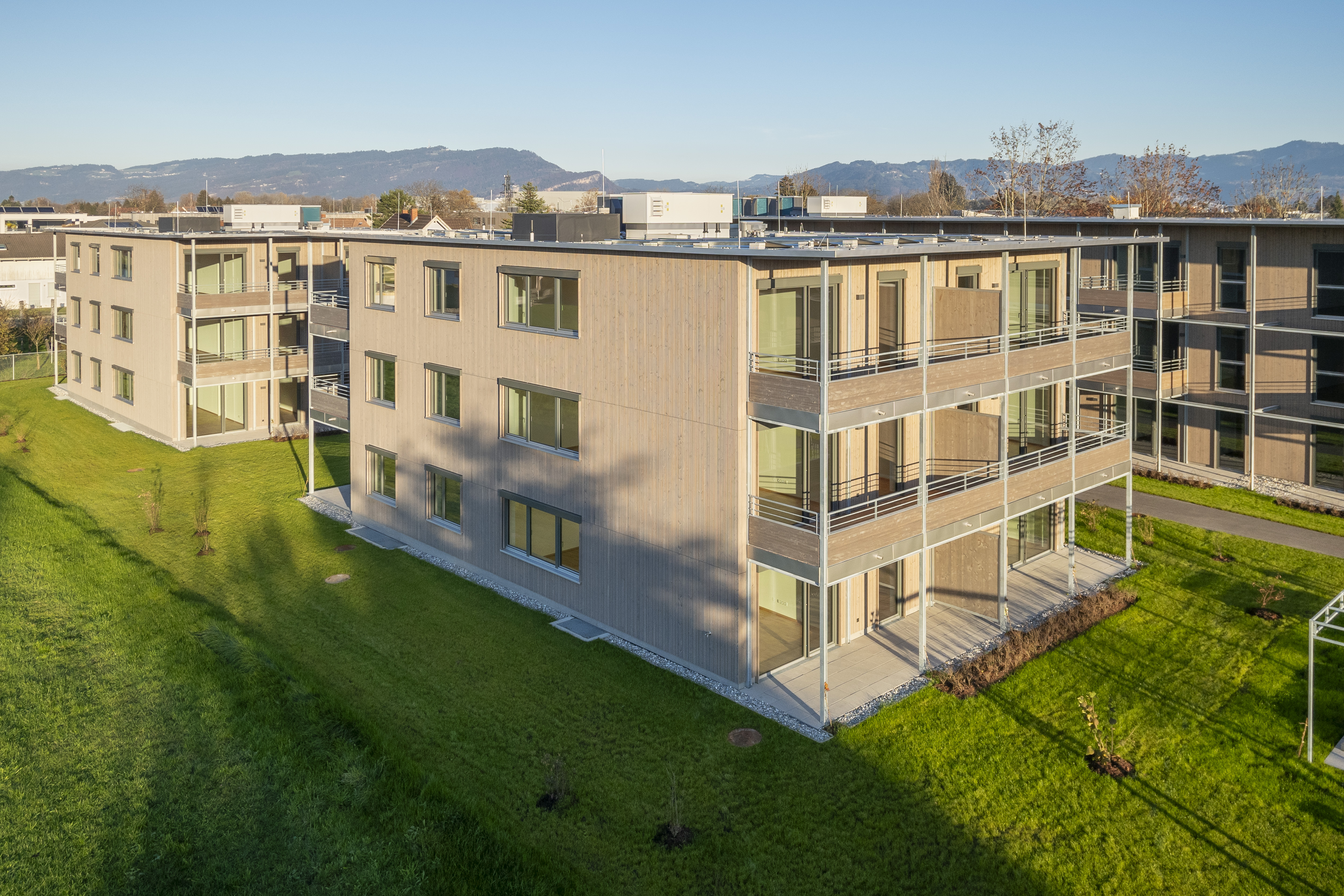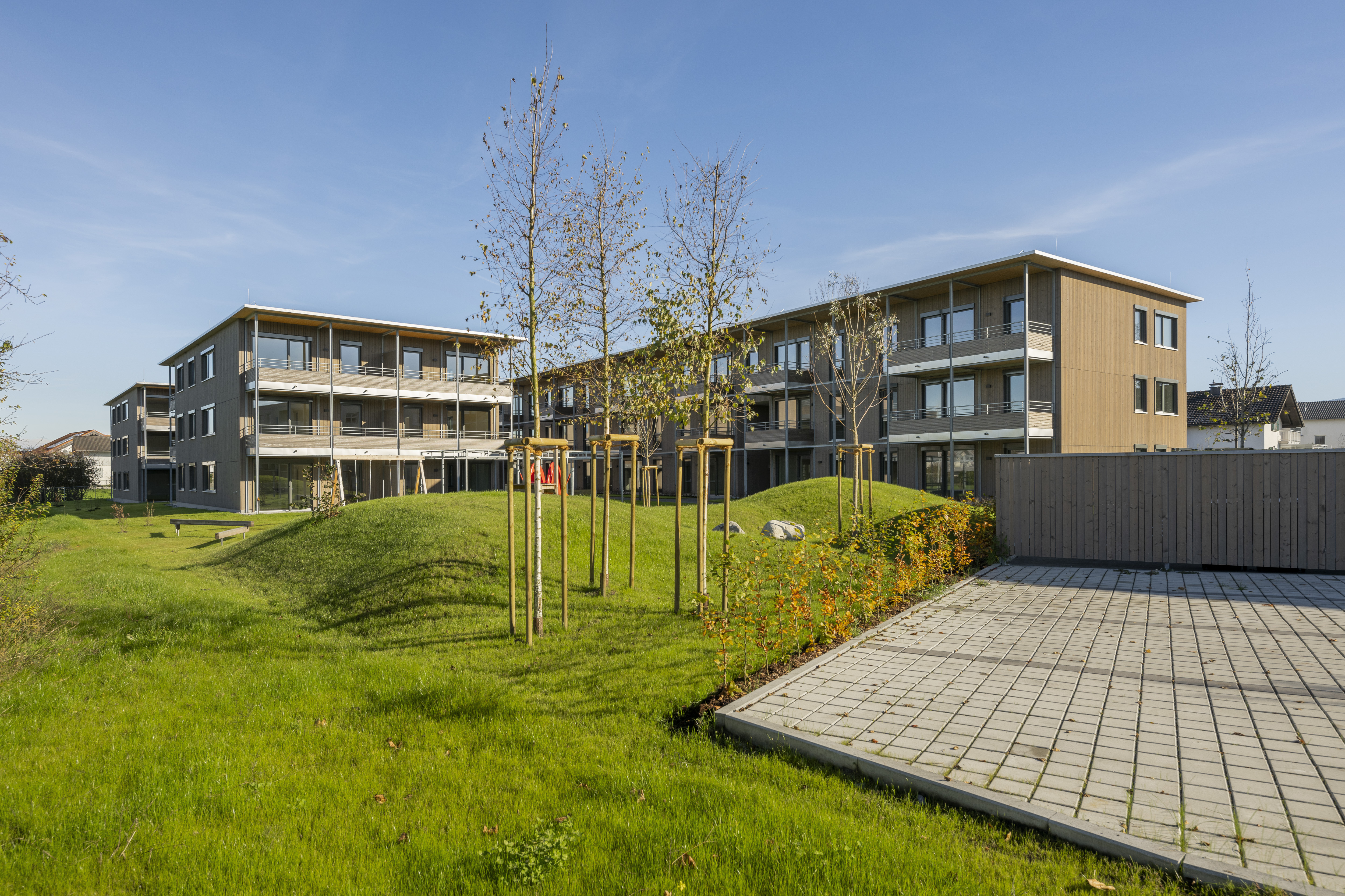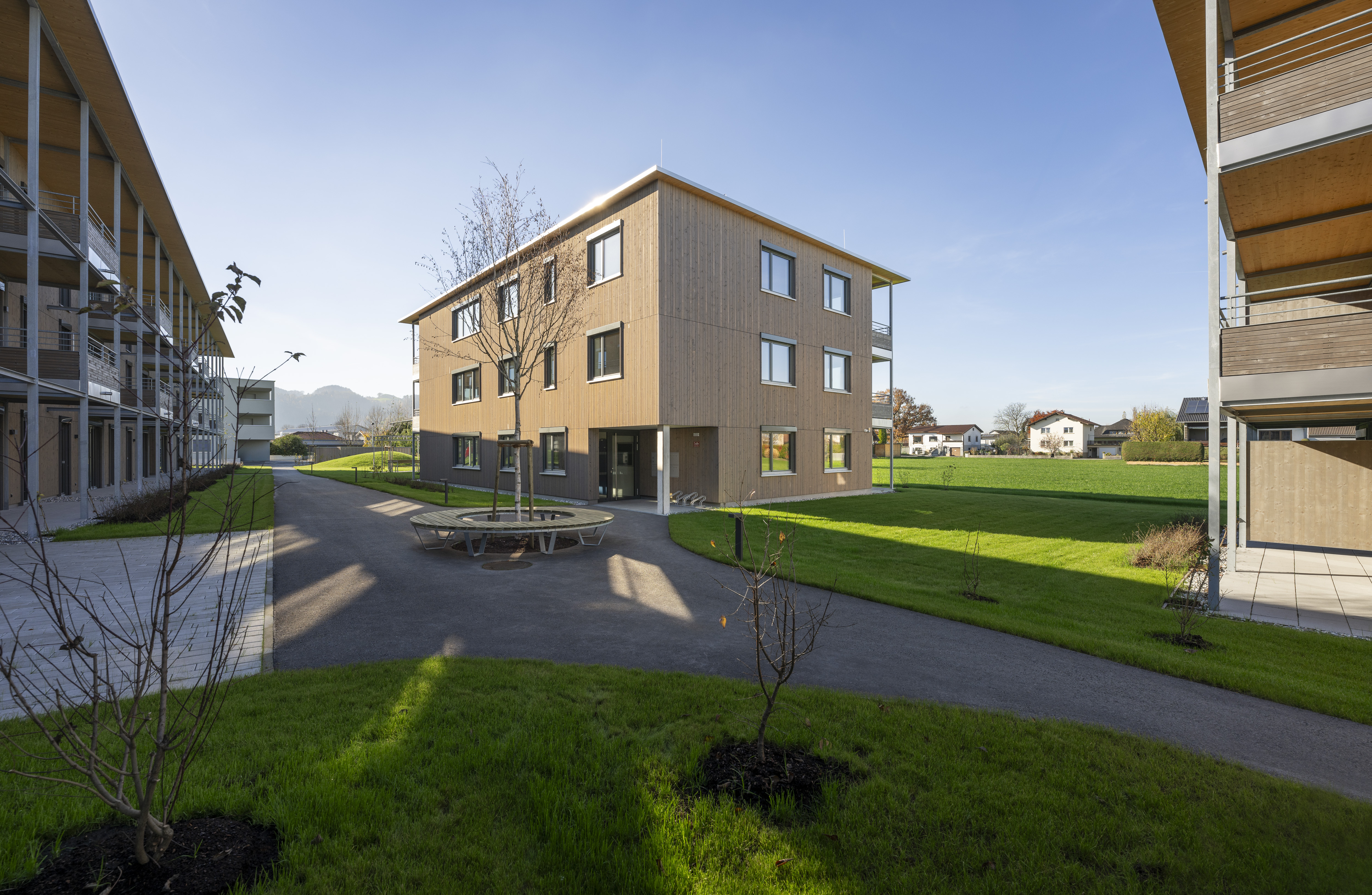 Die Wohnanlage verfügt je Haus über ein Erdgeschoss und zwei Obergeschoße. Die Ausführung des Baukörpers erfolgt als Holzbau. Die Flachdächer sind bekiest, die Fassaden werden als hinterlüftete Holzfassaden ausgeführt.