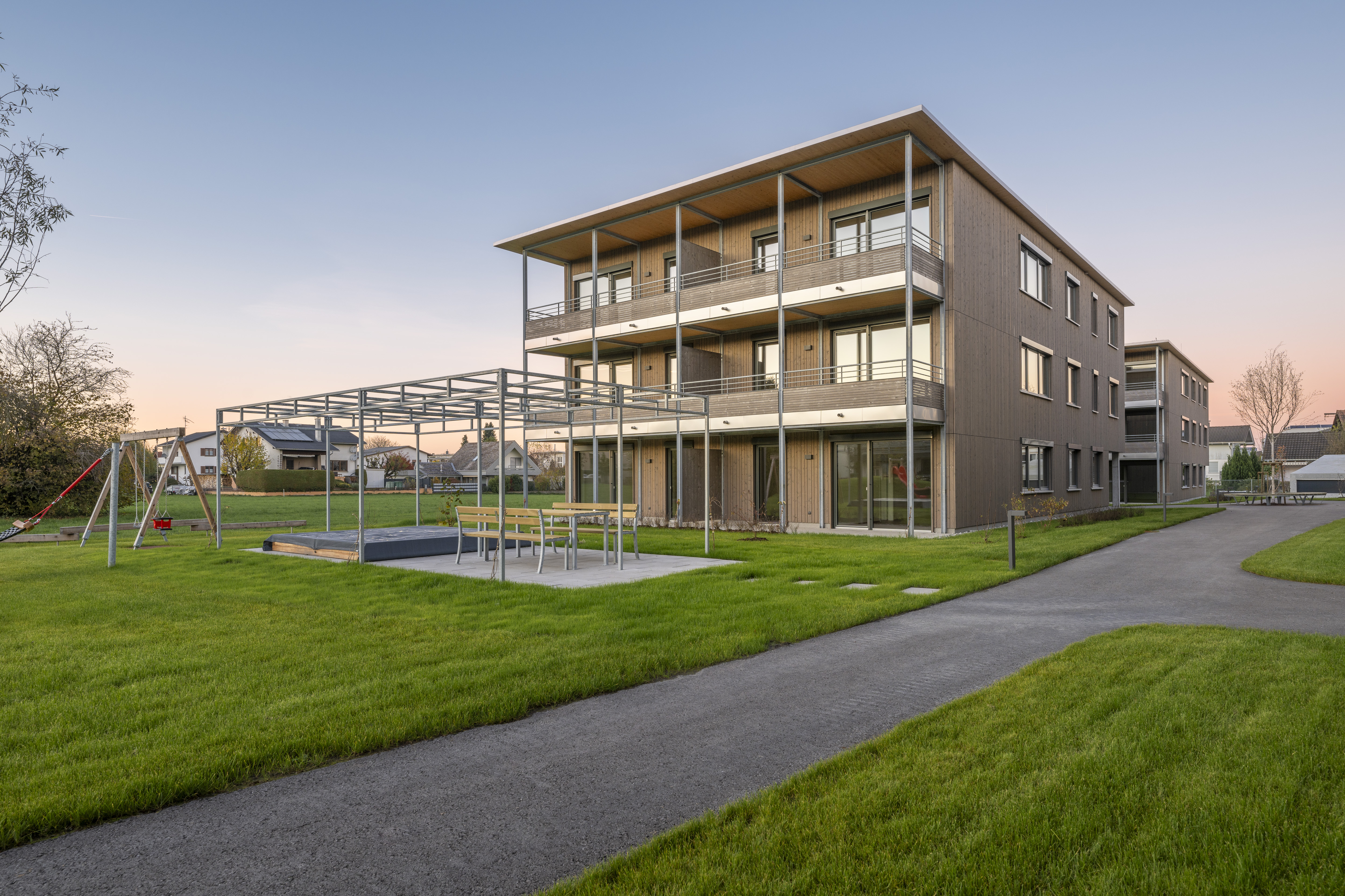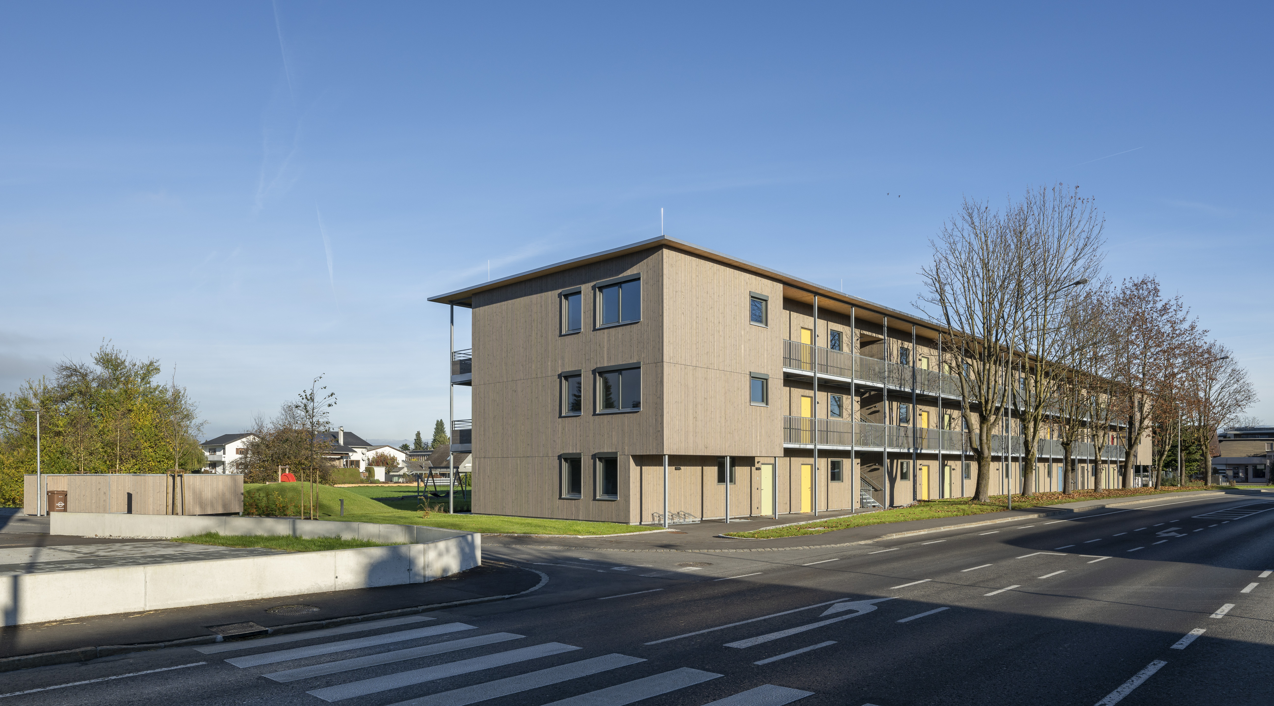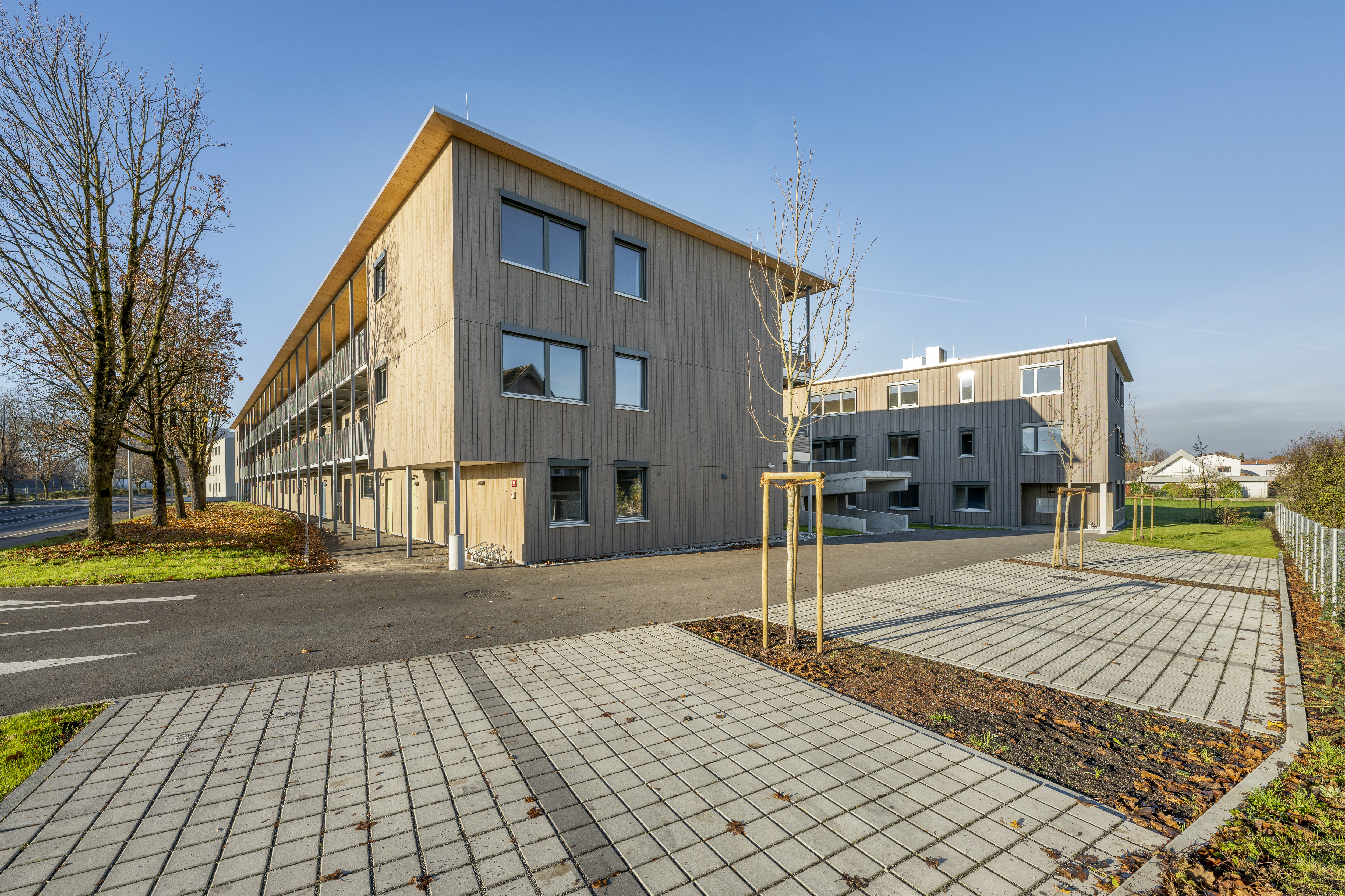 Die Wohnanlage verfügt je Haus über ein Erdgeschoss und zwei Obergeschoße. Die Ausführung des Baukörpers erfolgt als Holzbau. Die Flachdächer sind bekiest, die Fassaden werden als hinterlüftete Holzfassaden ausgeführt.