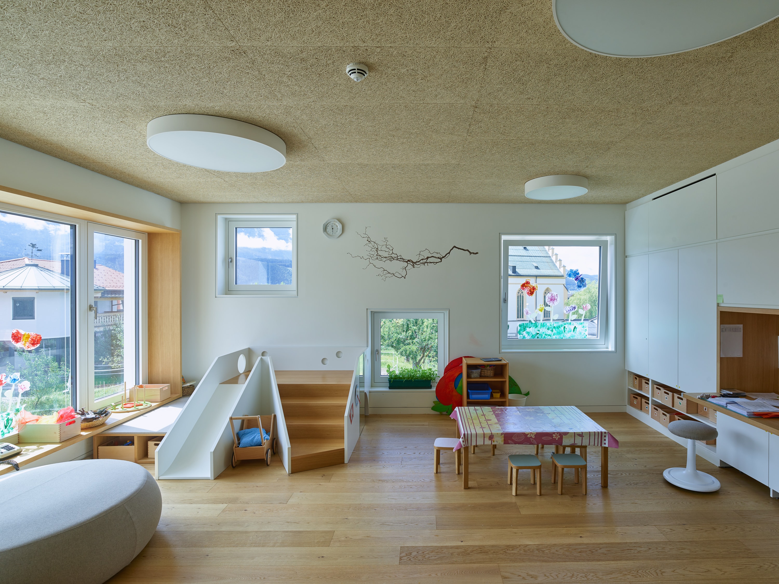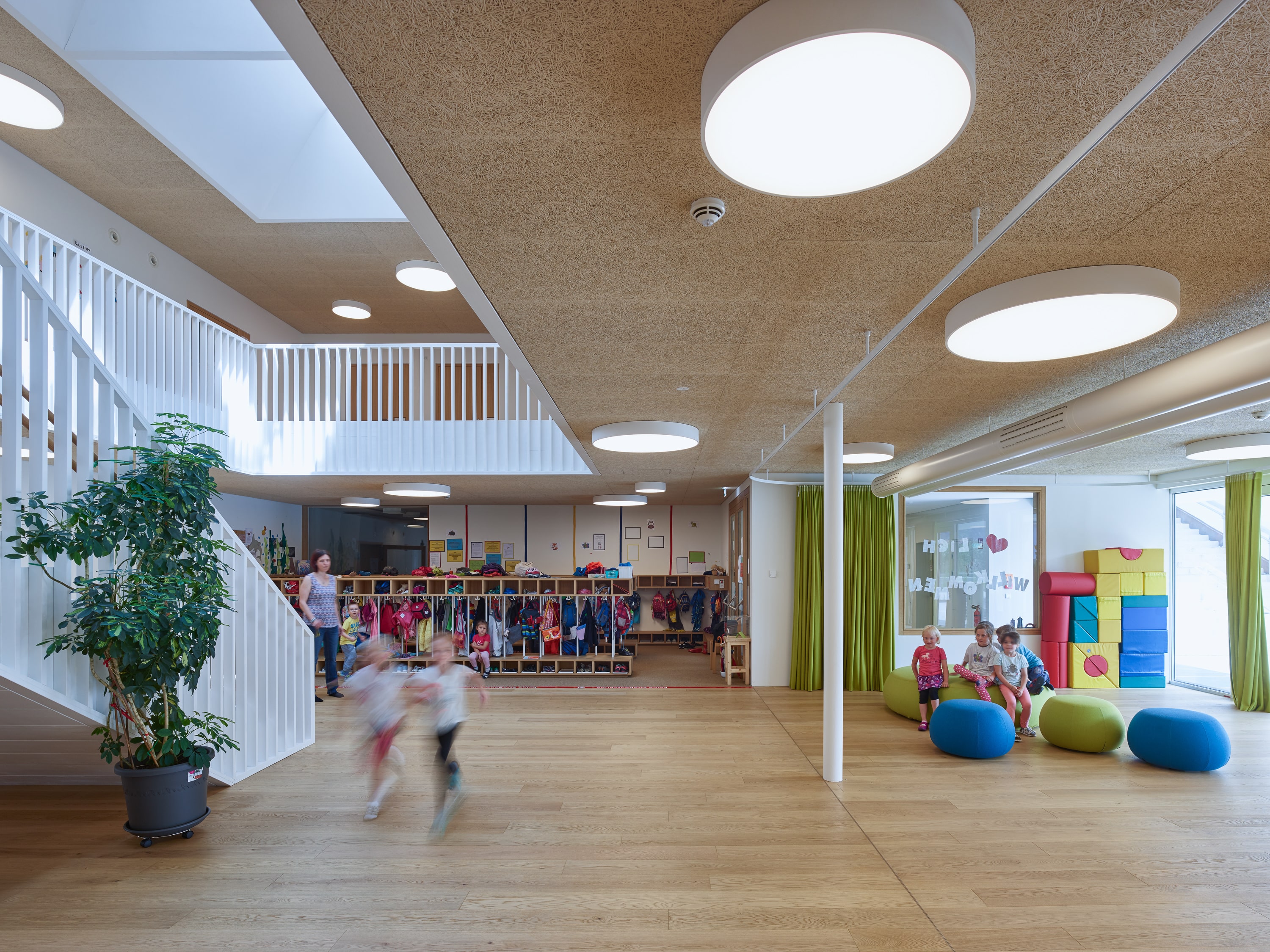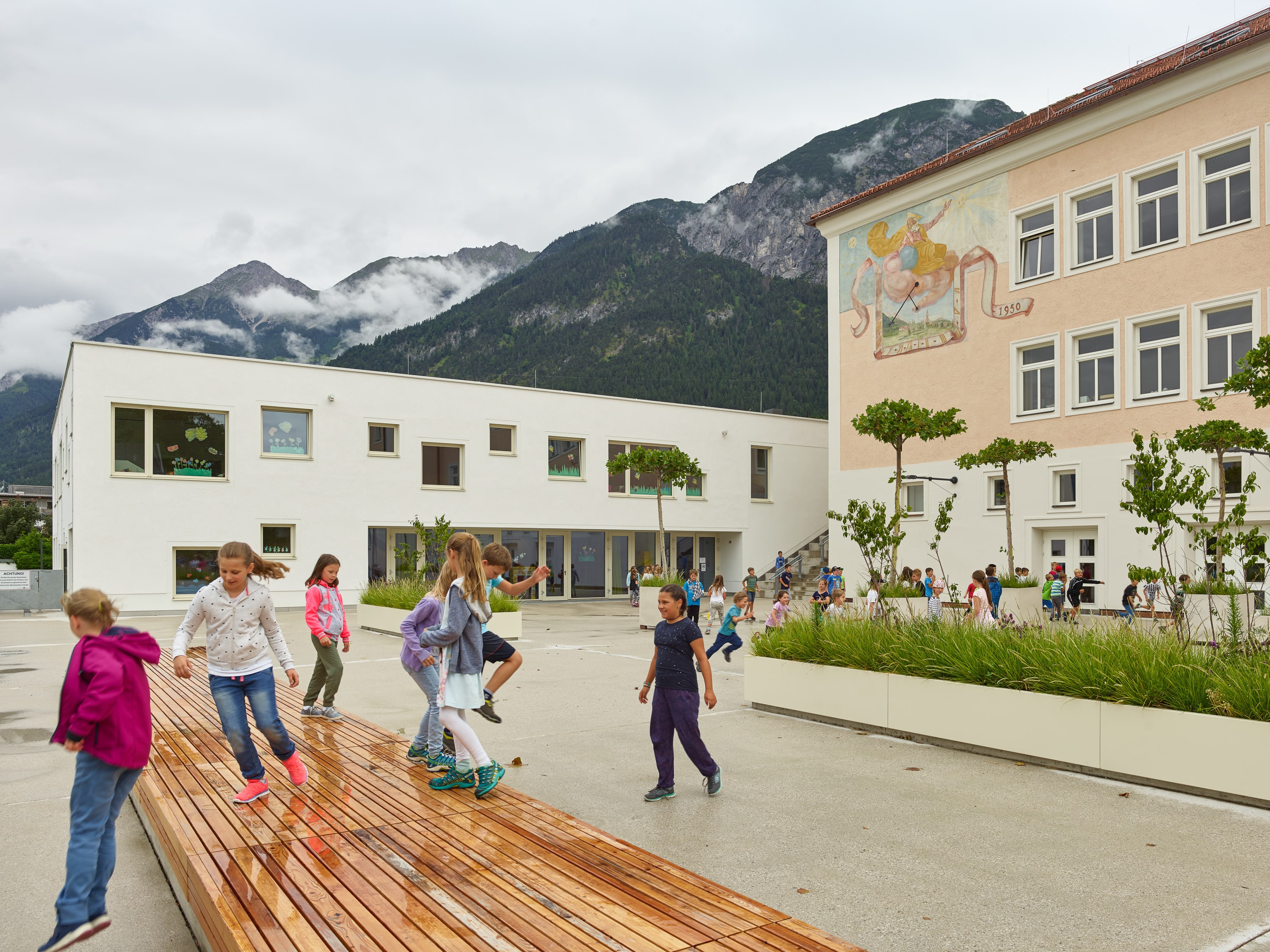 Ergänzend zur denkmalgeschützten Volksschule, sollten ein Kindergarten und eine Sporthalle für die sportaffine Gemeinde, die schon mehrere Olympiasieger hervorgebracht hat, entstehen. Alt und Neu wurden verwoben, die Sporthalle in den Untergrund gesenkt und über einen Kletterschacht mit dem Kindergarten verbunden. Dieser wurde als zweigeschossiger Holzleichtbau mit ortsüblicher Putzfassade errichtet, der als höchst energieeffizientes Gebäude mit Lüftungsanlage alle Komfortkriterien eines zeitgemäßen Bildungsbaus erfüllt. Auf dem Sporthallendach ist im Ortzentrum nun ein neuer Freiraum entstanden, der als Schulhof und gleichzeitig als Dorfplatz genutzt wird.