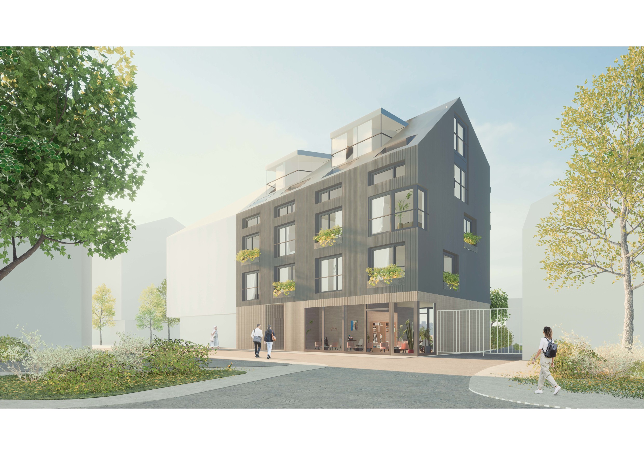 Im Erdgeschoss befindet sich eine Gewerbefläche sowie die Nebenräumlichkeiten (Fahrradabstell- und Müllraum) der darüberliegenden Wohnnutzung. Die Wohnungen in den Obergeschossen sind als Dreispänner mit zwei durchgesteckten und einer hofseitig orientierten Wohnung angeordnet. Im Dachgeschoss liegen drei Wohnungen, die ebenfalls die gleiche Orientierung aufweisen. Diese erhalten zusätzlich eine Galerie um den Dachraum optimal zu Nutzen. Durch die zentrale Lage und ca.